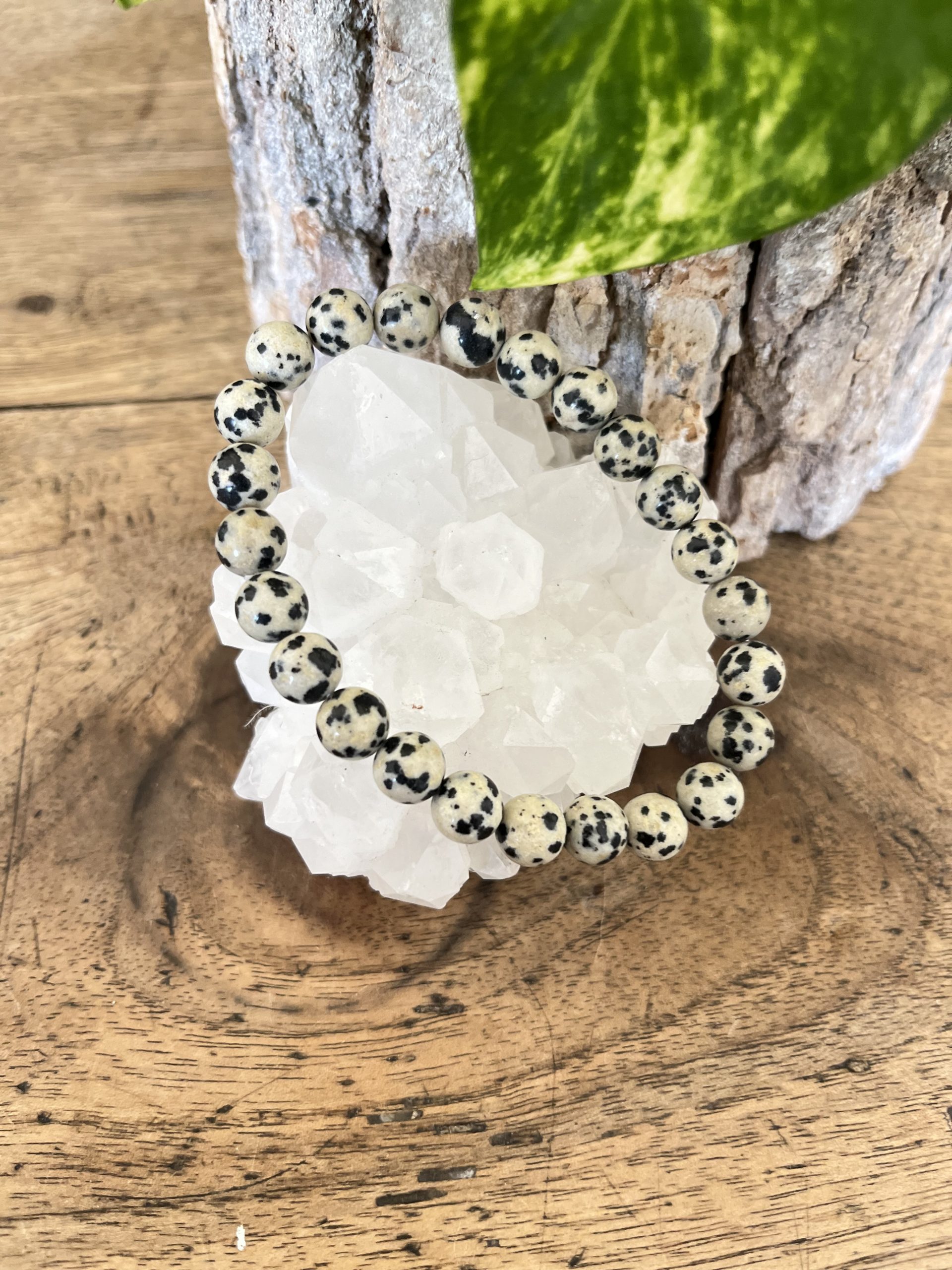 Bracelets fabriqués par plume étoilée avec des pierres naturelles de jaspe dalmatien de 8 mm.