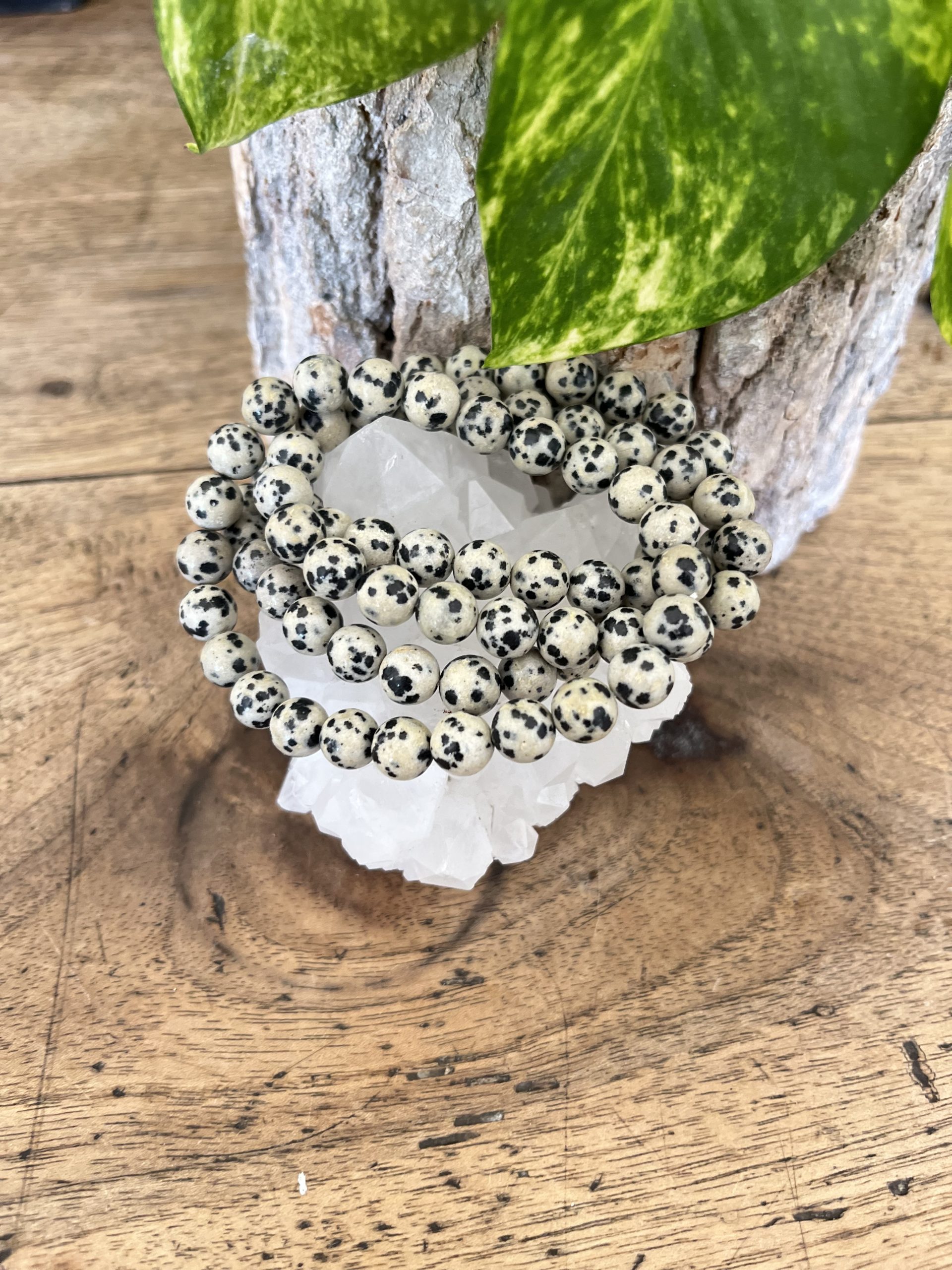 Le jaspe dalmatien (ou jaspe dalmatin) est une pierre naturelle facilement reconnaissable grâce à son fond beige ou crème parsemé de taches noires, rappelant le pelage du chien dalmatien. Elle est souvent utilisée en lithothérapie pour ses vertus énergétiques, psychologiques et spirituelles.