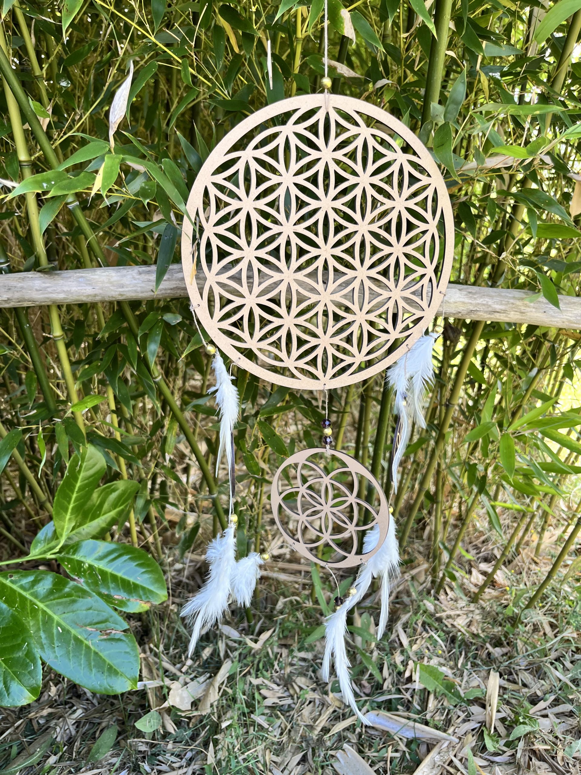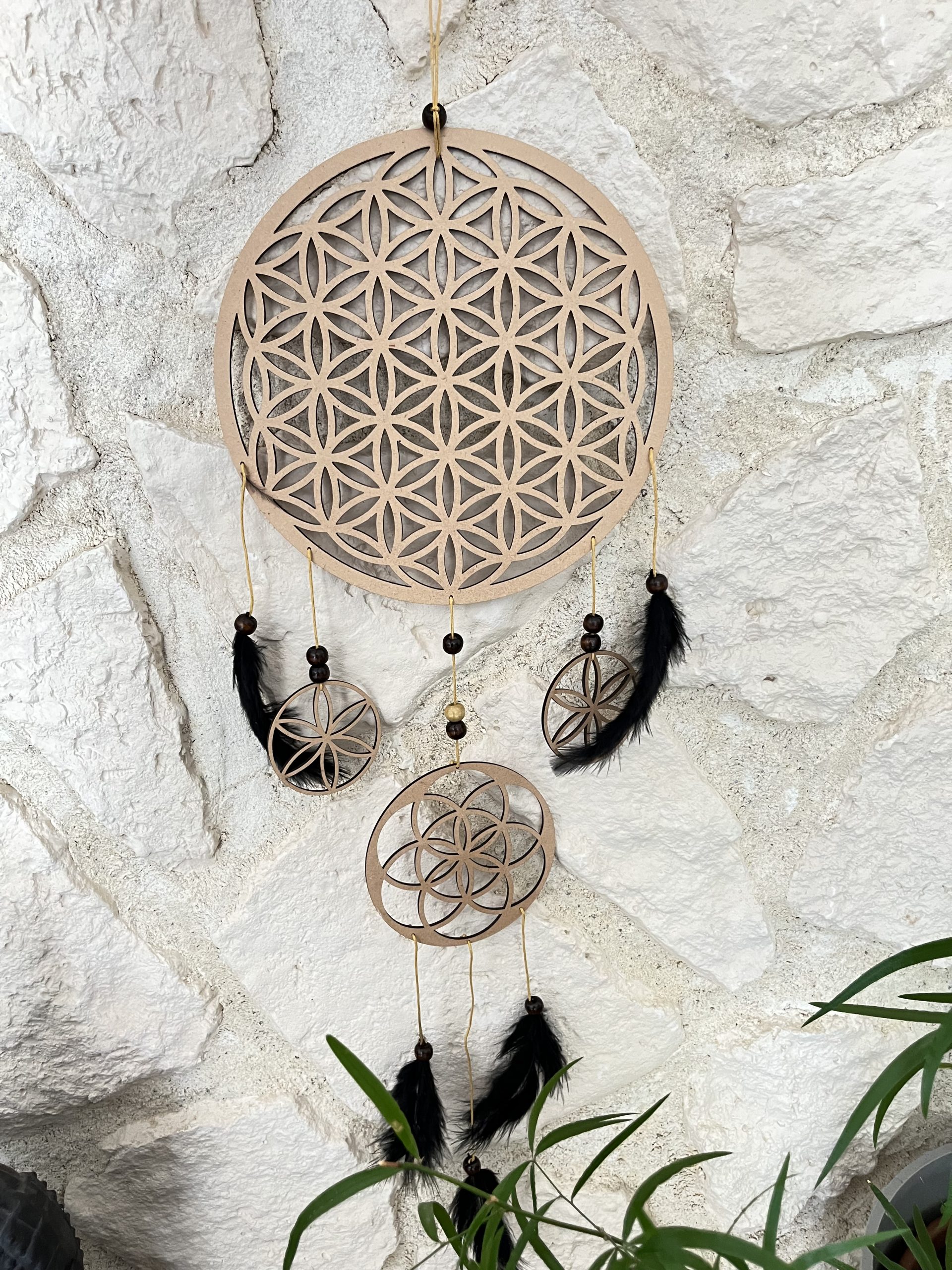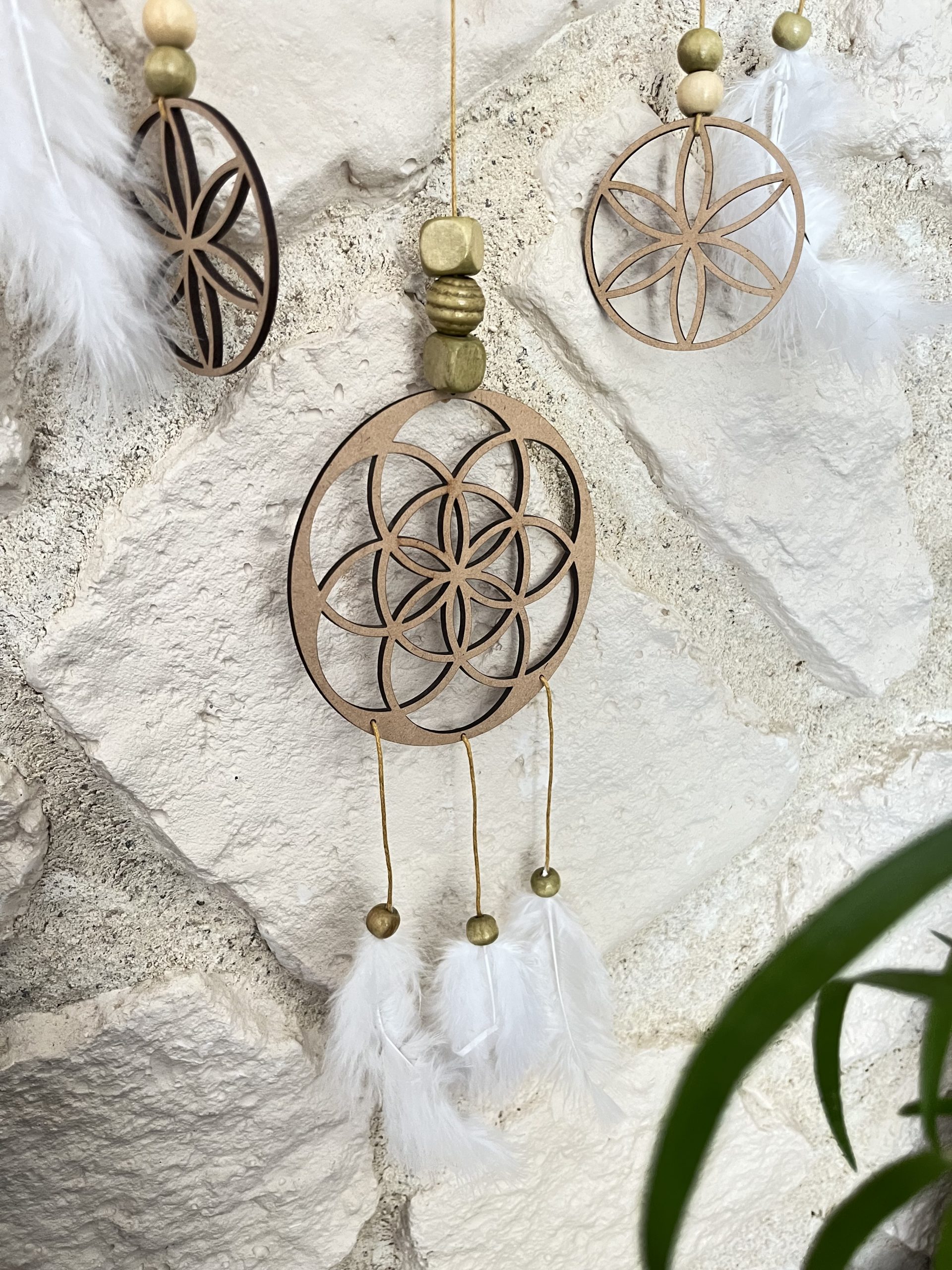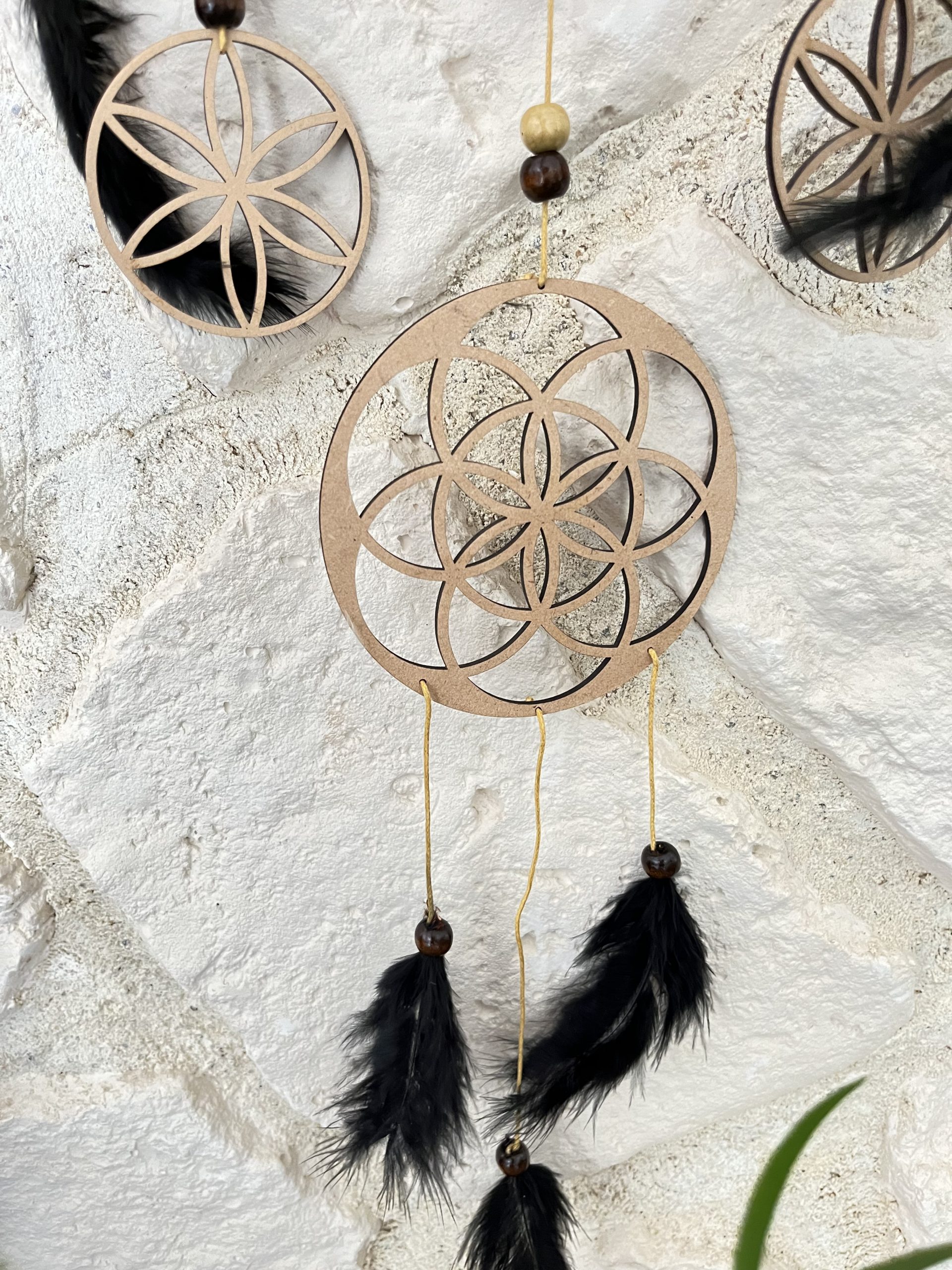 Attrape-rêves en MDF découpé au laser avec motif Fleur de Vie et décoré de plumes blanches ou noires et de perles en bois.