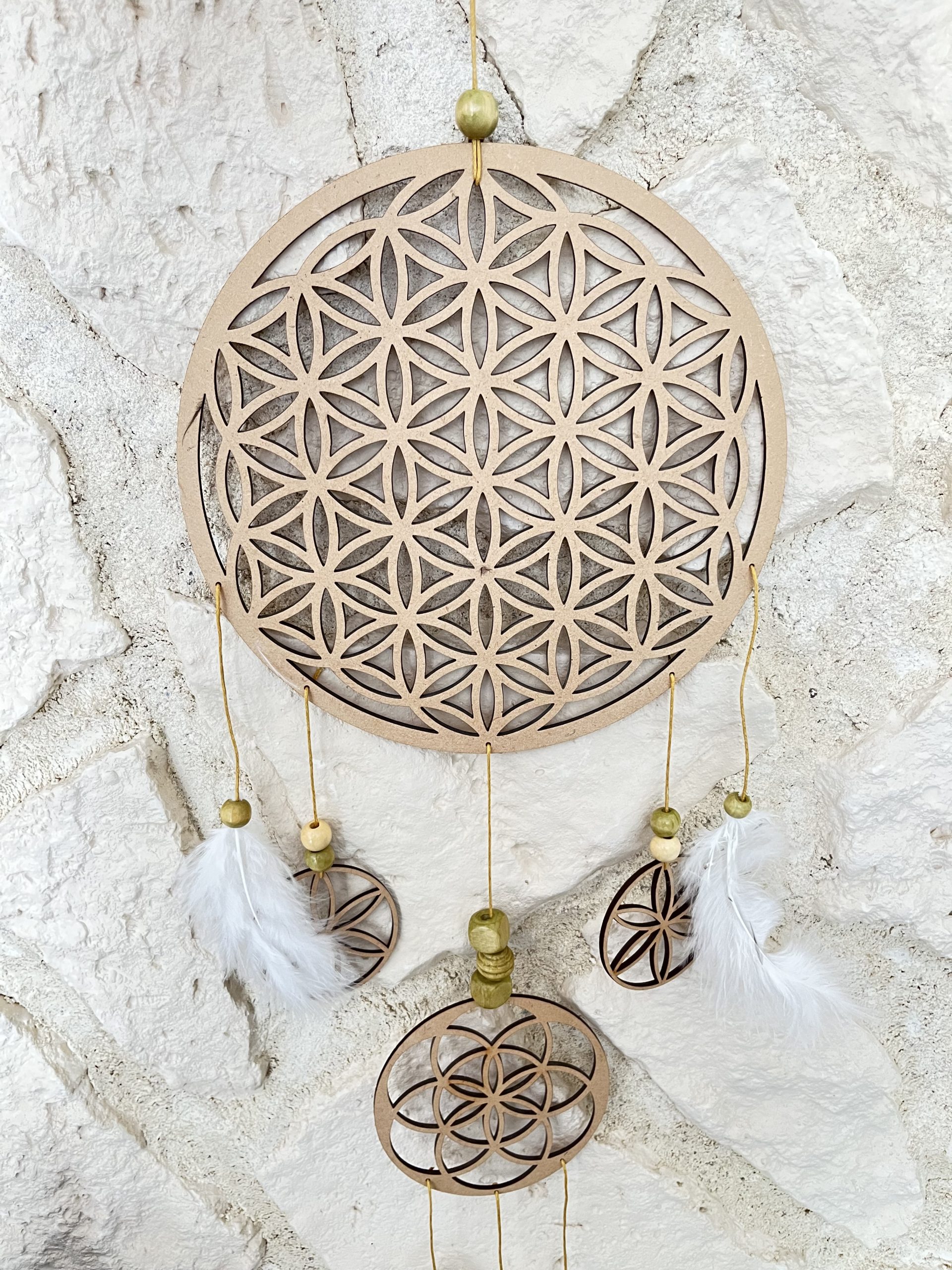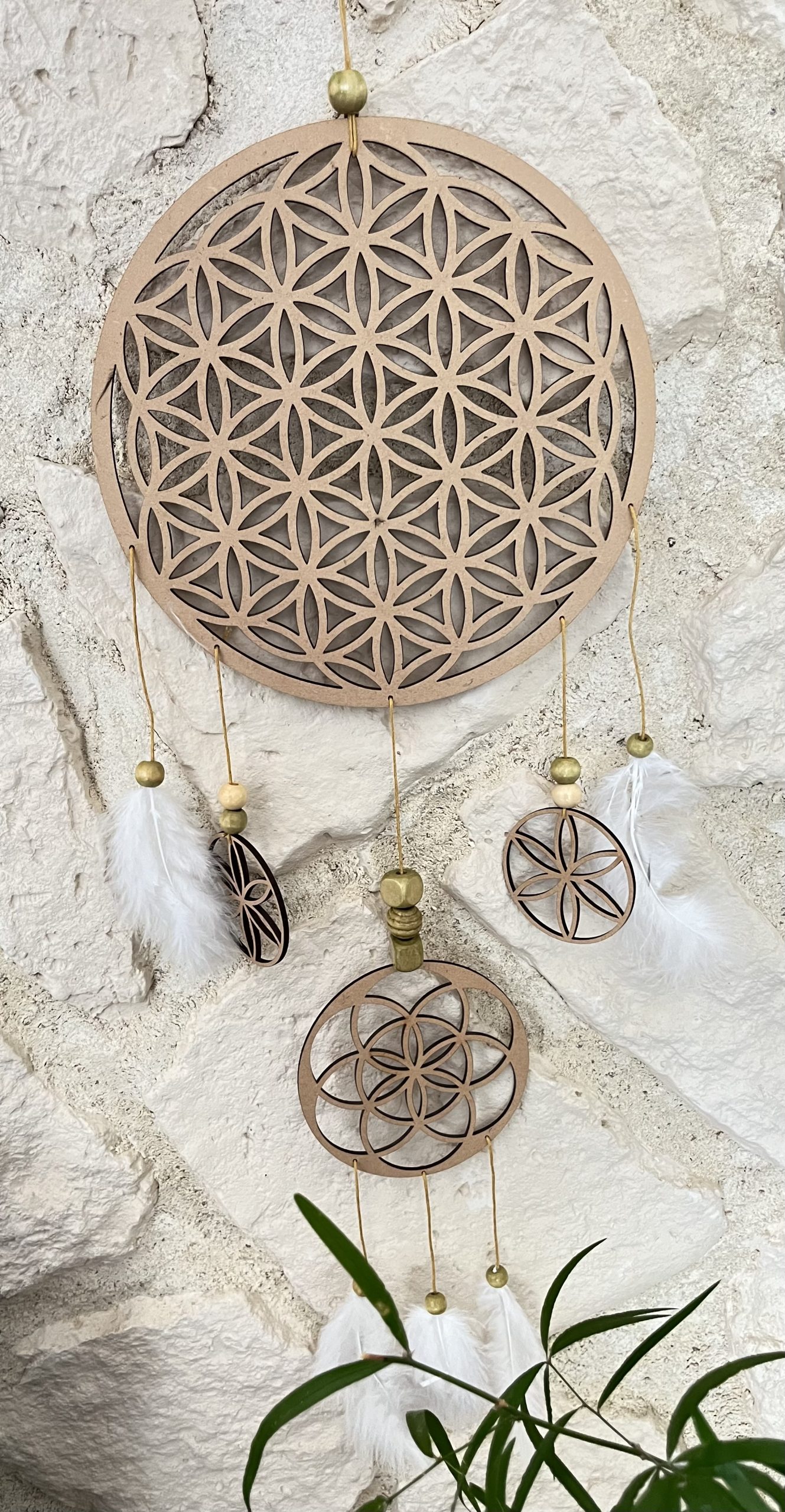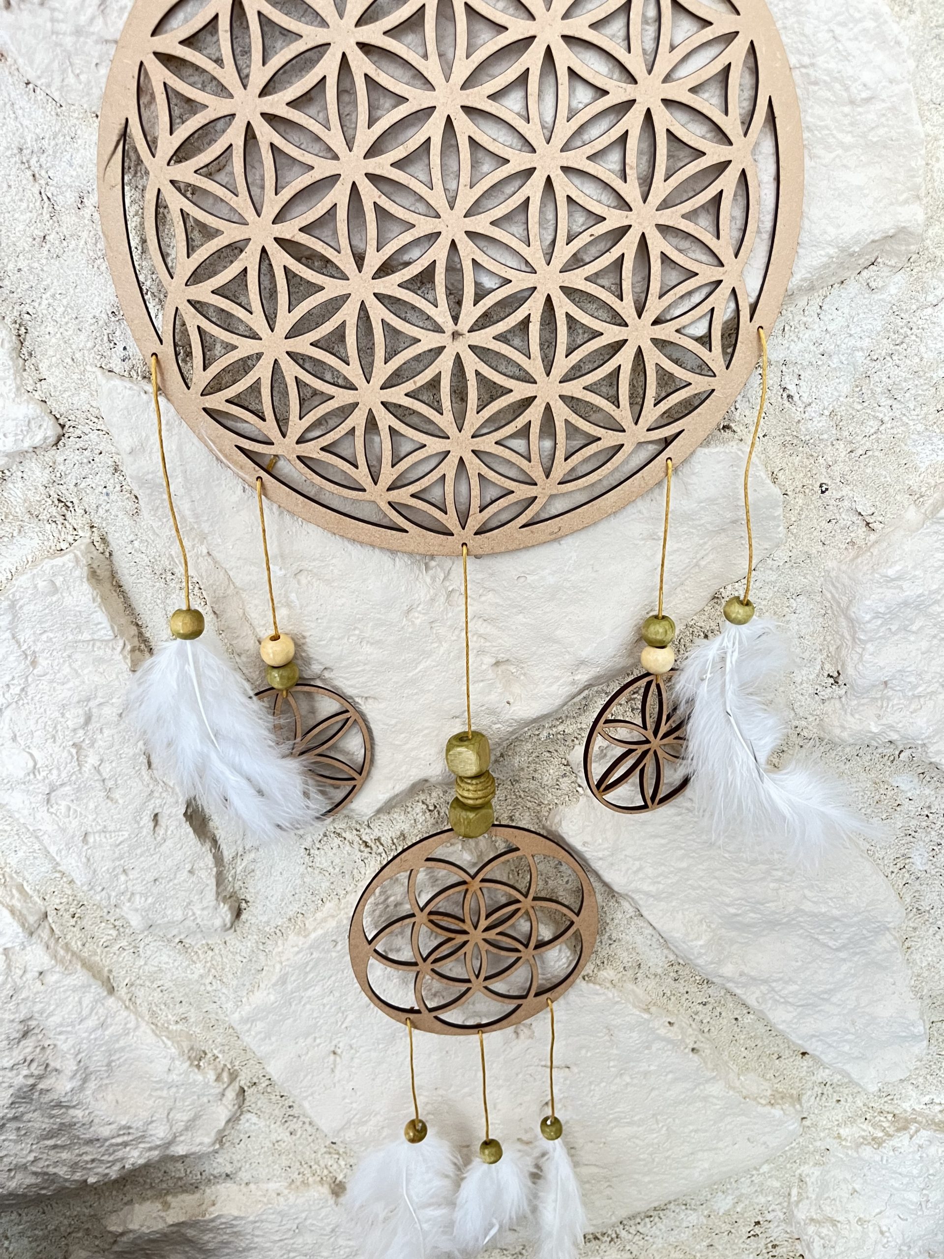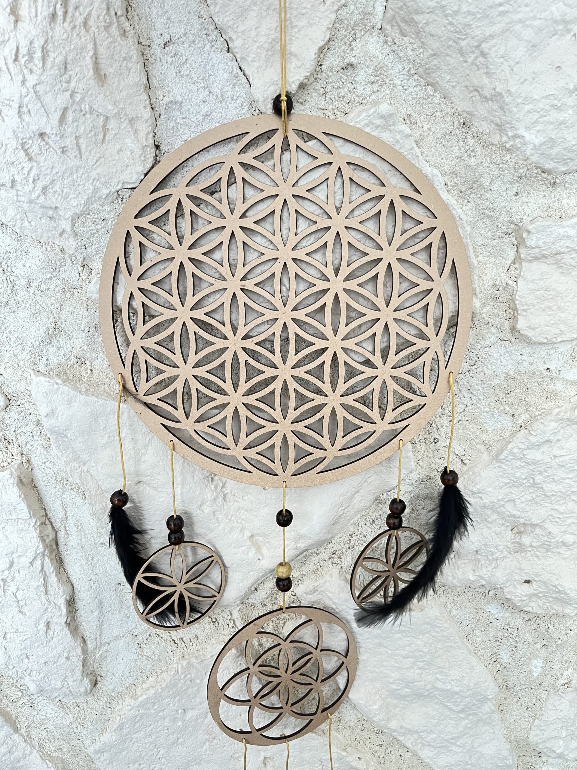 Attrape-rêves en MDF découpé au laser avec motif Fleur de Vie et décoré de plumes blanches ou noires et de perles en bois.