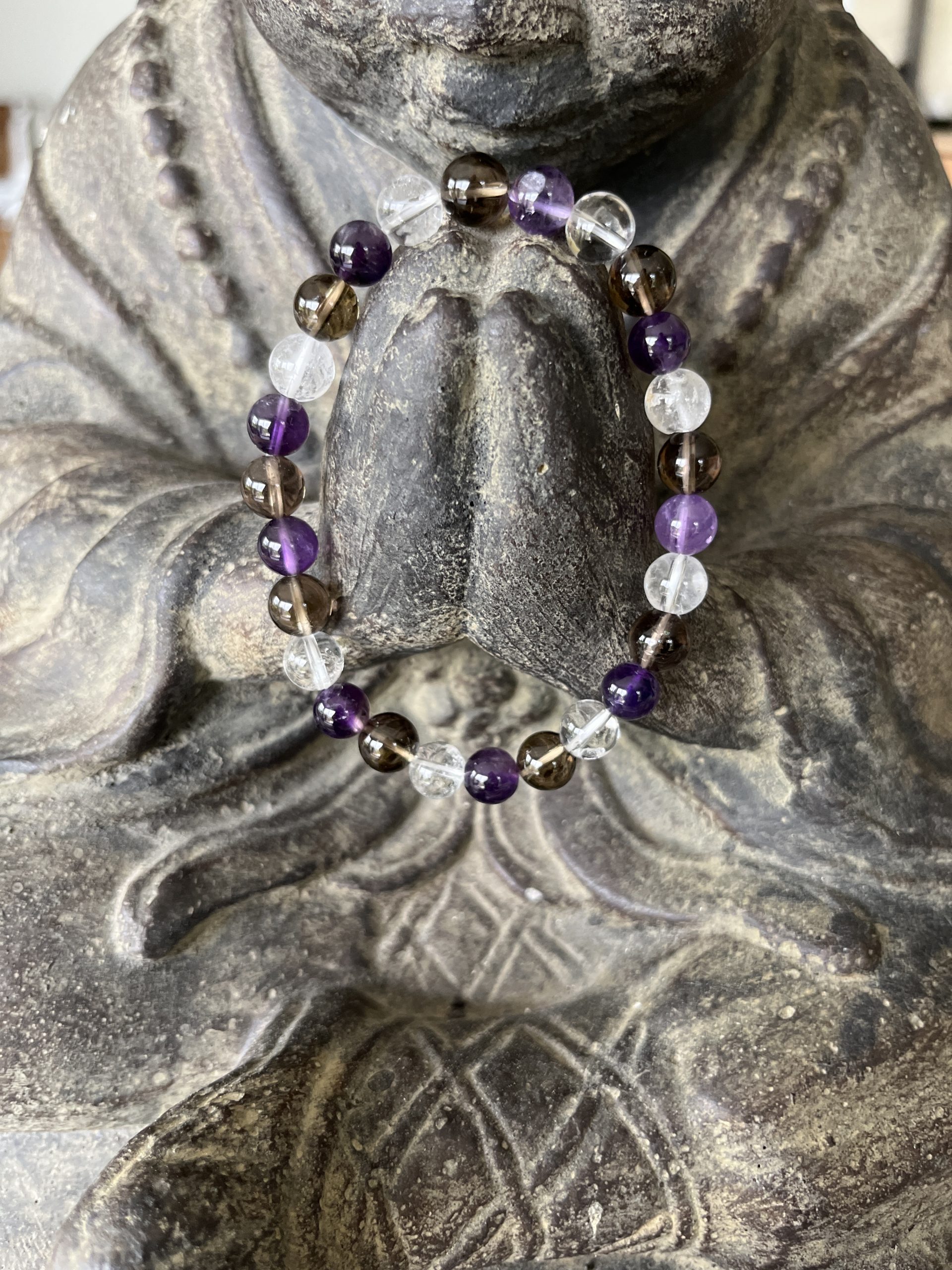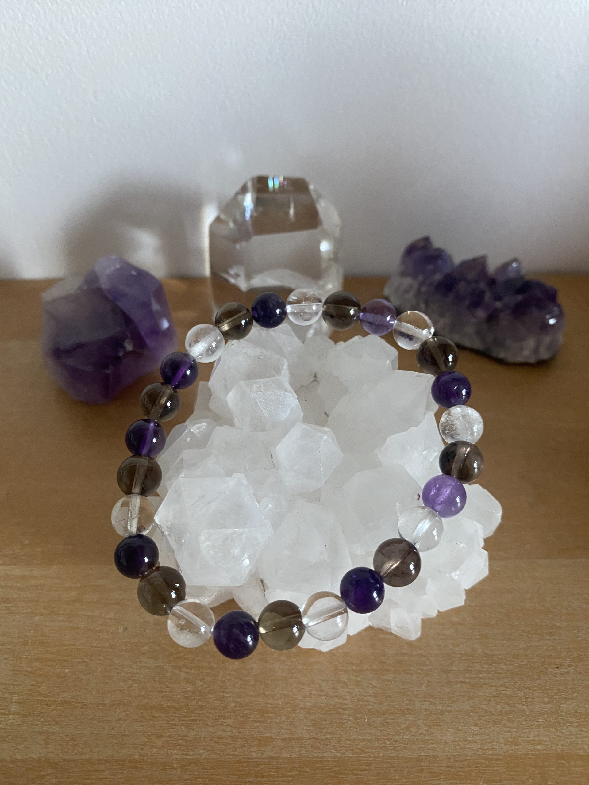 Bracelet en quartz fumé, cristal de roche et amethyste fabriqué par plume étoilée avec des pierres naturelles de 8 mm.