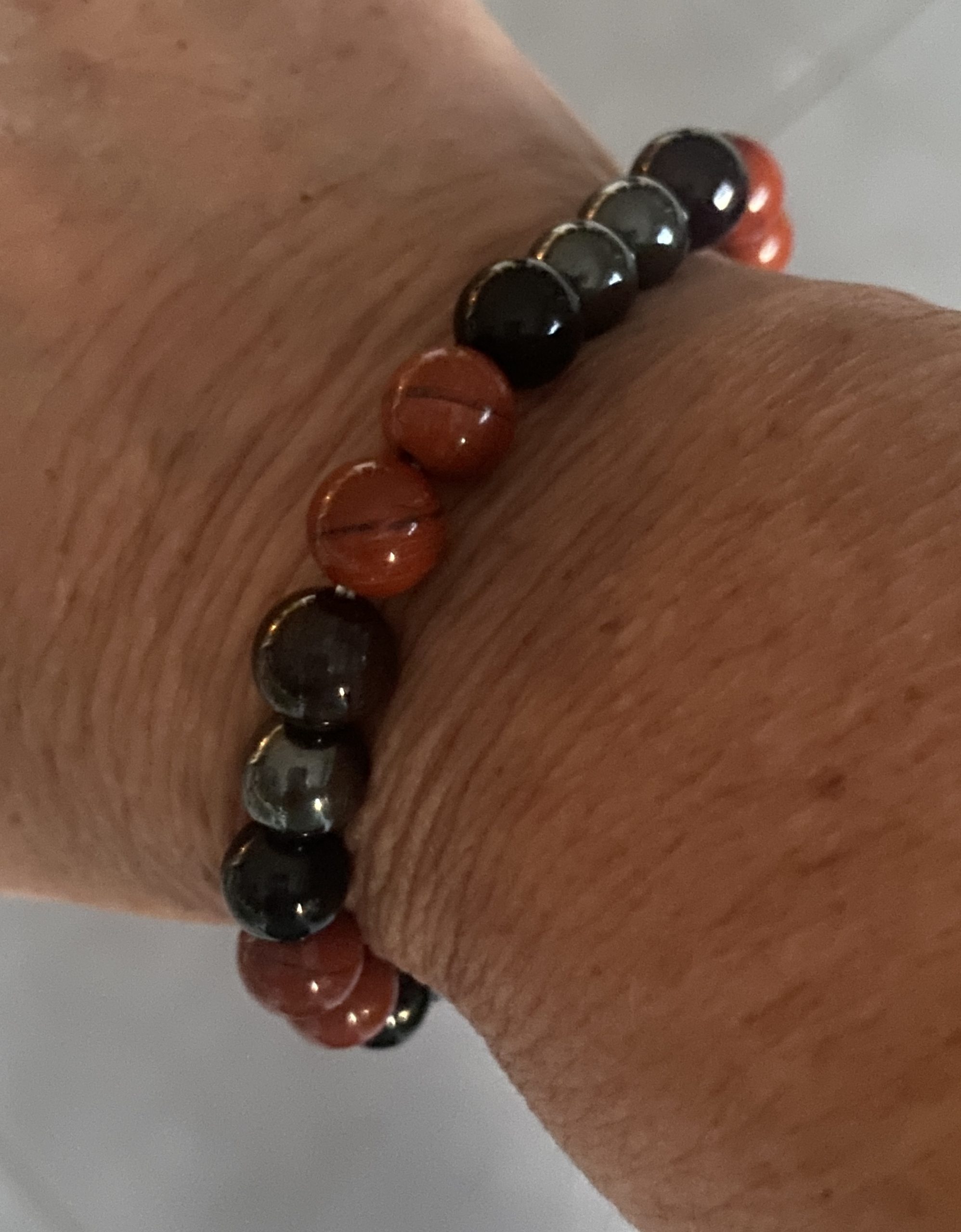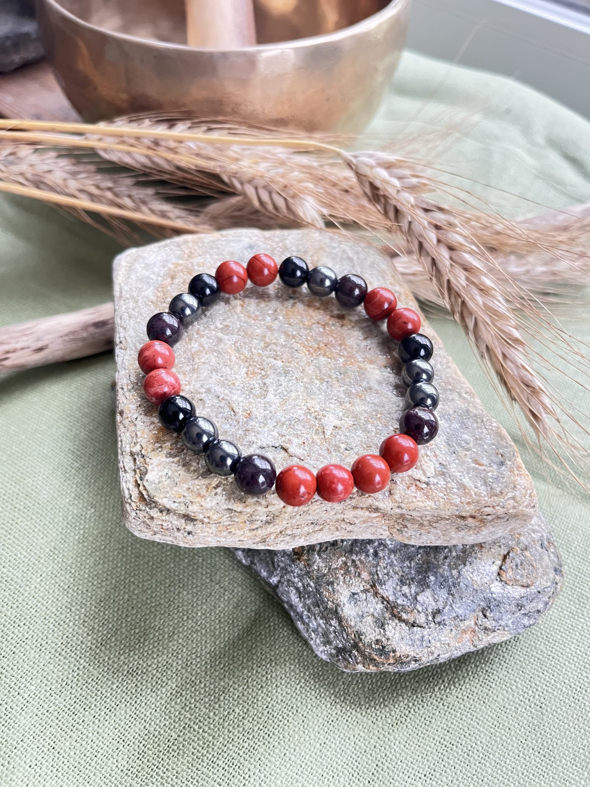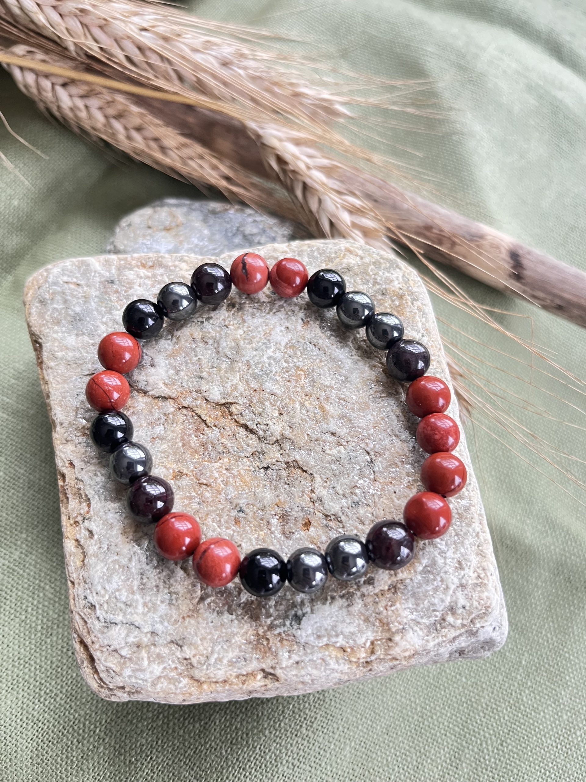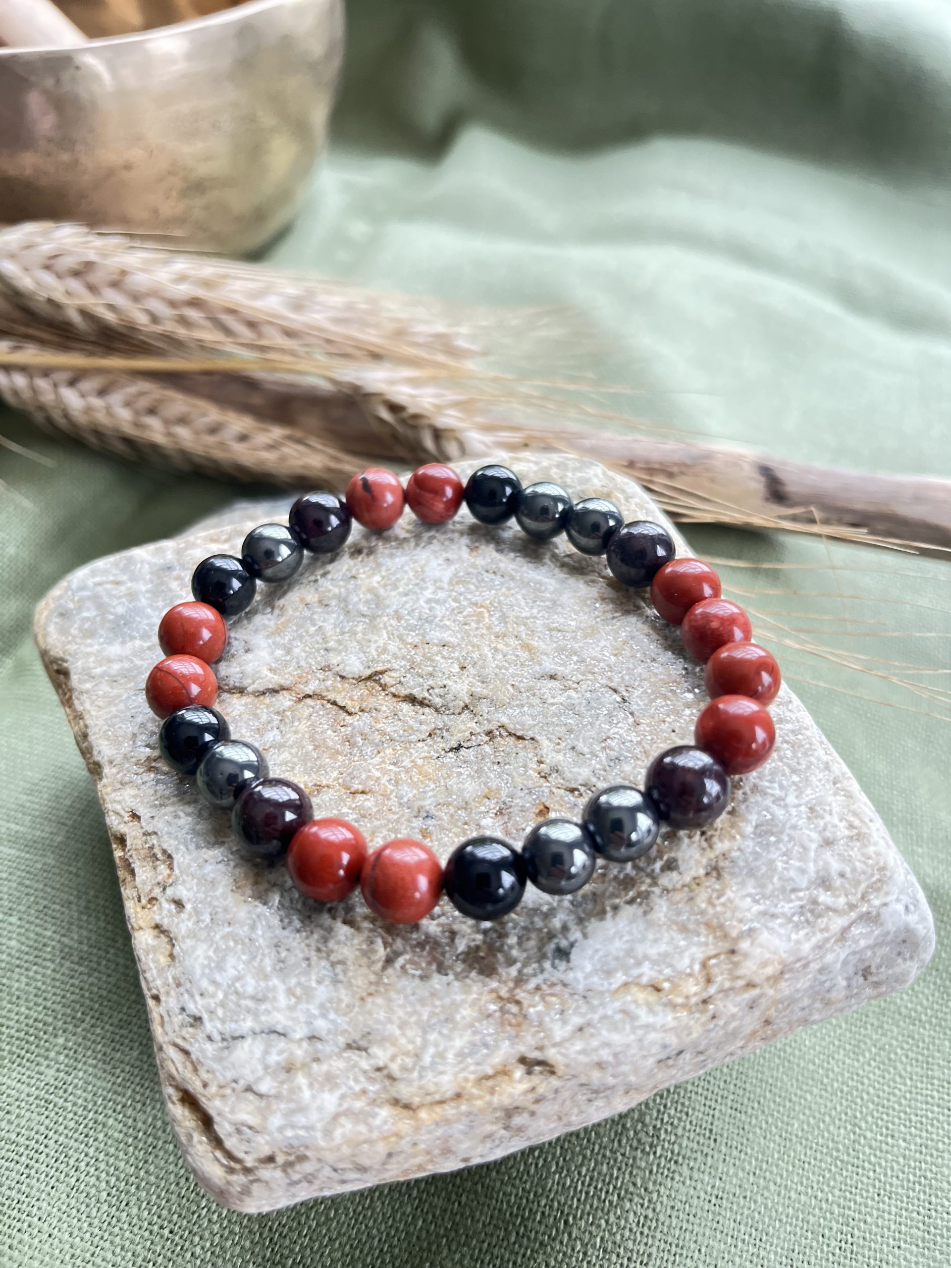 – Jaspe rouge : dynamise l’énergie vitale et l’ancrage.