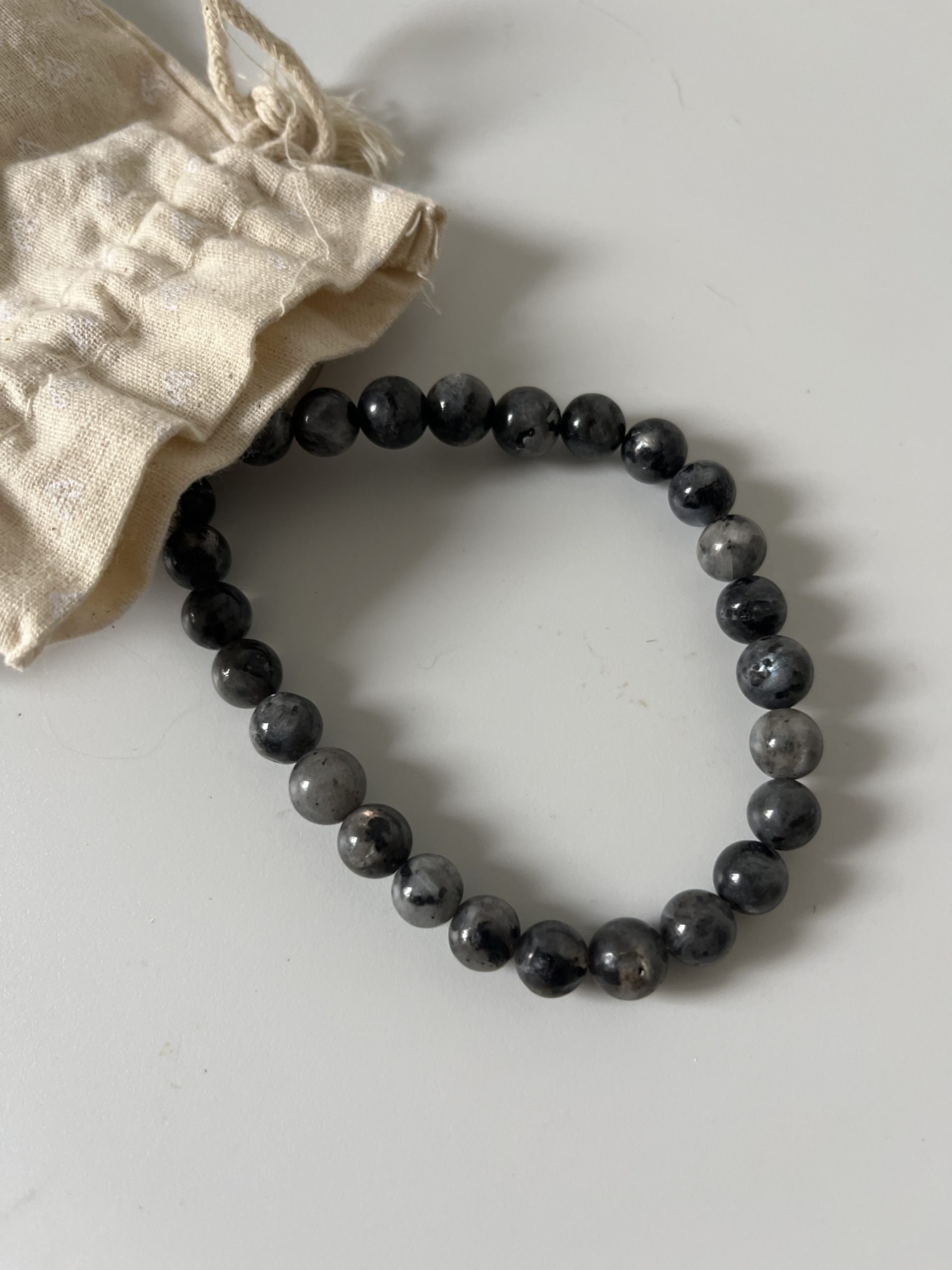 Bracelets fabriqués par plume étoilée avec des pierres naturelles de larvakite de 8 mm.