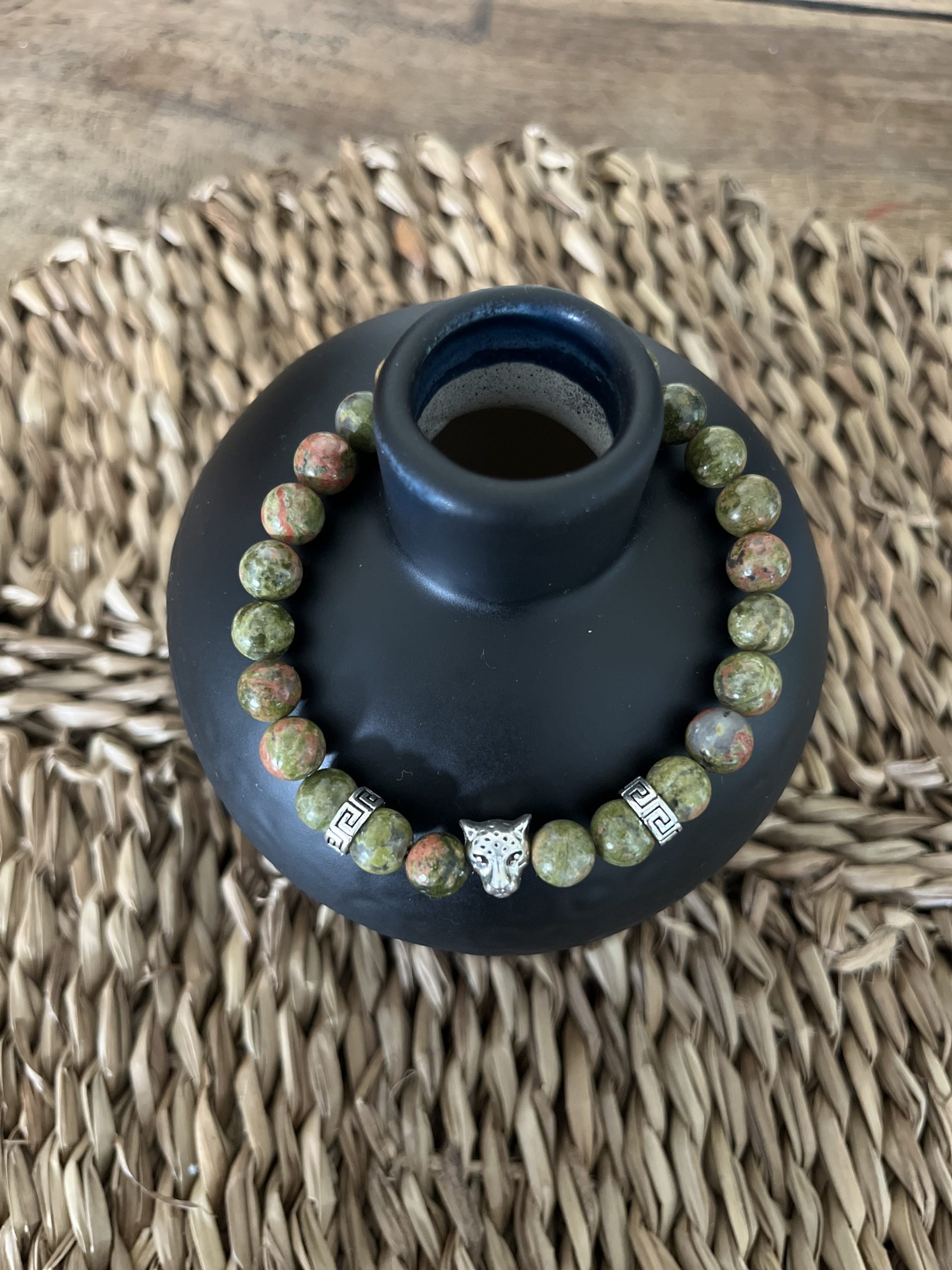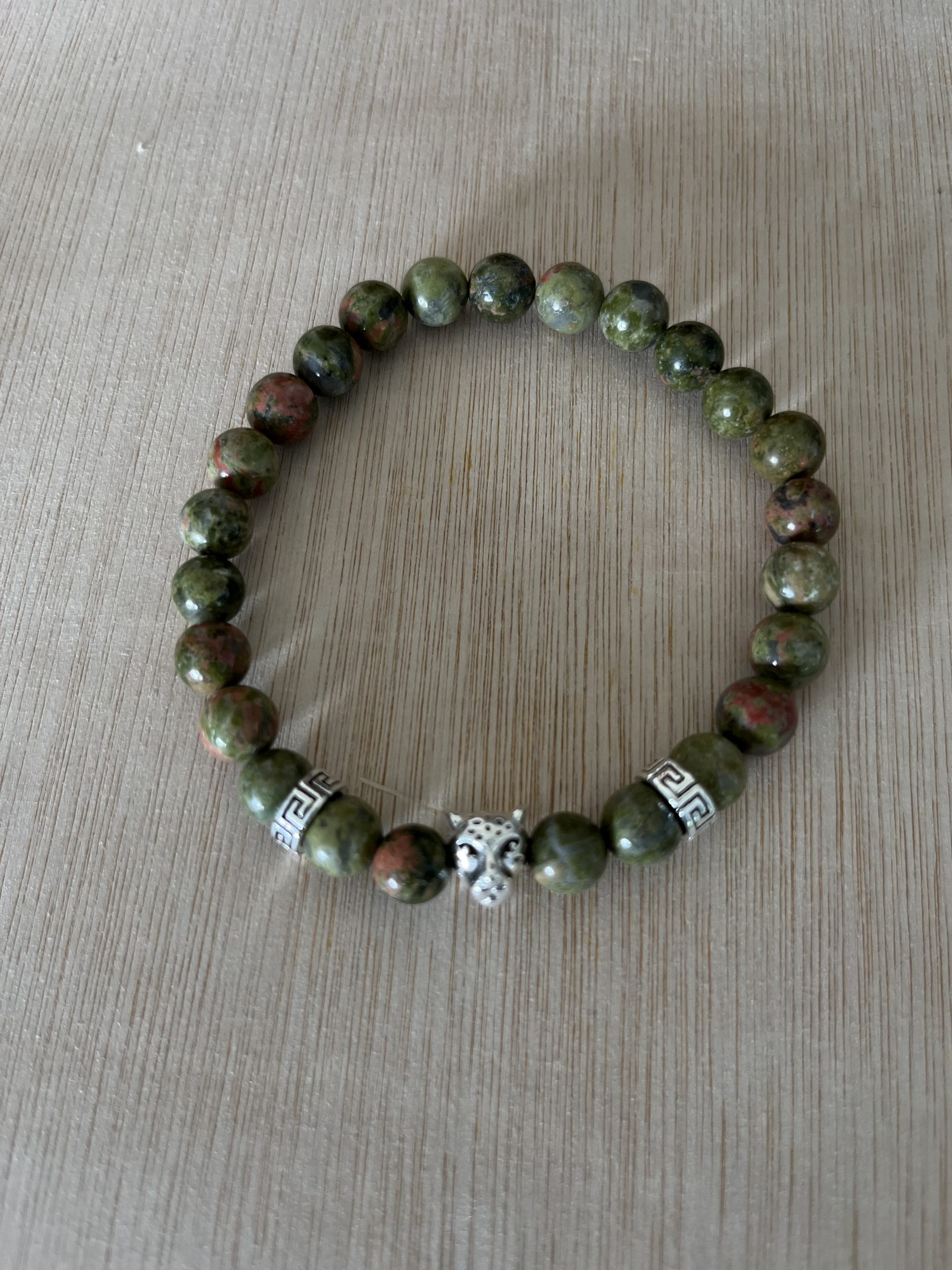 Bracelet fabriqué par plume étoilée avec des pierres naturelles d’unakite avec breloque léopard. Pierres de 8 mm.
