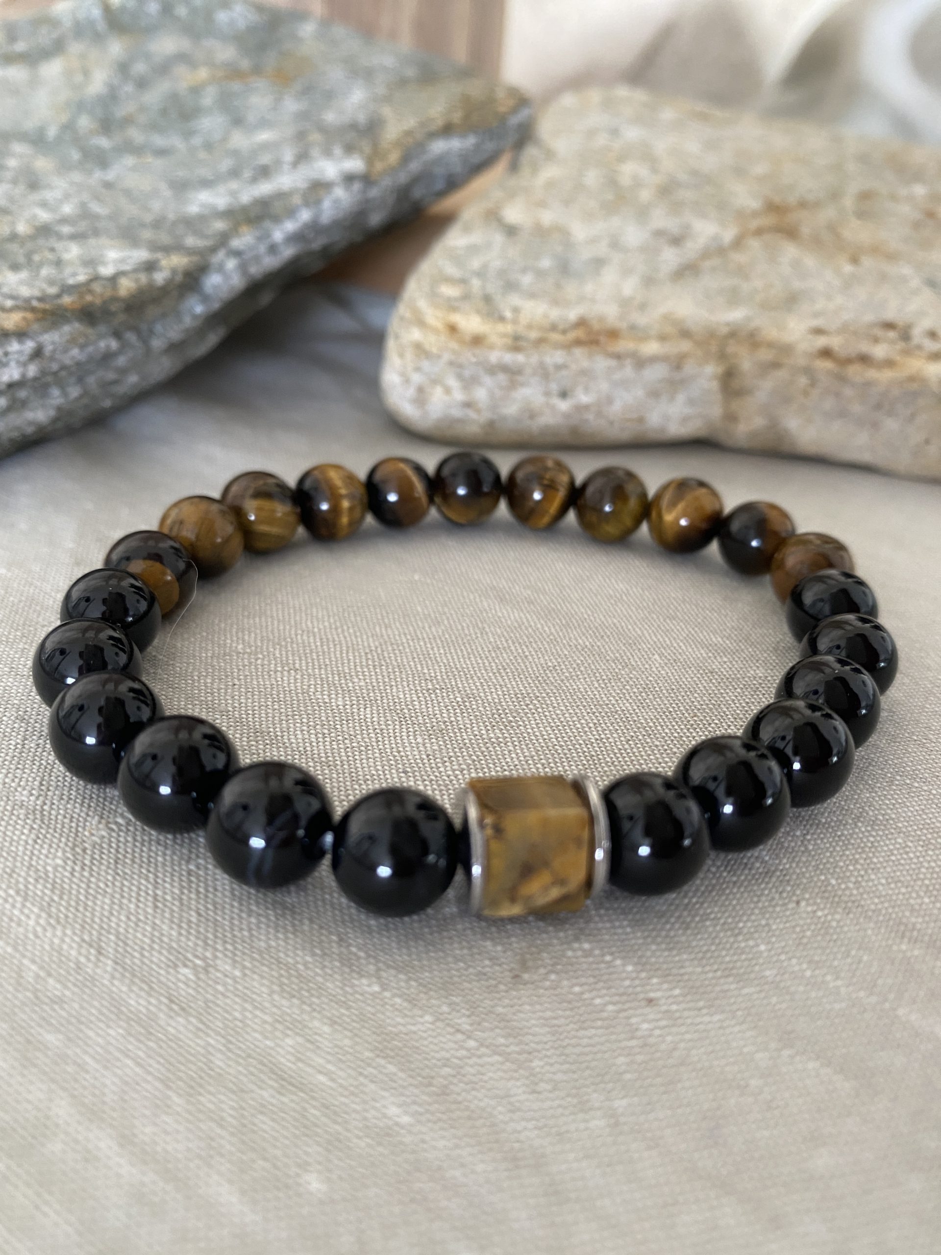Ce bracelet masculin combine Œil de Tigre et Onyx, deux pierres puissantes pour les hommes souhaitant se protéger, renforcer leur confiance et affirmer leur force intérieure. Élégant et sobre, il peut être porté au quotidien comme bijou énergétique ou accessoire stylé.