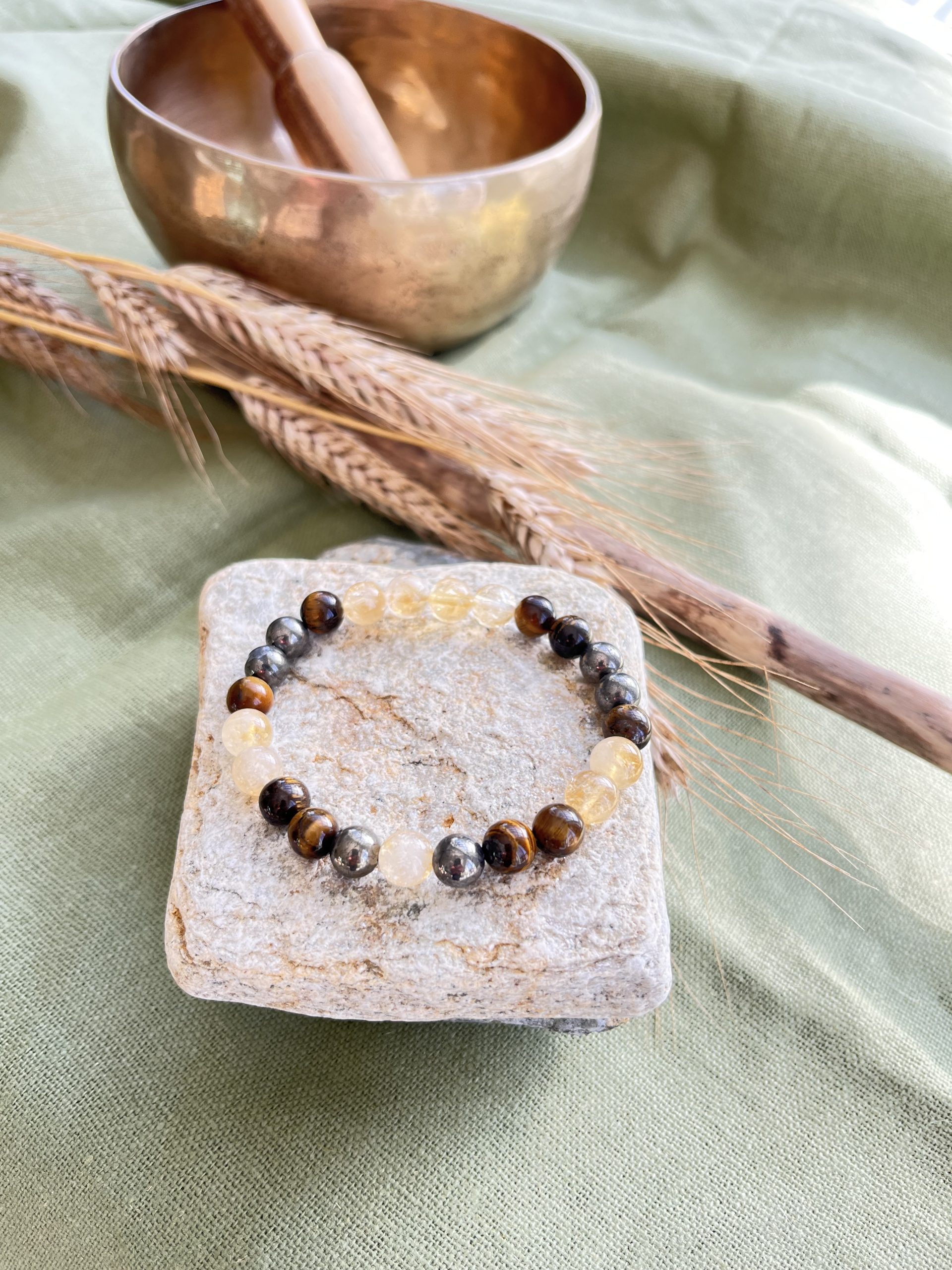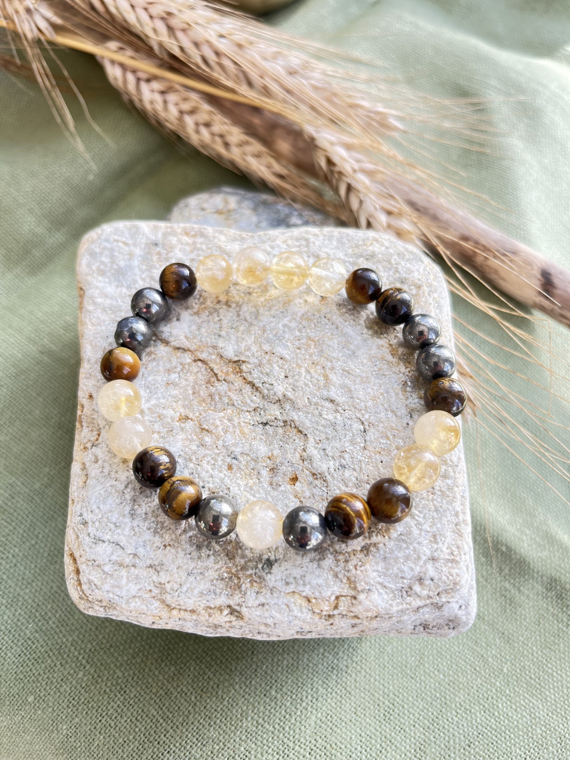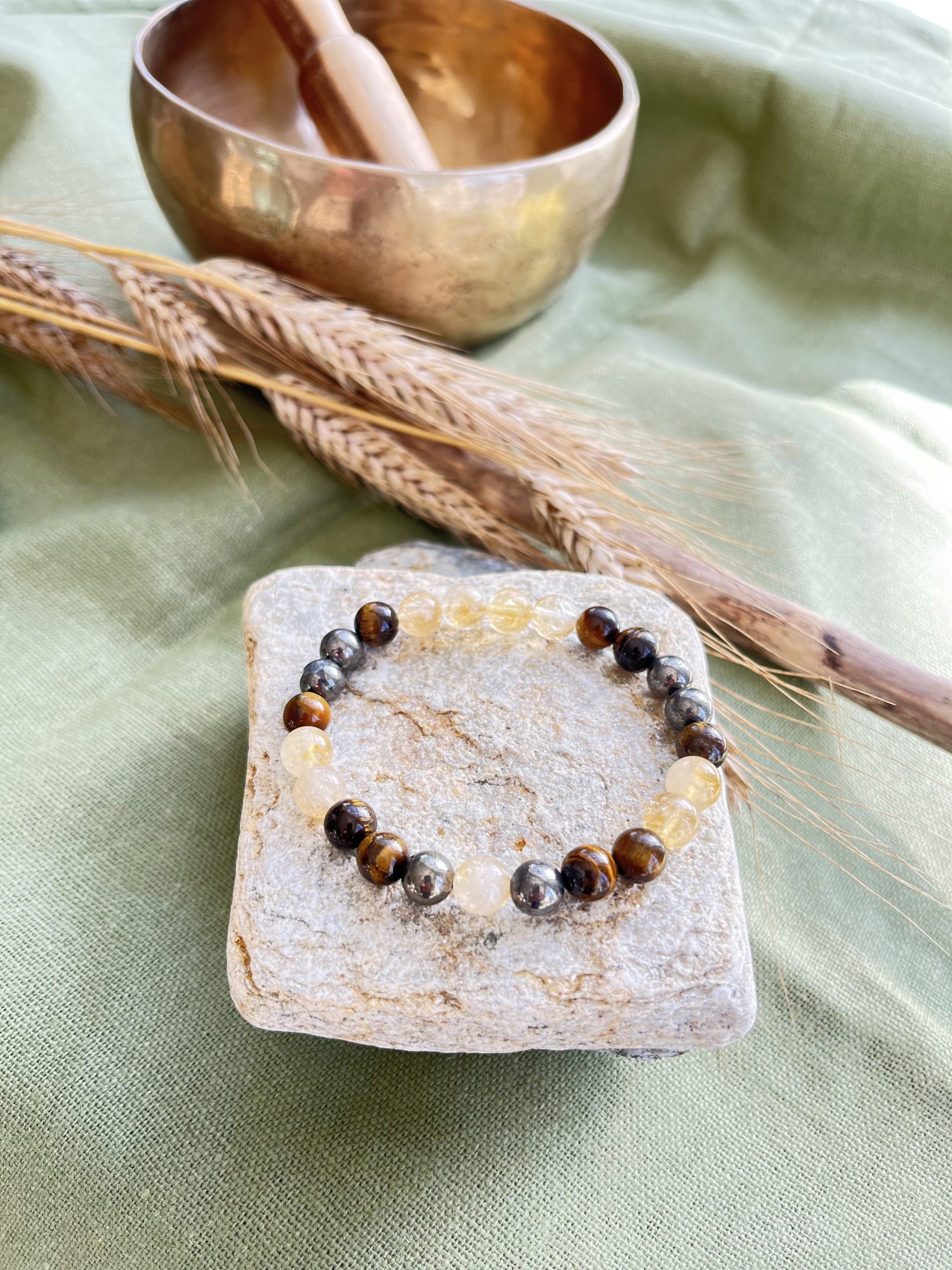 Ce bracelet harmonisant réunit trois pierres puissantes du plexus solaire, centre énergétique de la confiance, de la volonté et du pouvoir personnel.