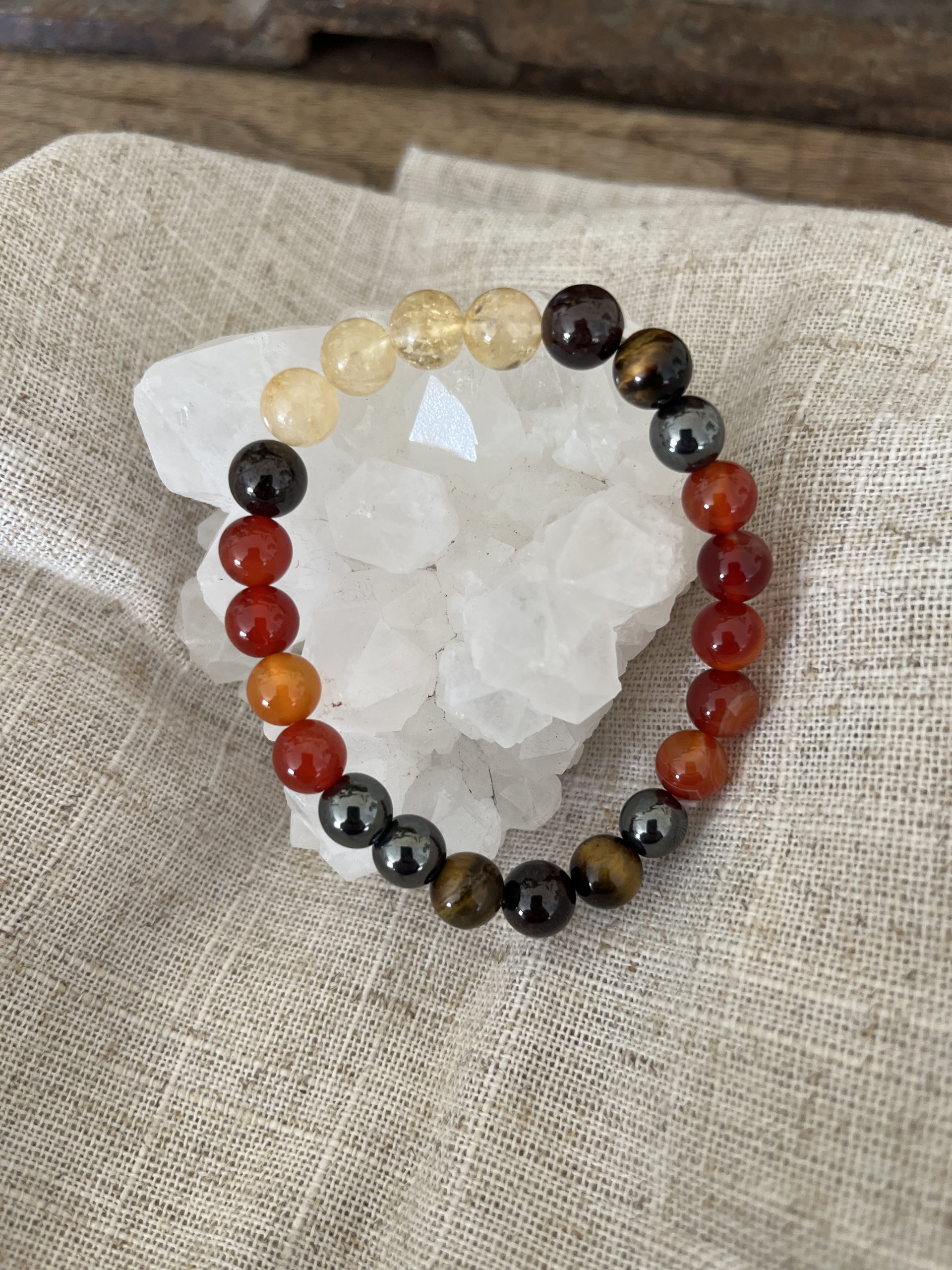 Ce bijou associe la puissance de la cornaline, de la citrine, de l’œil de tigre,  du grenat et de l’hématite pour stimuler votre vitalité et renforcer votre motivation.