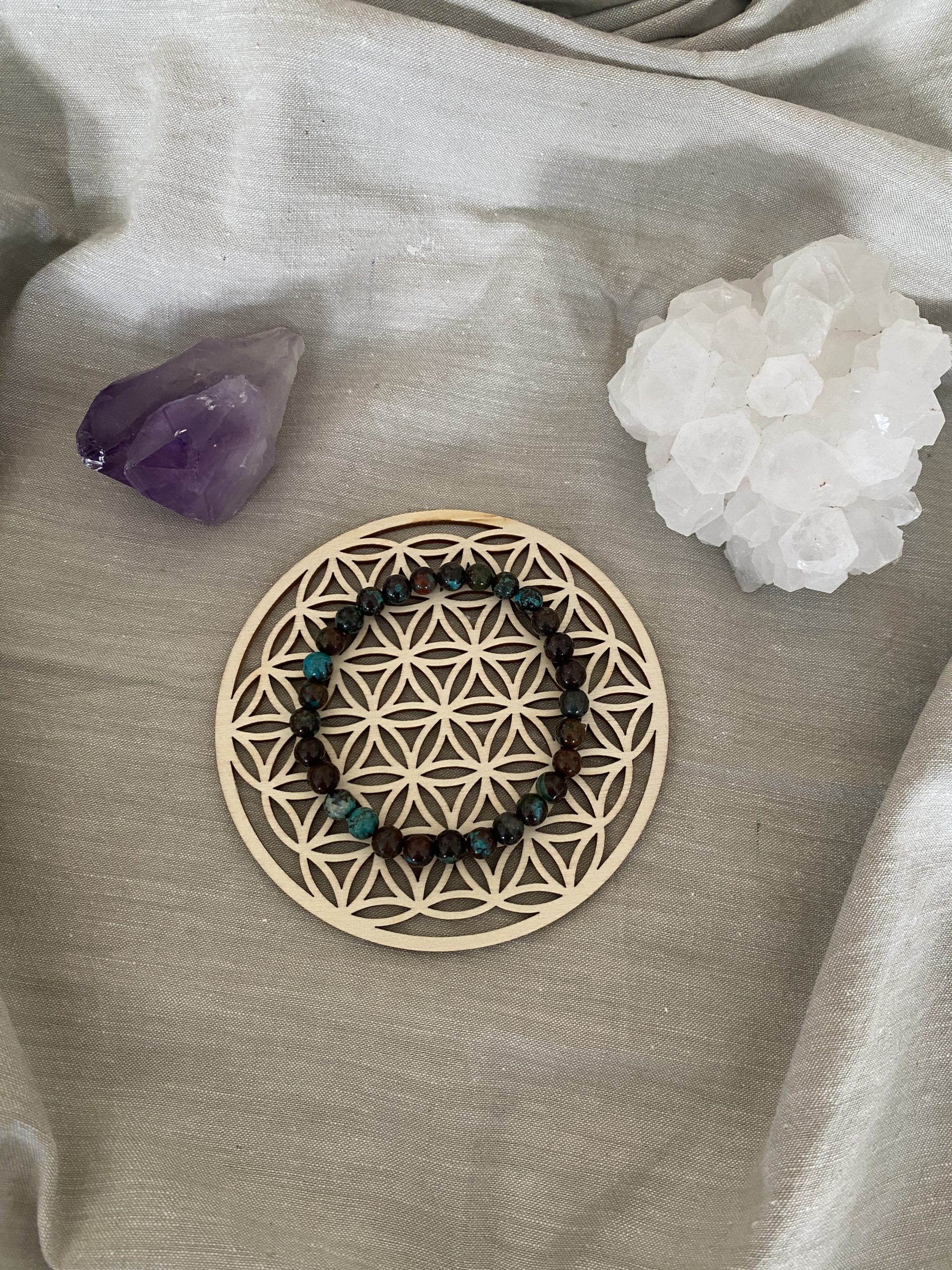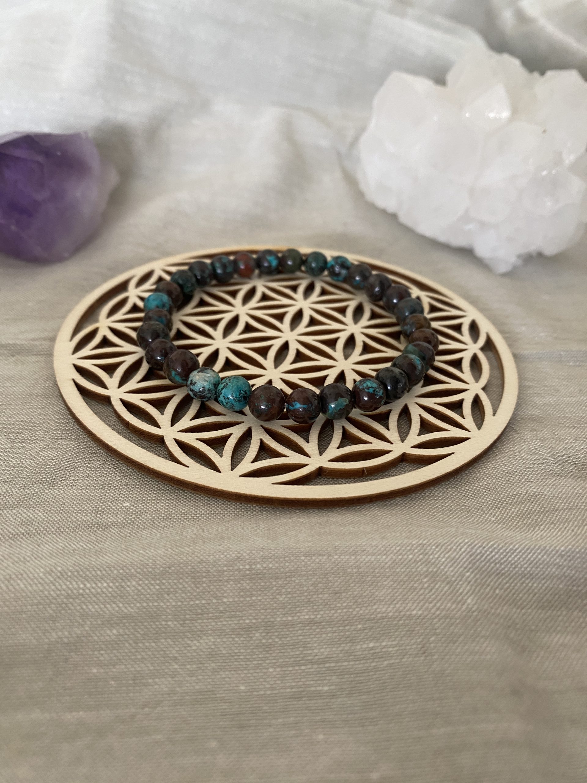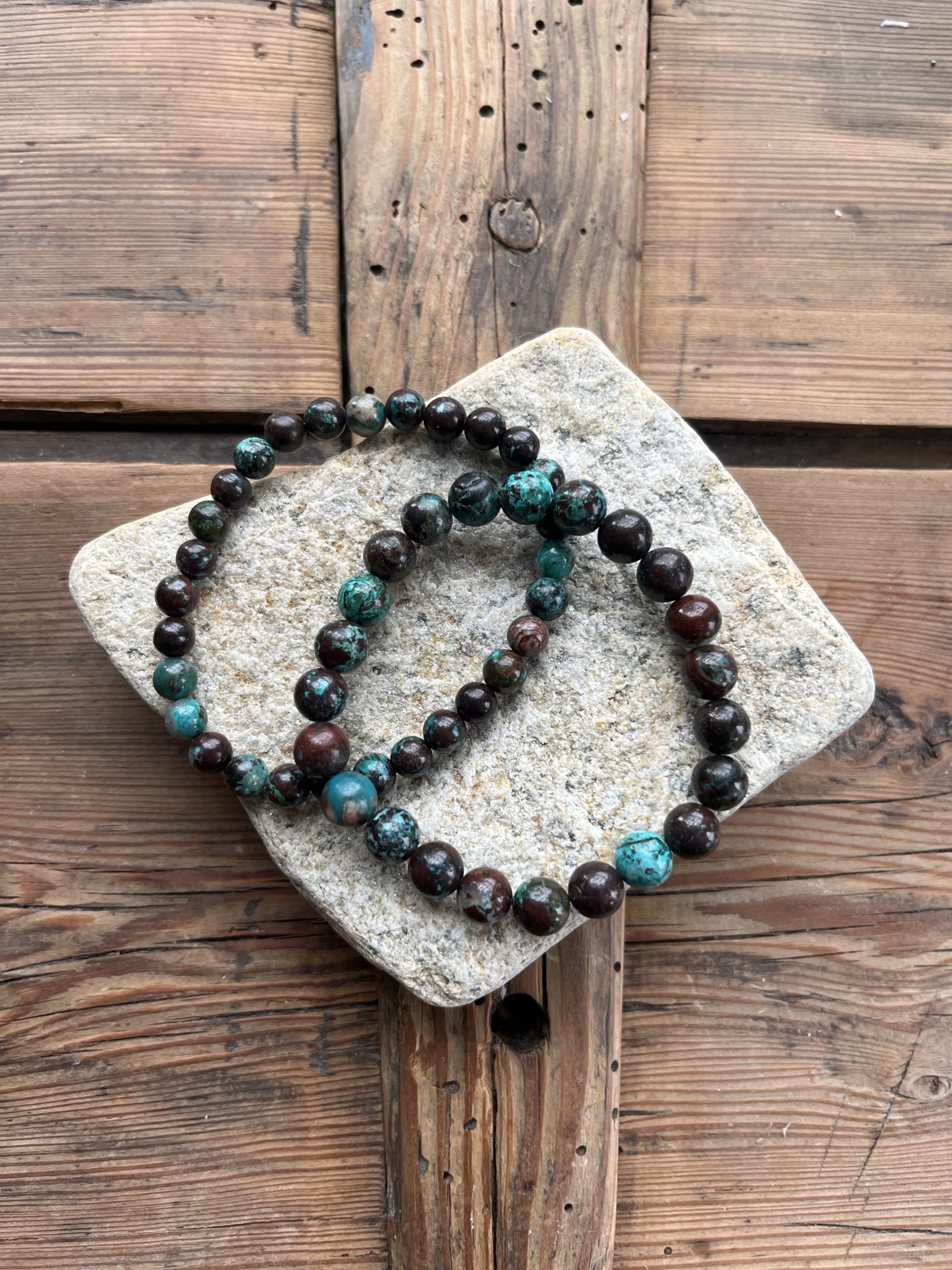 Bracelet en Chrysocolle fabriqué par plume étoilée avec des pierres naturelles de 8 ou 6 mm. Pierres de qualité AA.
