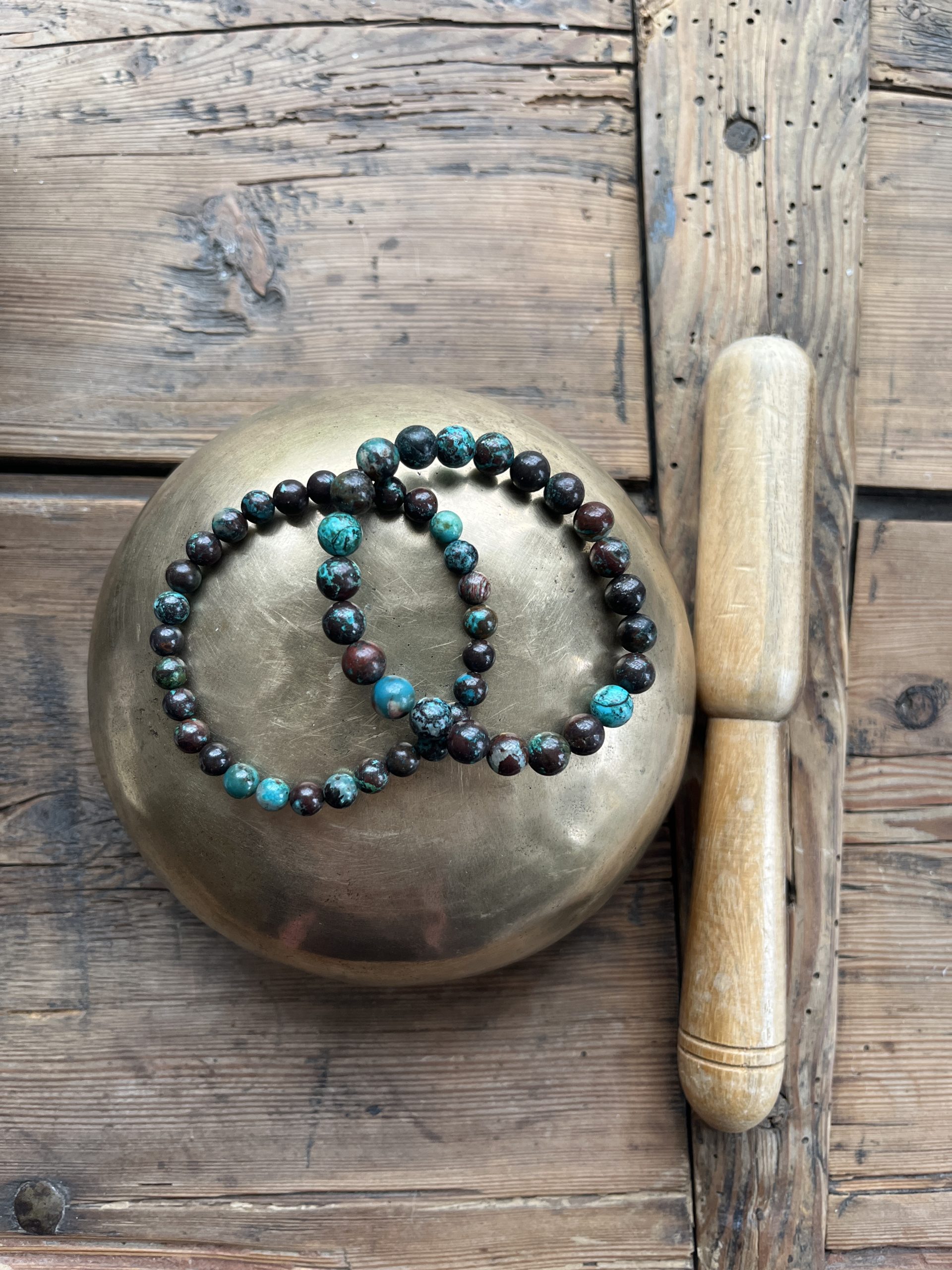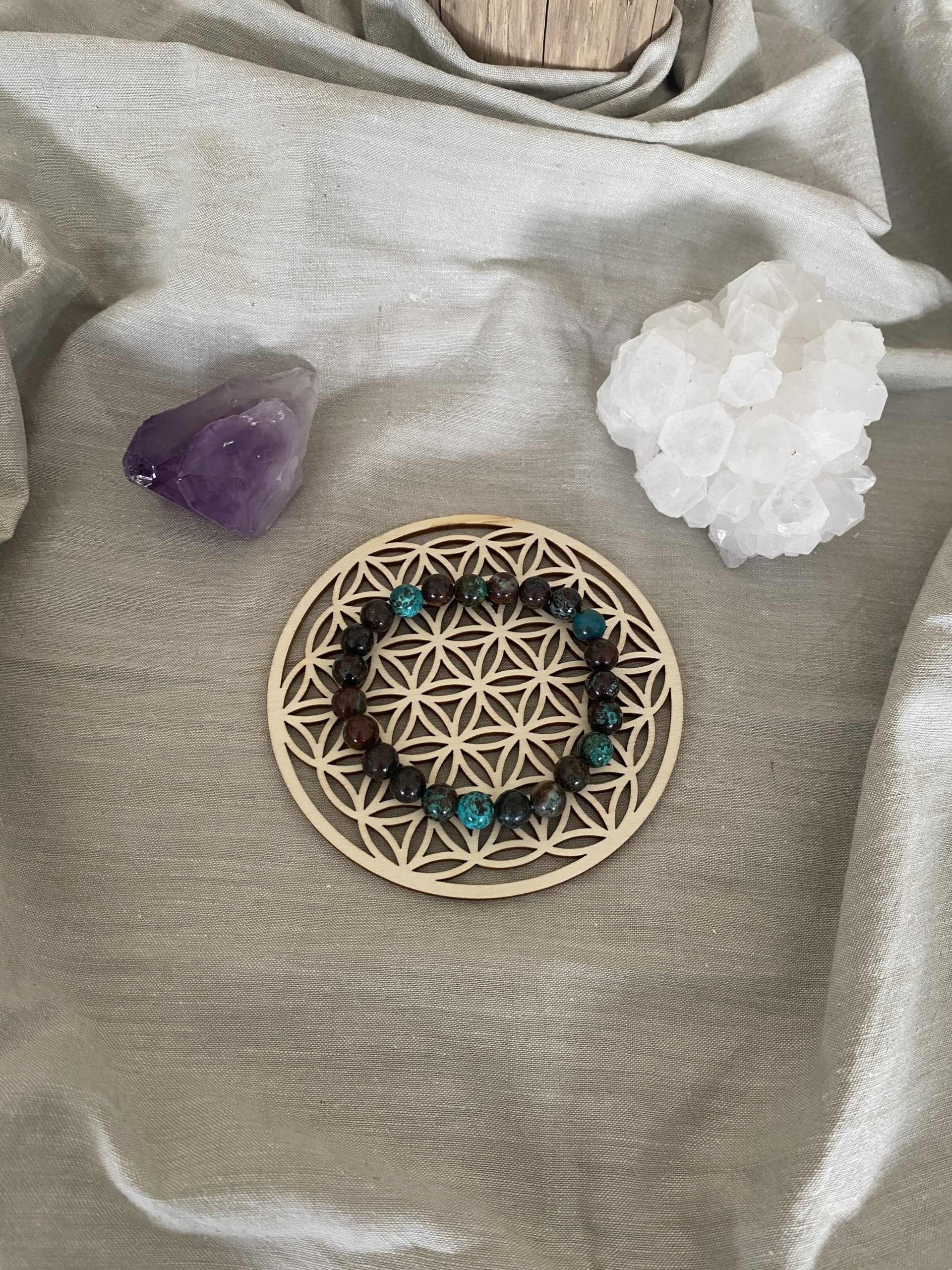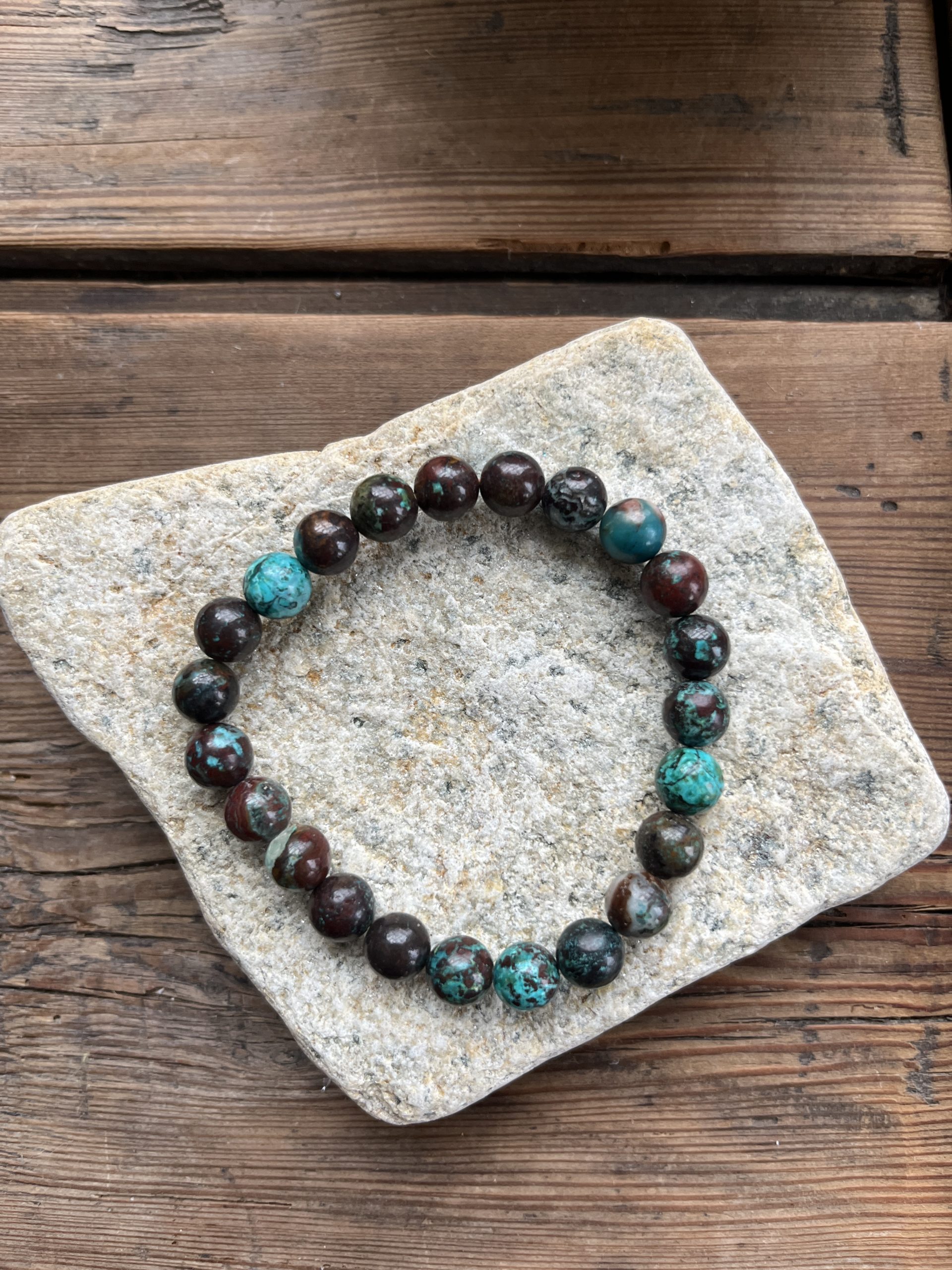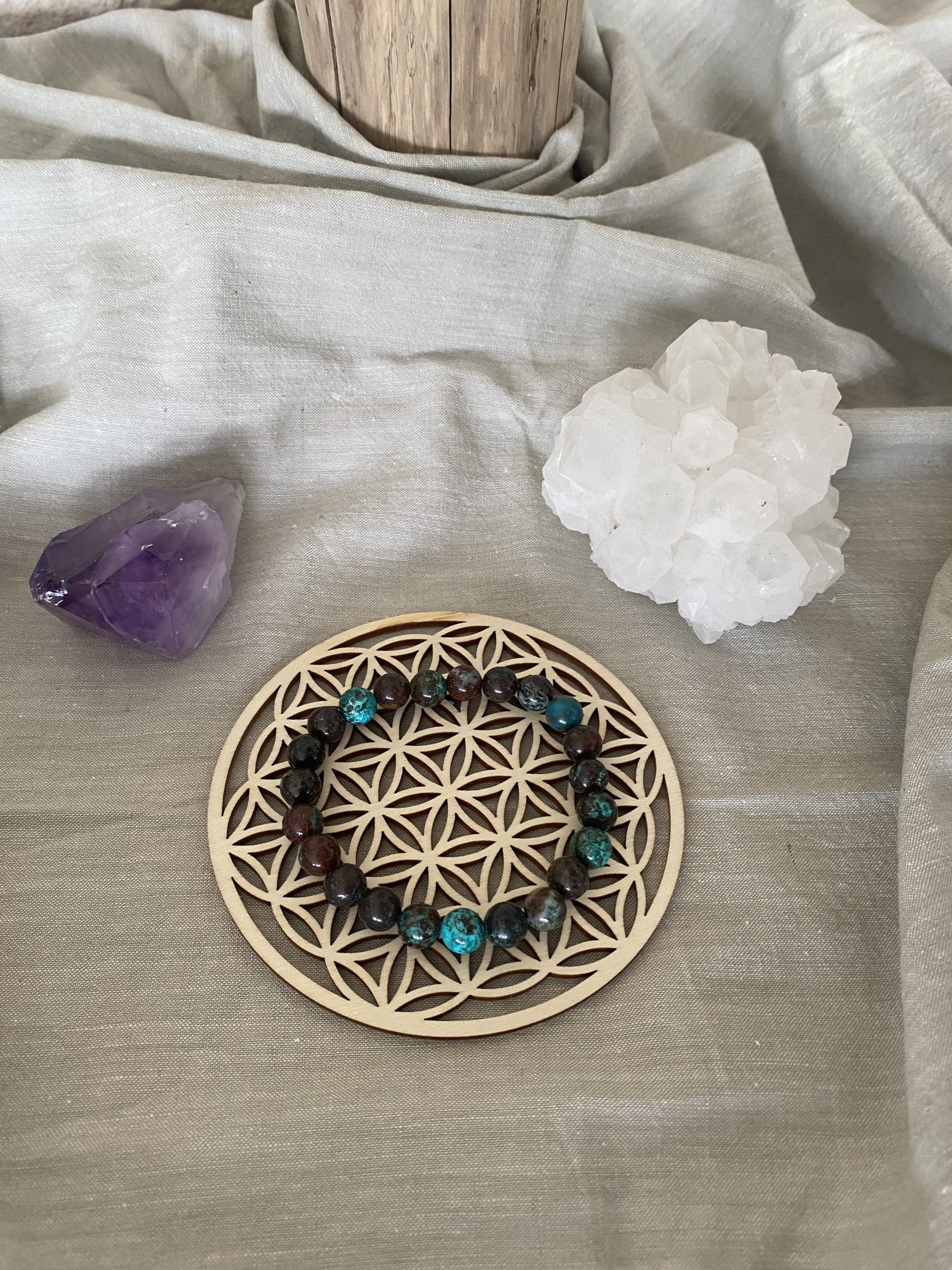 Bracelet en Chrysocolle fabriqué par plume étoilée avec des pierres naturelles de 8 ou 6 mm. Pierres de qualité AA.