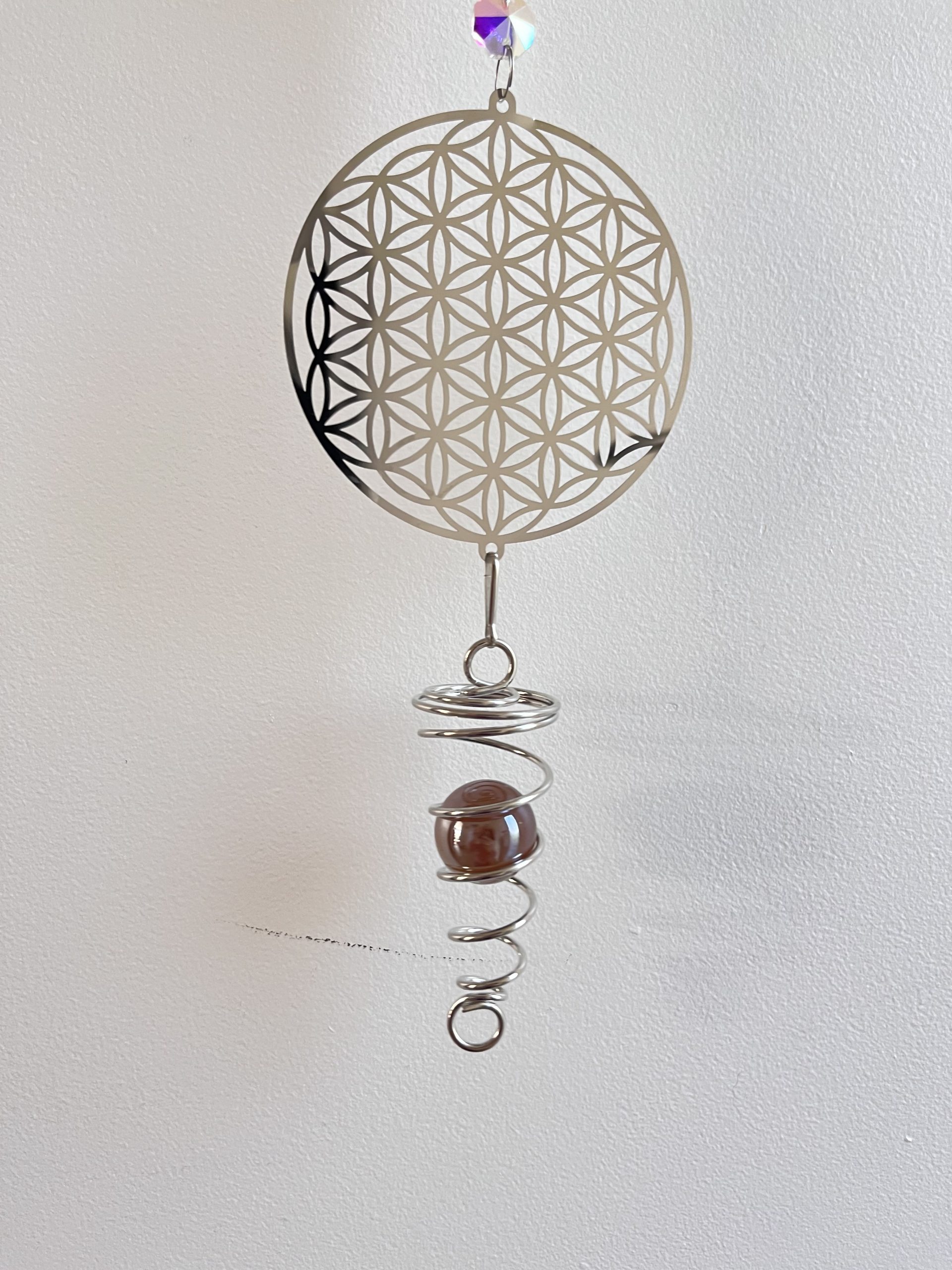 C : Mobile acier fleur de vie, spirale avec boule rouge.