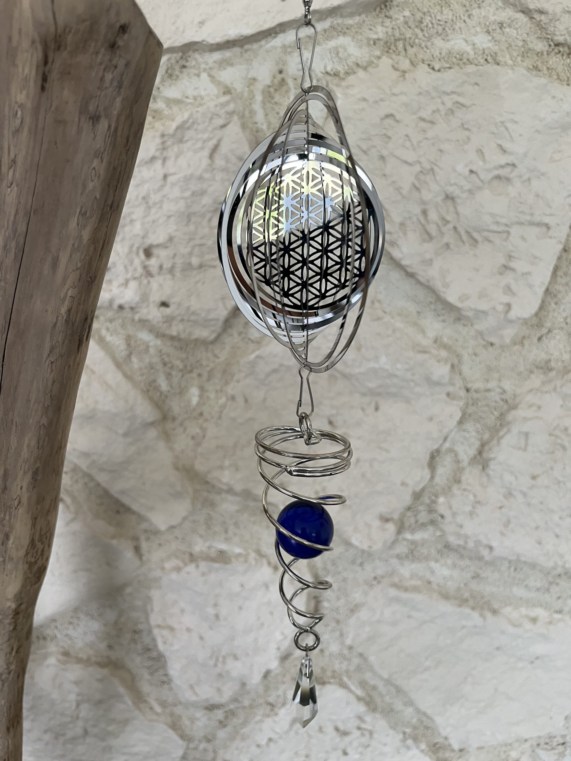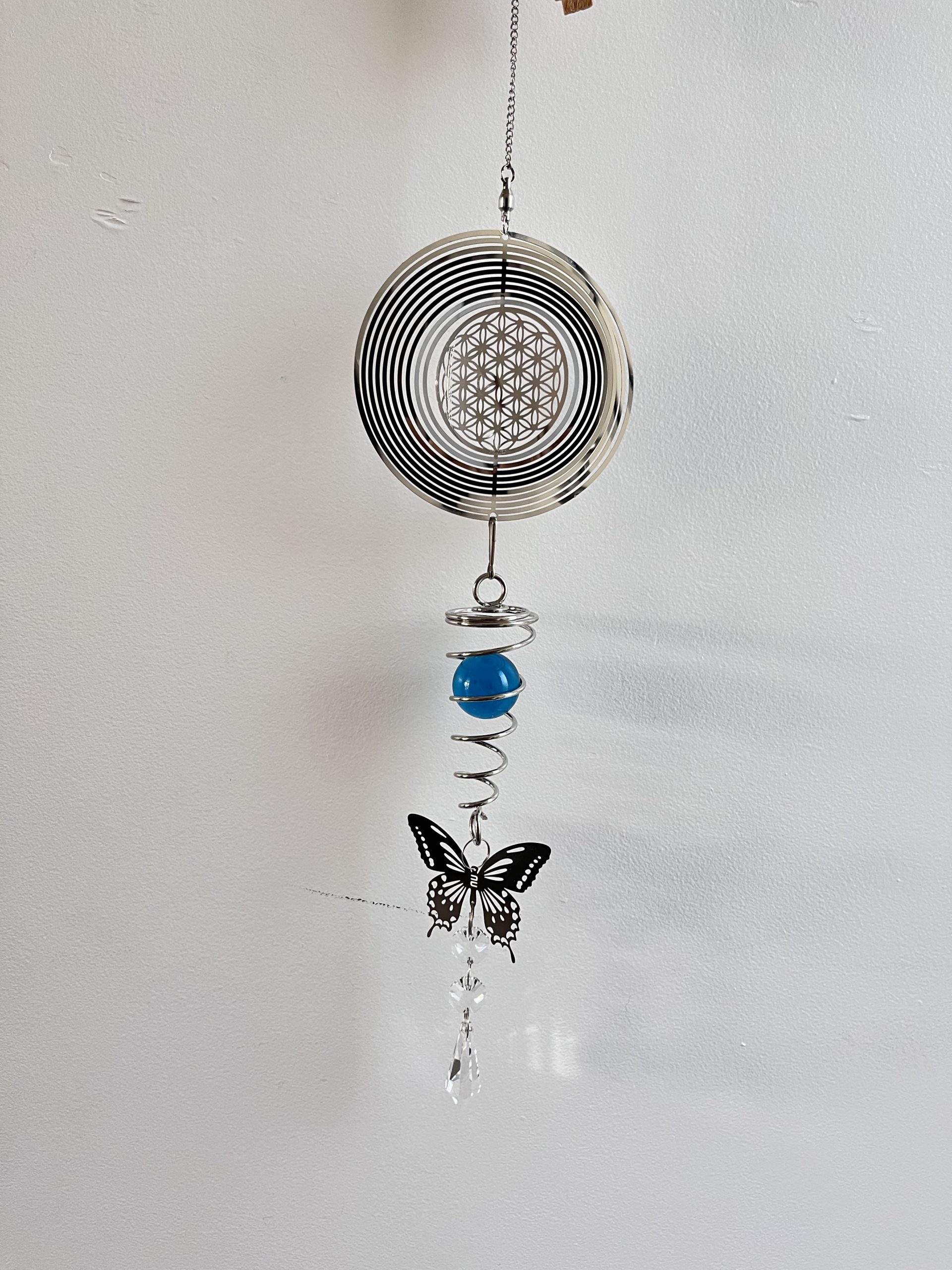 B : Mobile éolien 3D acier fleur de vie, spirale avec boule bleue et papillon.
