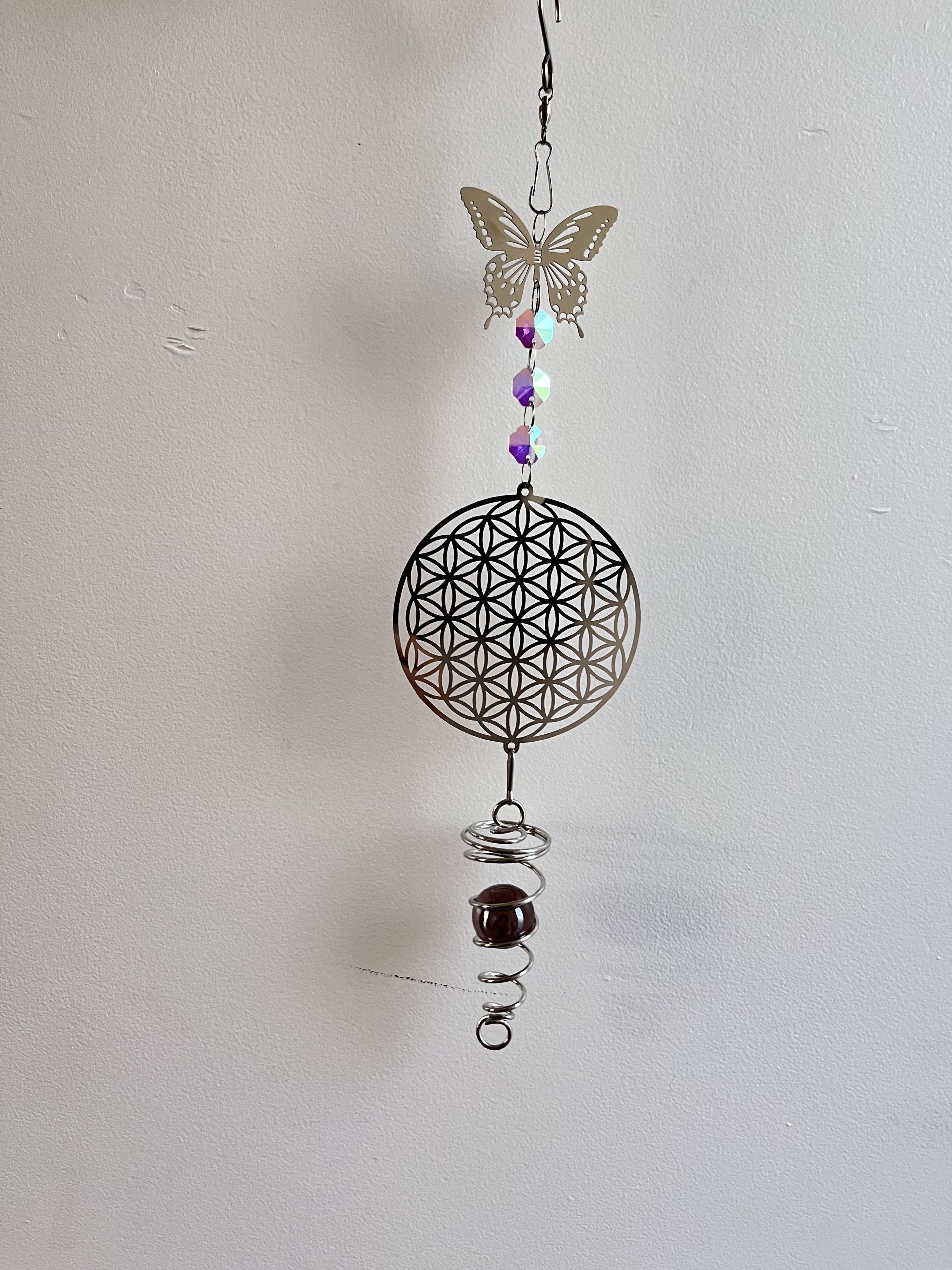 À : Mobile fleur de vie, acier, papillon et spirale avec boule.