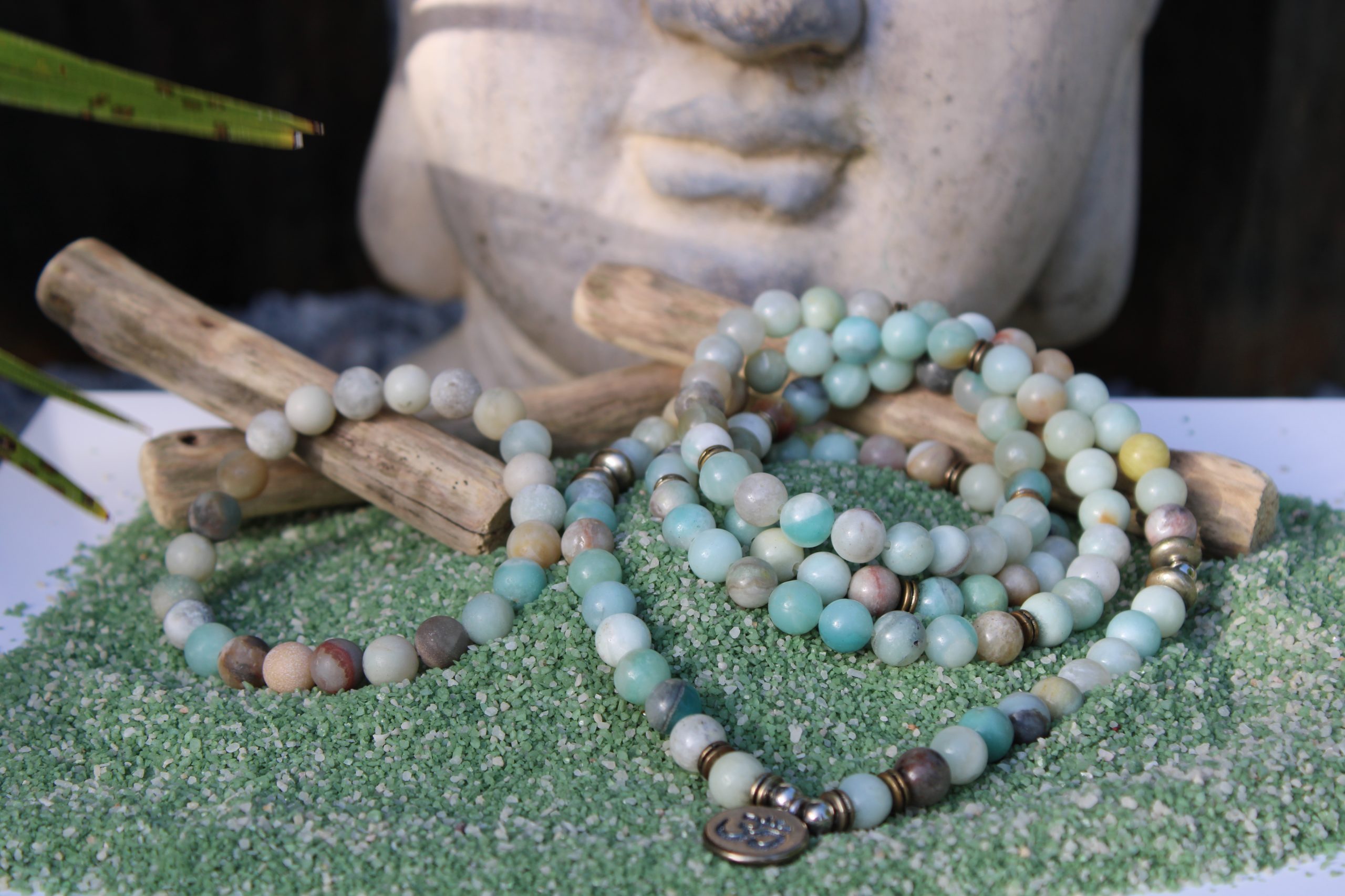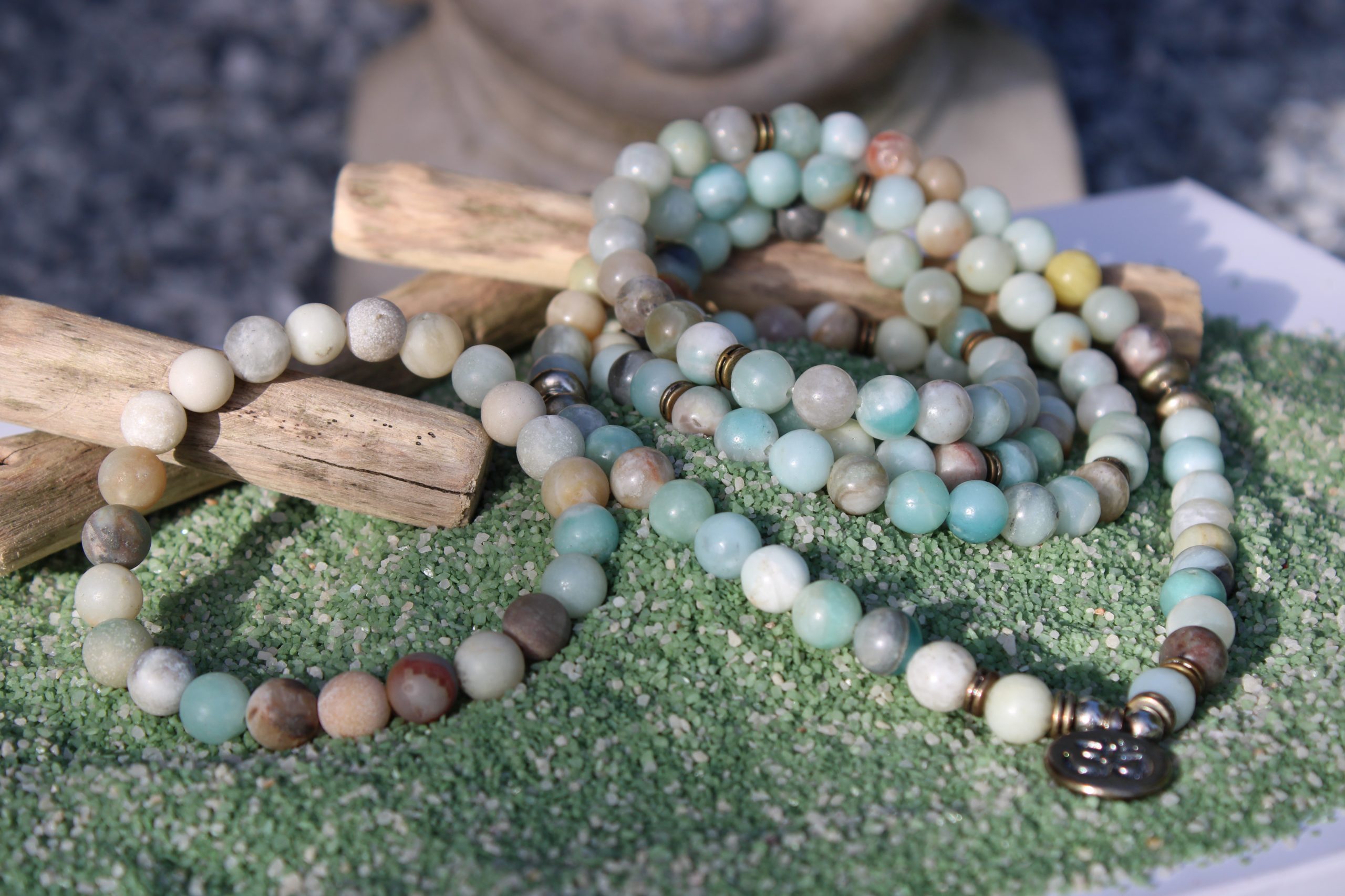 Bracelet et Mala en pierres naturelles de 8 mm d’amazonite fabriqués par plume étoilée.