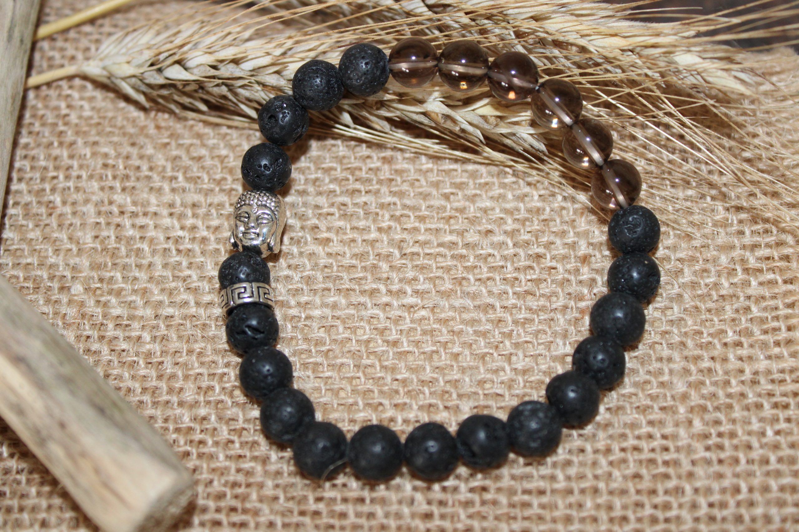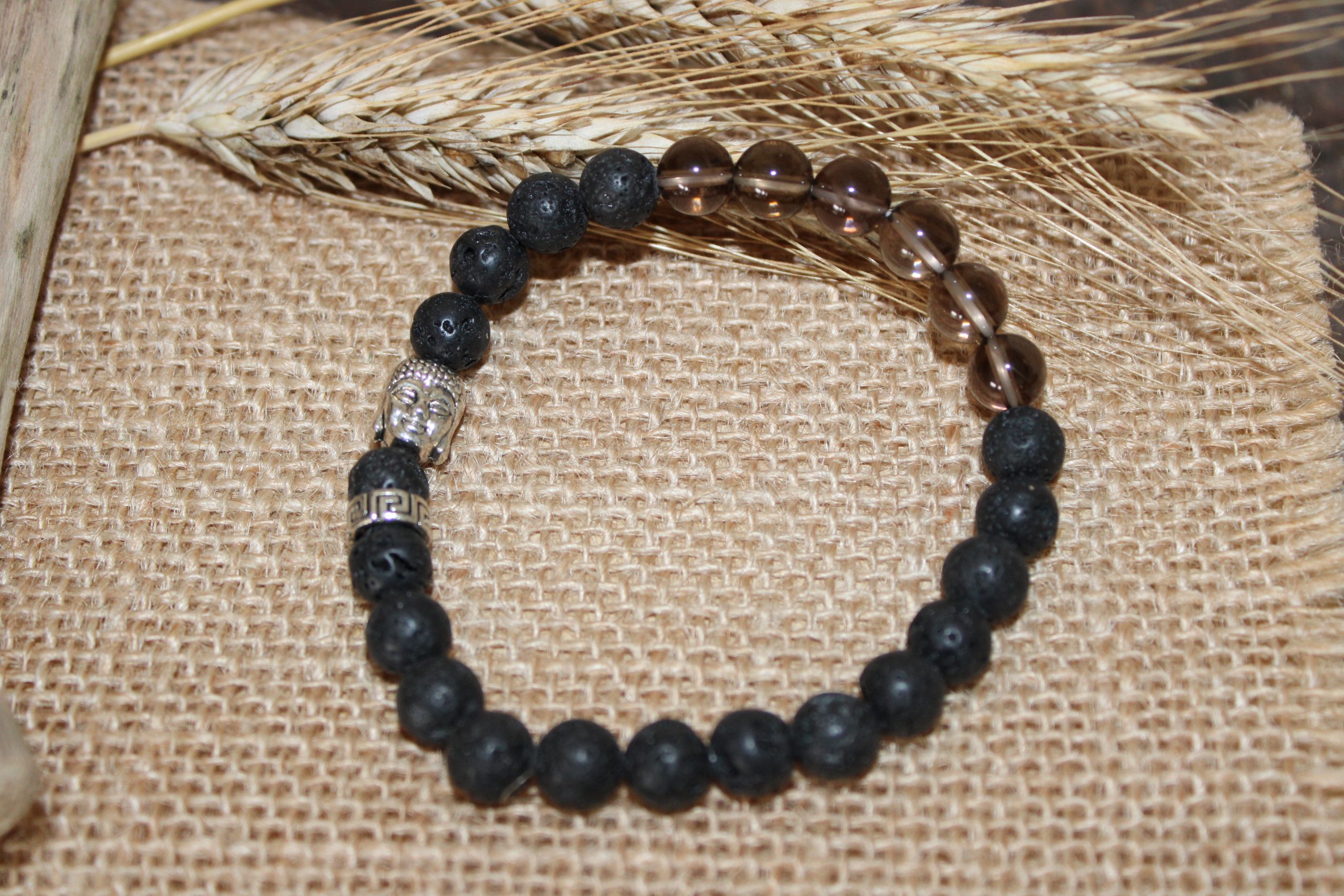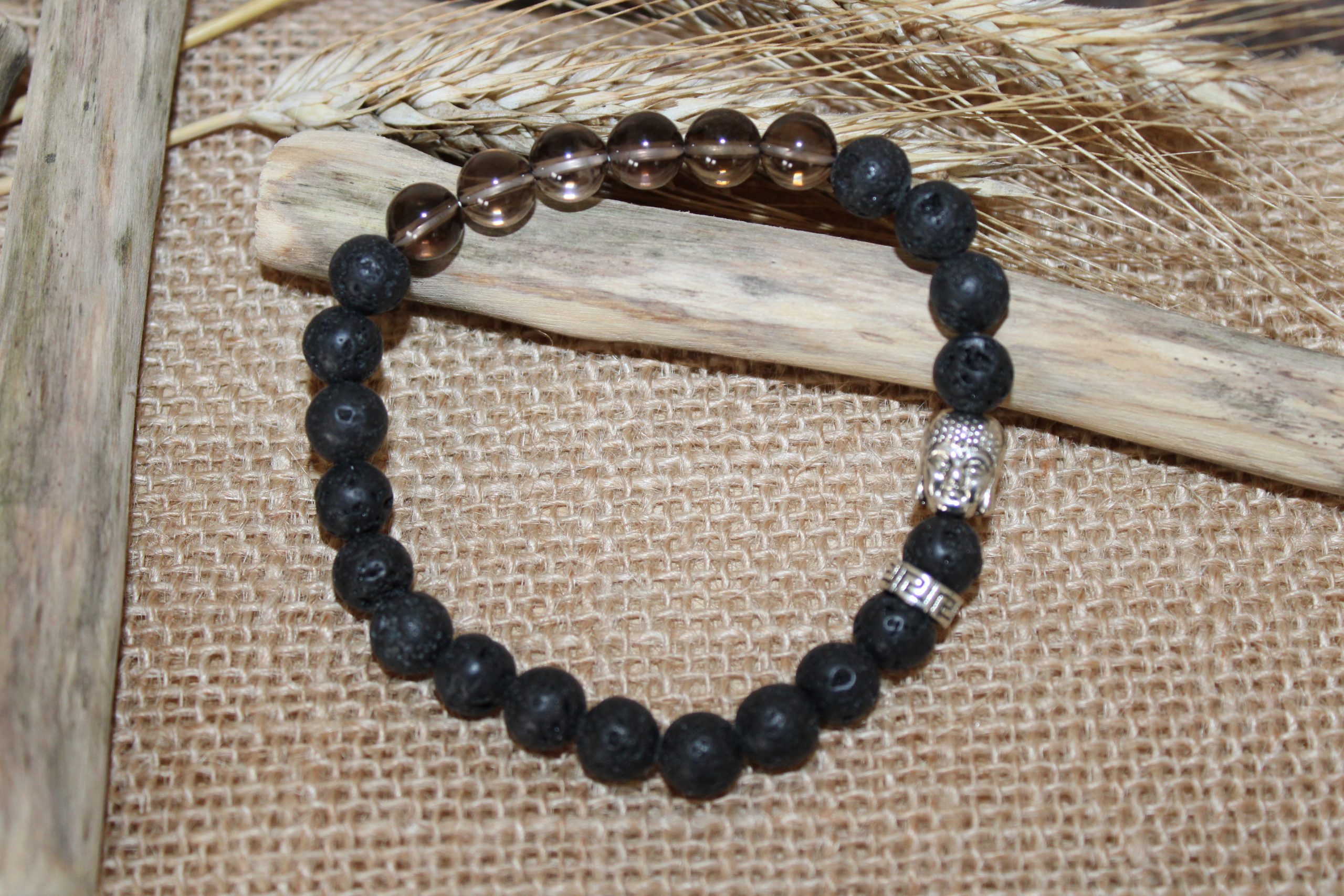 Bracelets fabriqués par plume étoilée avec des pierres naturelles (8 mm) de pierres de lave, quartz fumé et breloque Bouddha.