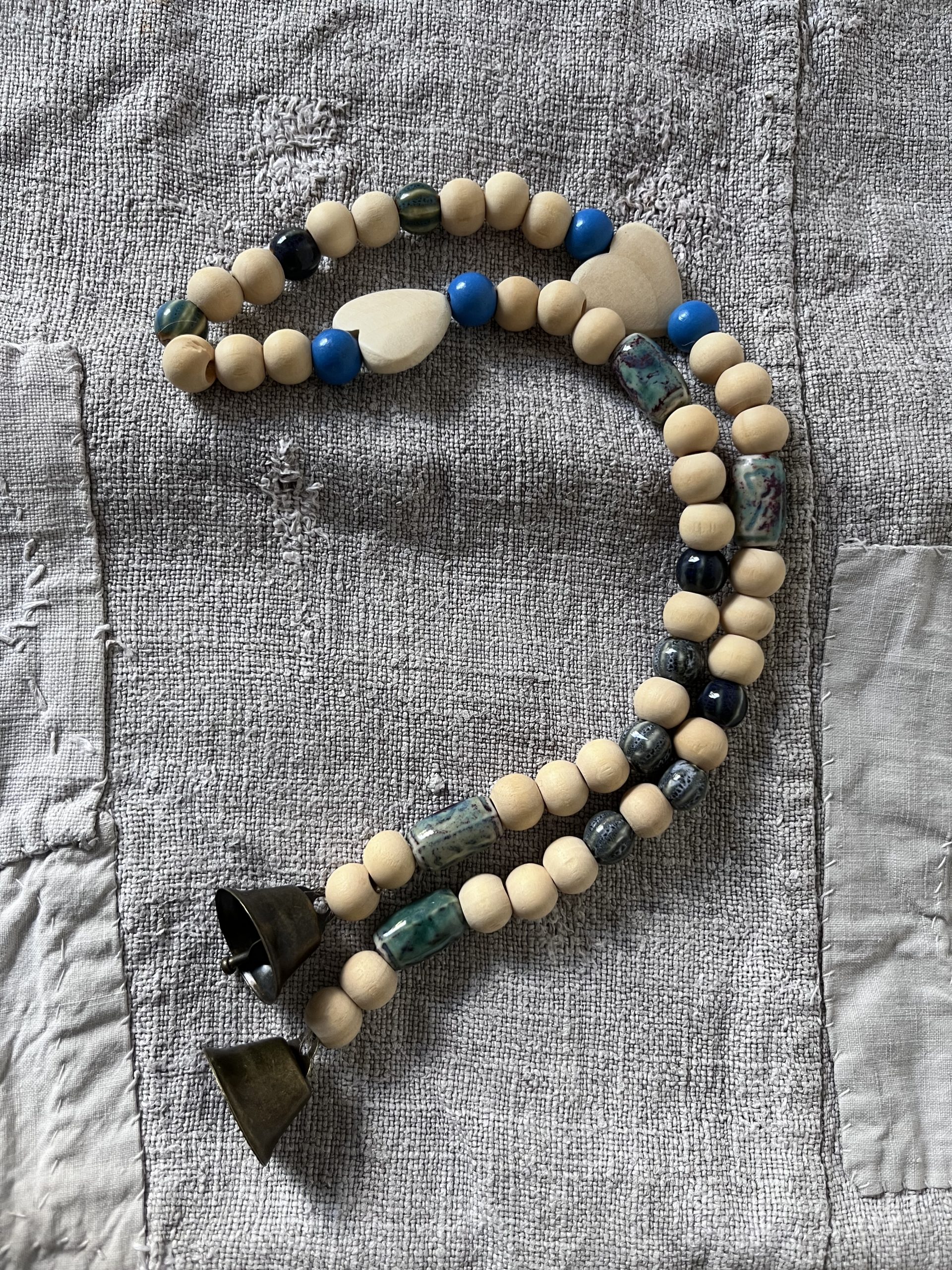– À : guirlande ton bleu composée de perles et cœurs en bois, perles en céramique et petites clochettes.