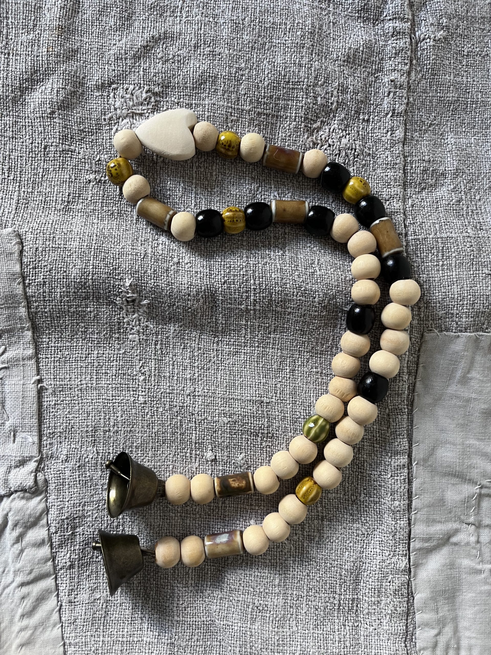 – C : guirlande ton moutarde composée perles en bois, cœur et petites clochettes.