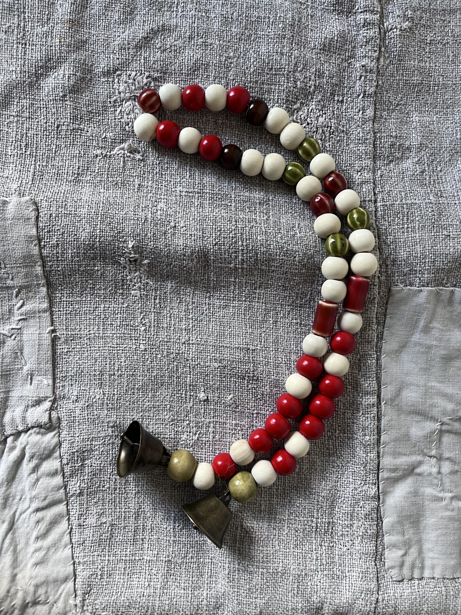 – B : guirlande ton rouge composée de perles en bois, perles en céramique et petites clochettes.
