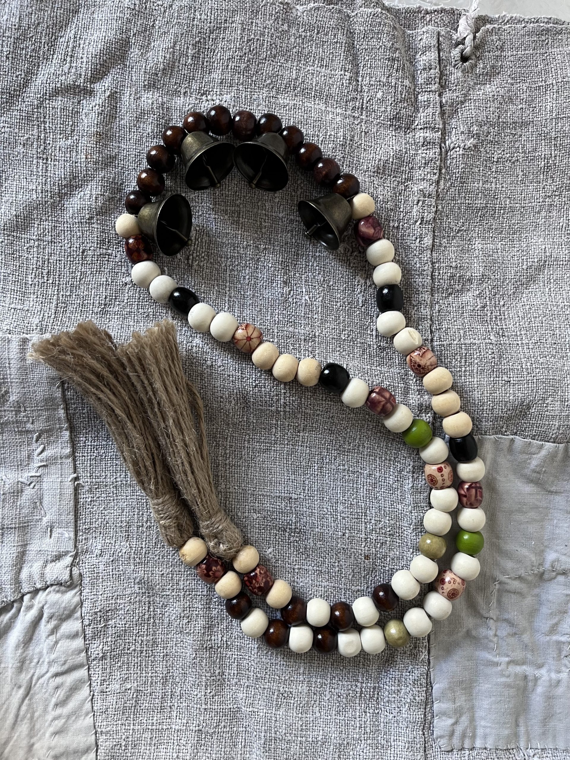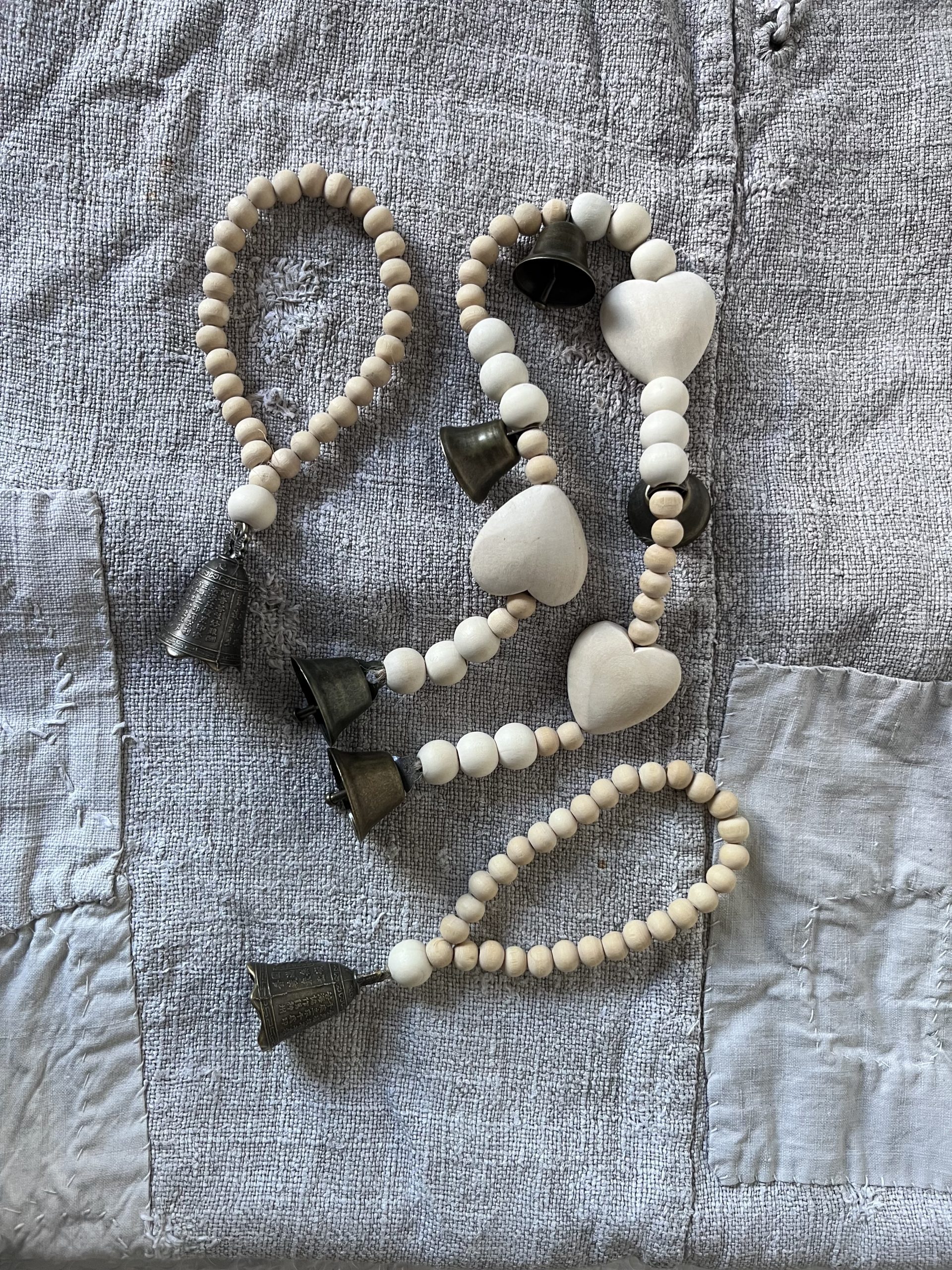 – G : 2 décorations de porte en perles en bois avec cloches et petite guirlande composée de perles et cœurs en bois, petites clochettes.