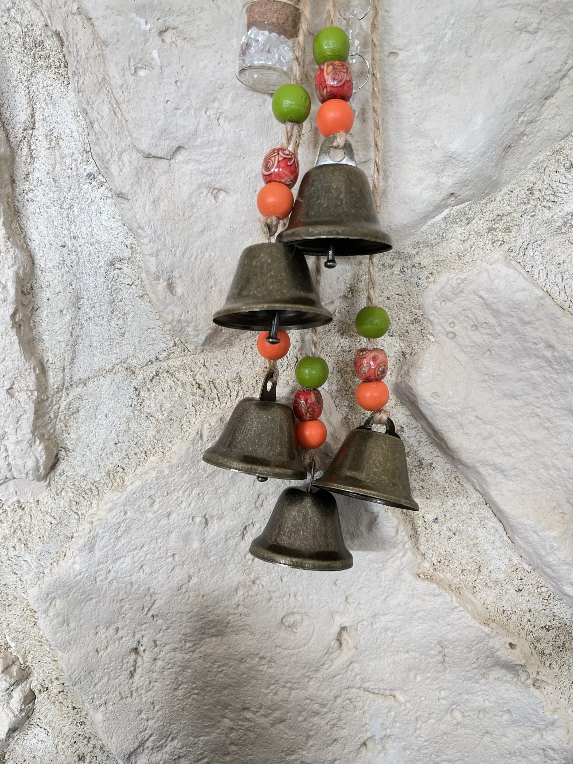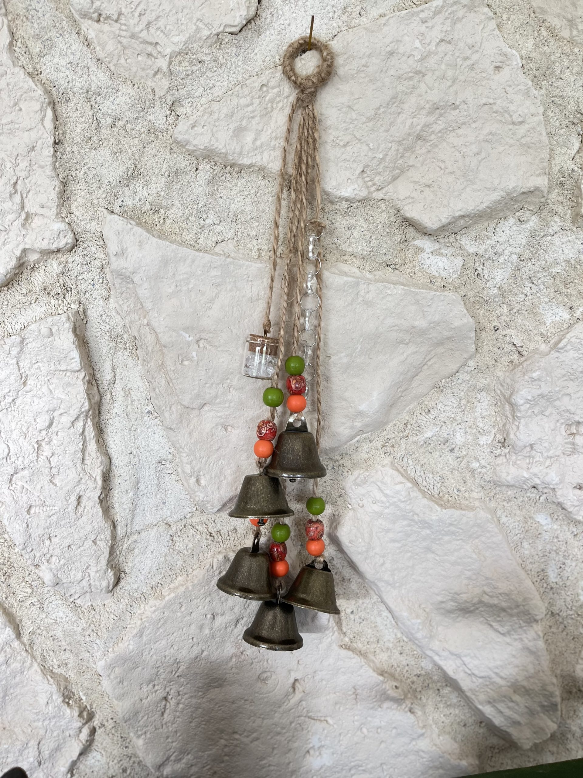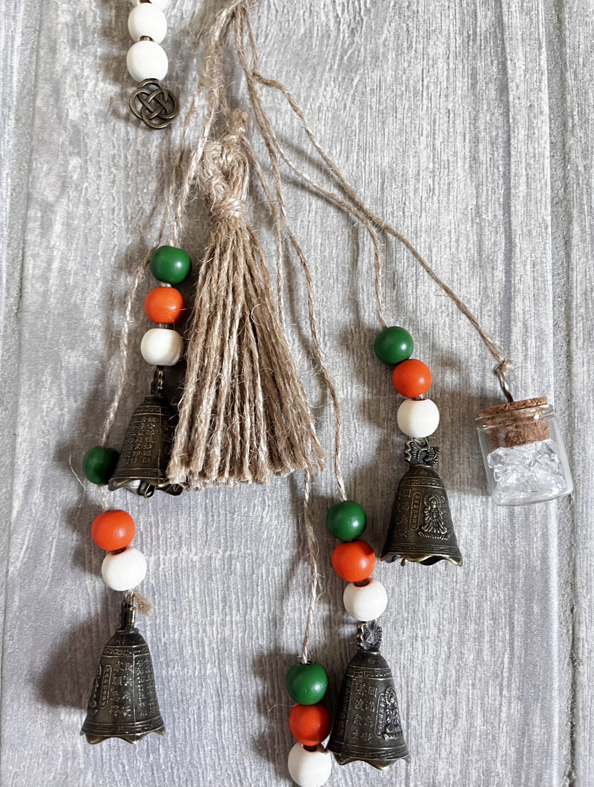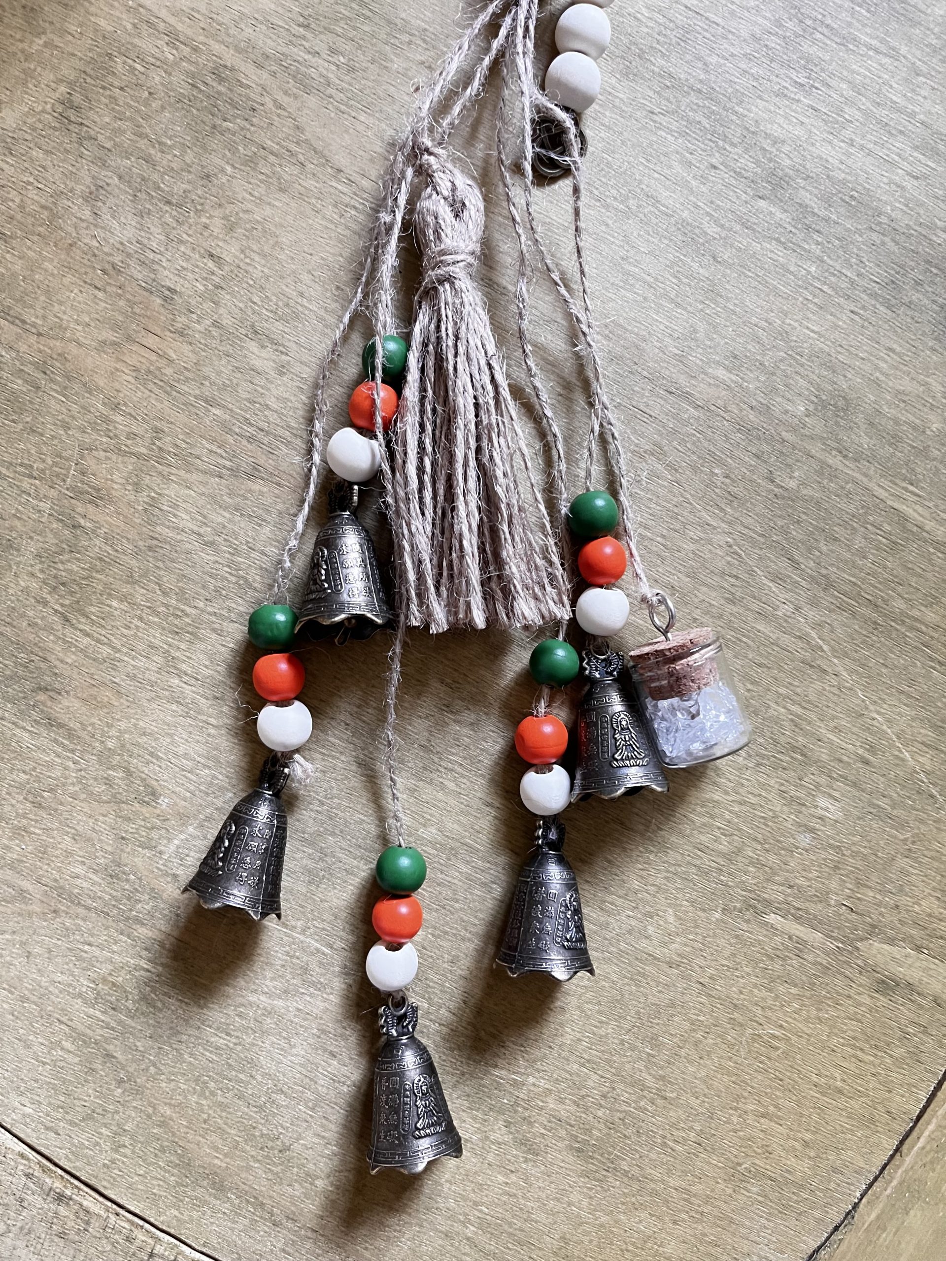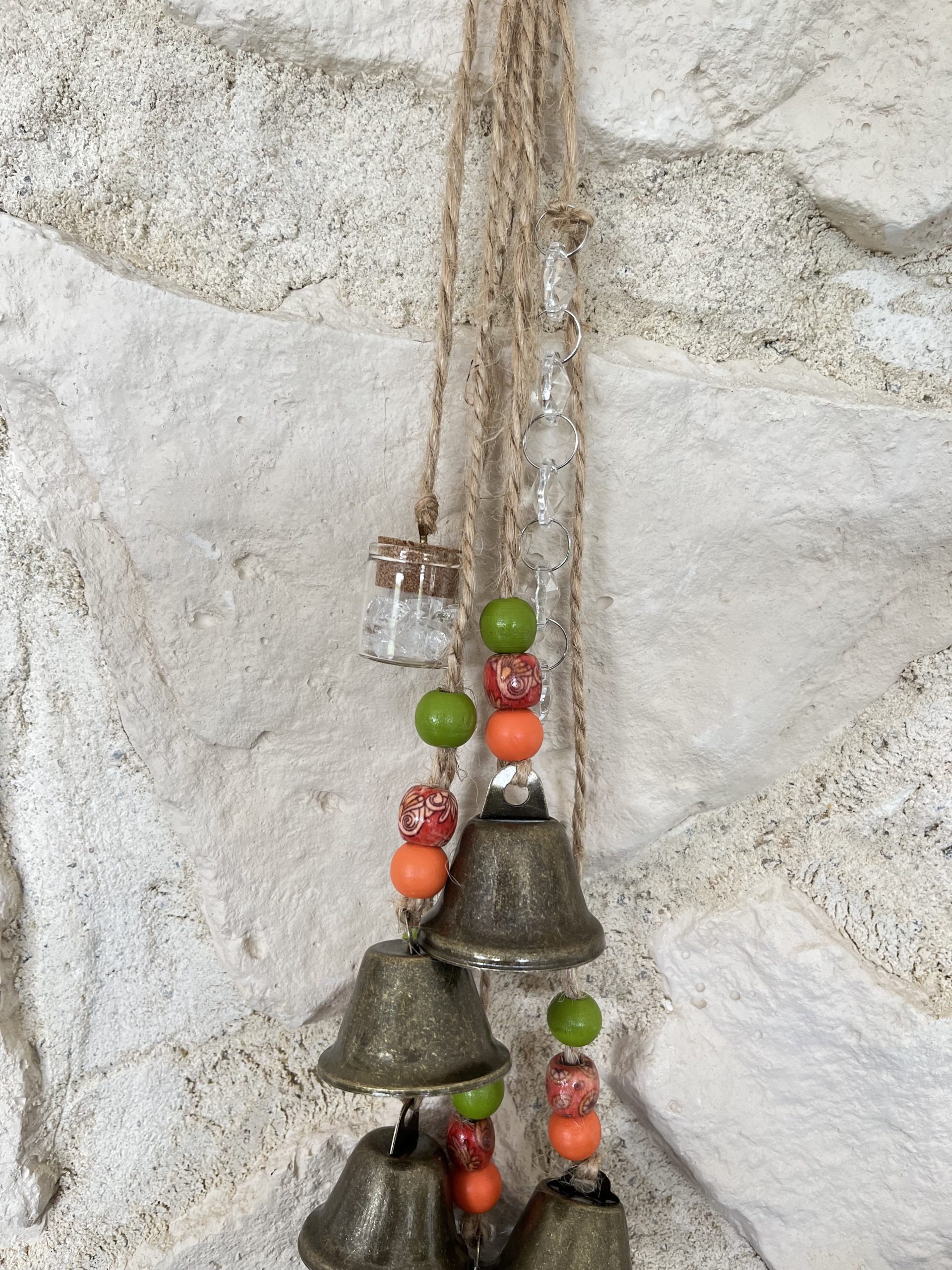 – 3 : perles en bois de couleur (oranges, vertes, fleuries) cloches moyennes, petite fiole de cristal et capteur de soleil.