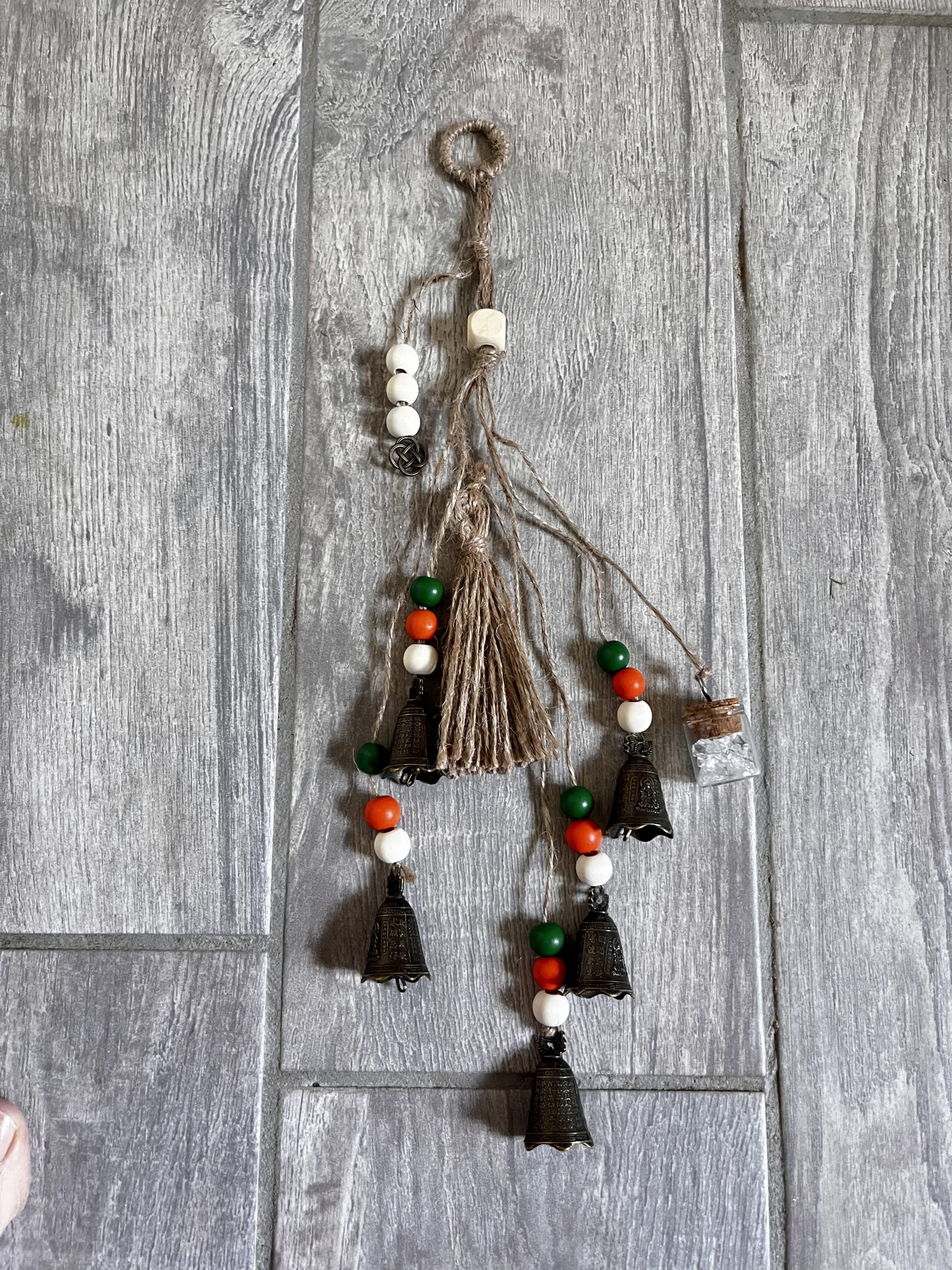 – 2 : perles en bois, breloques, petites cloches, pompon, petite fiole de cristal concassé.