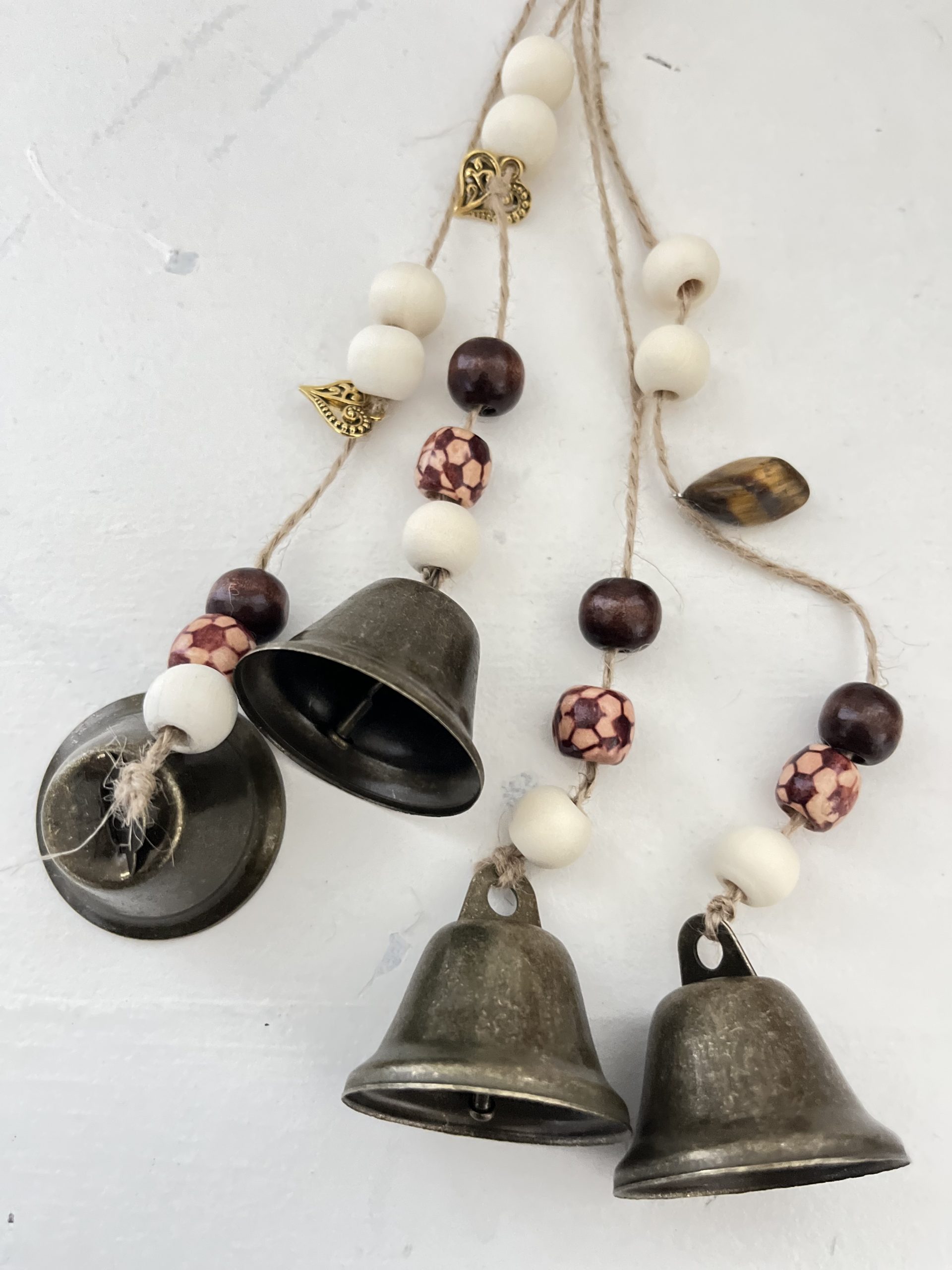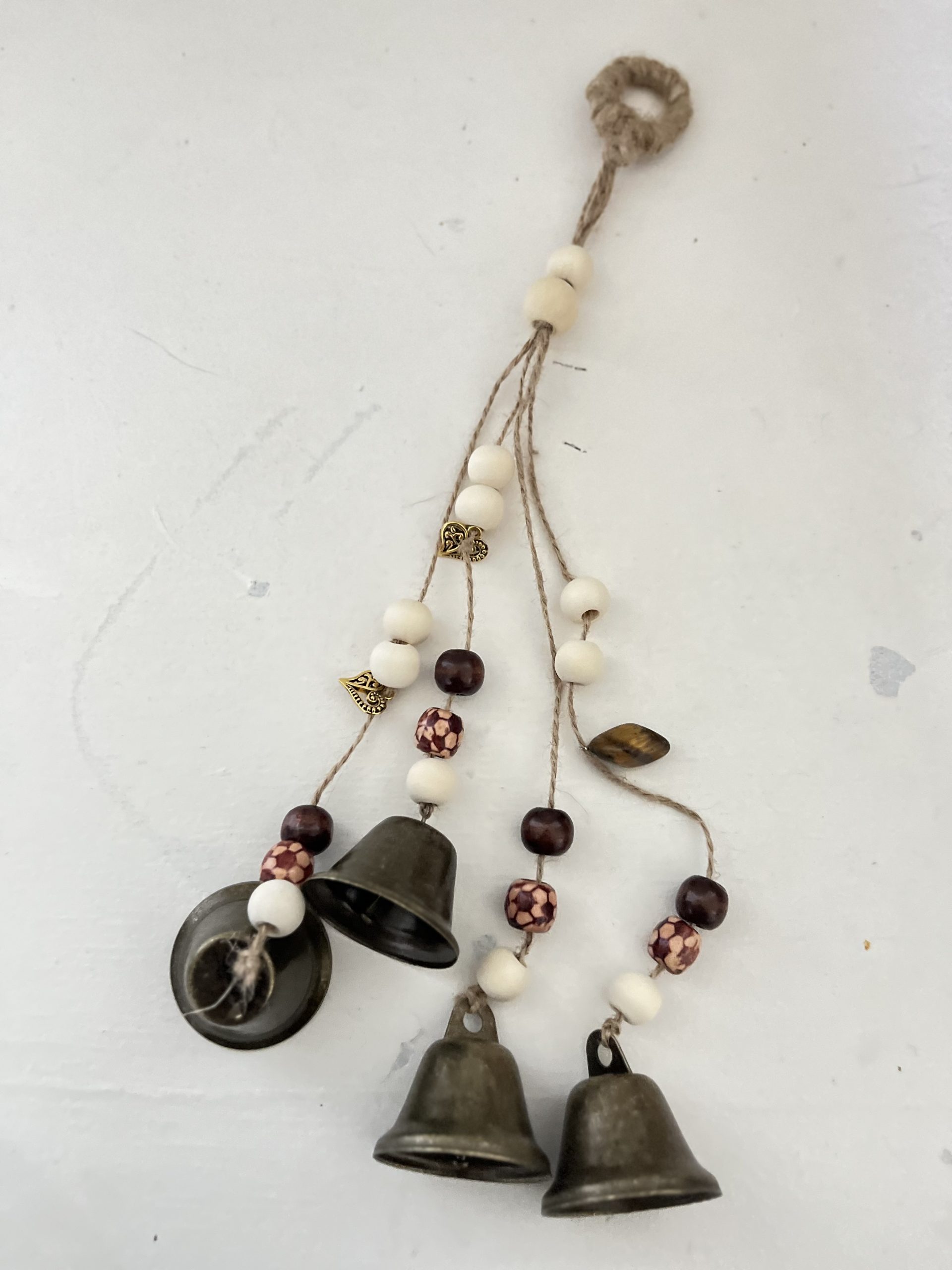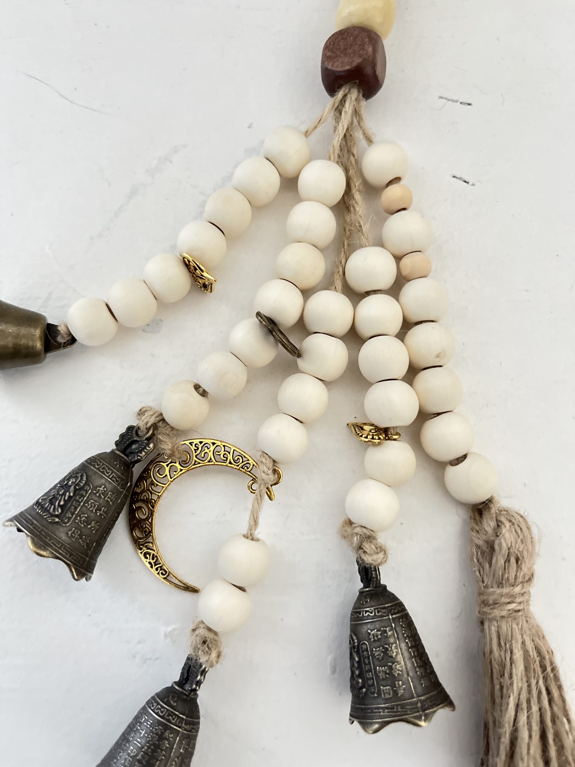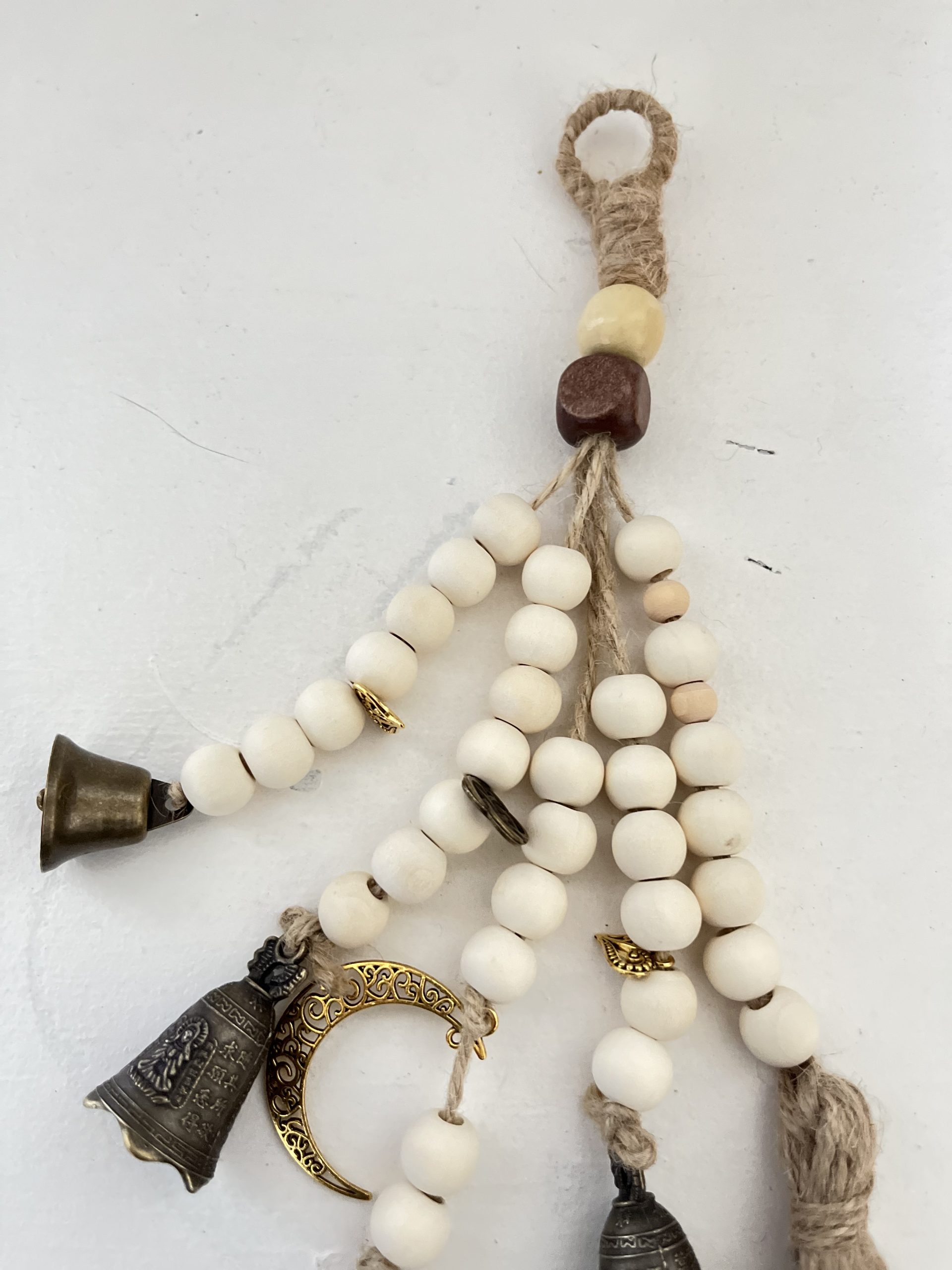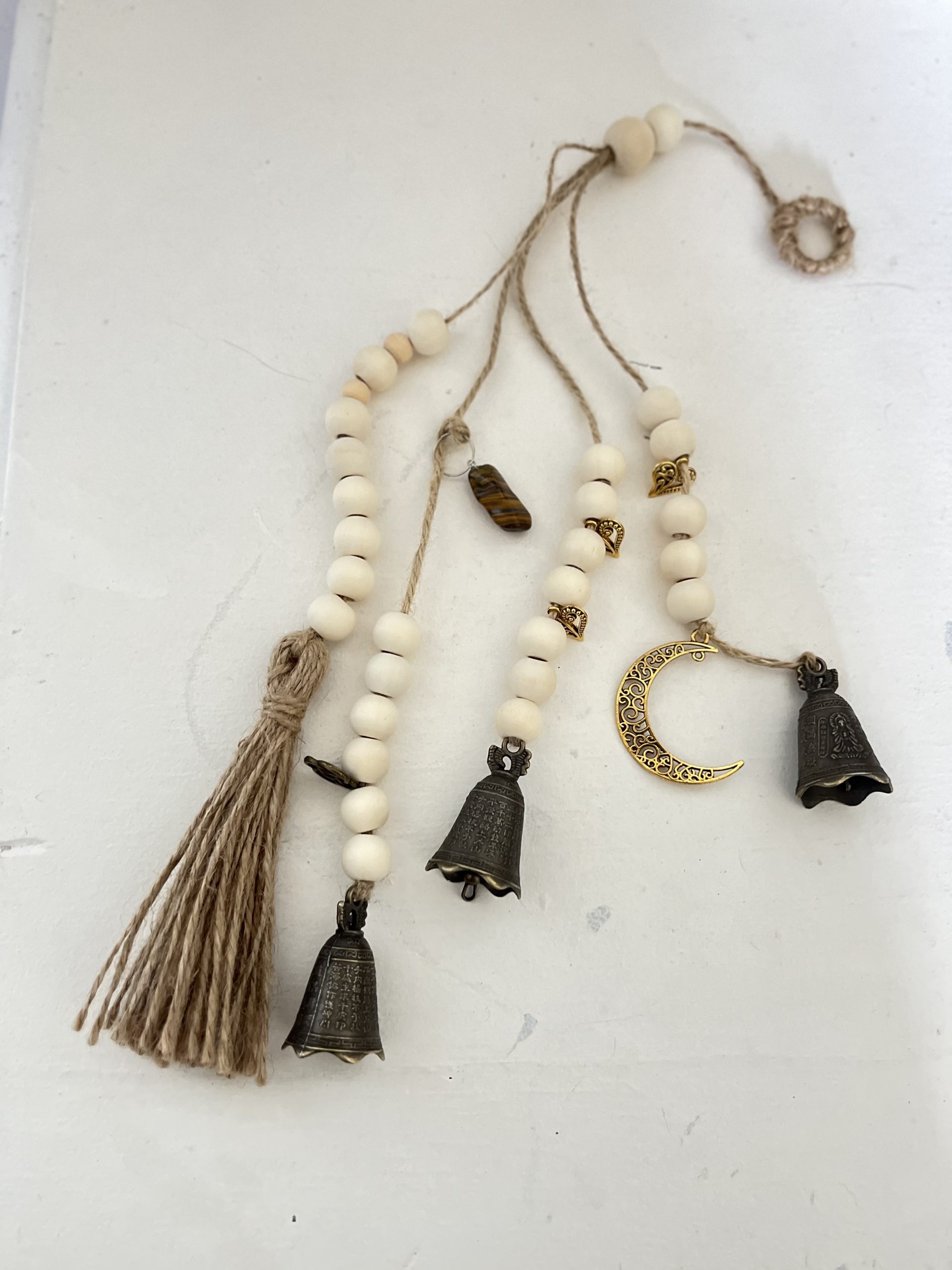 – 4 : perles en bois, cloches moyennes, œil de tigre, breloques. Hauteur : 32 cm.