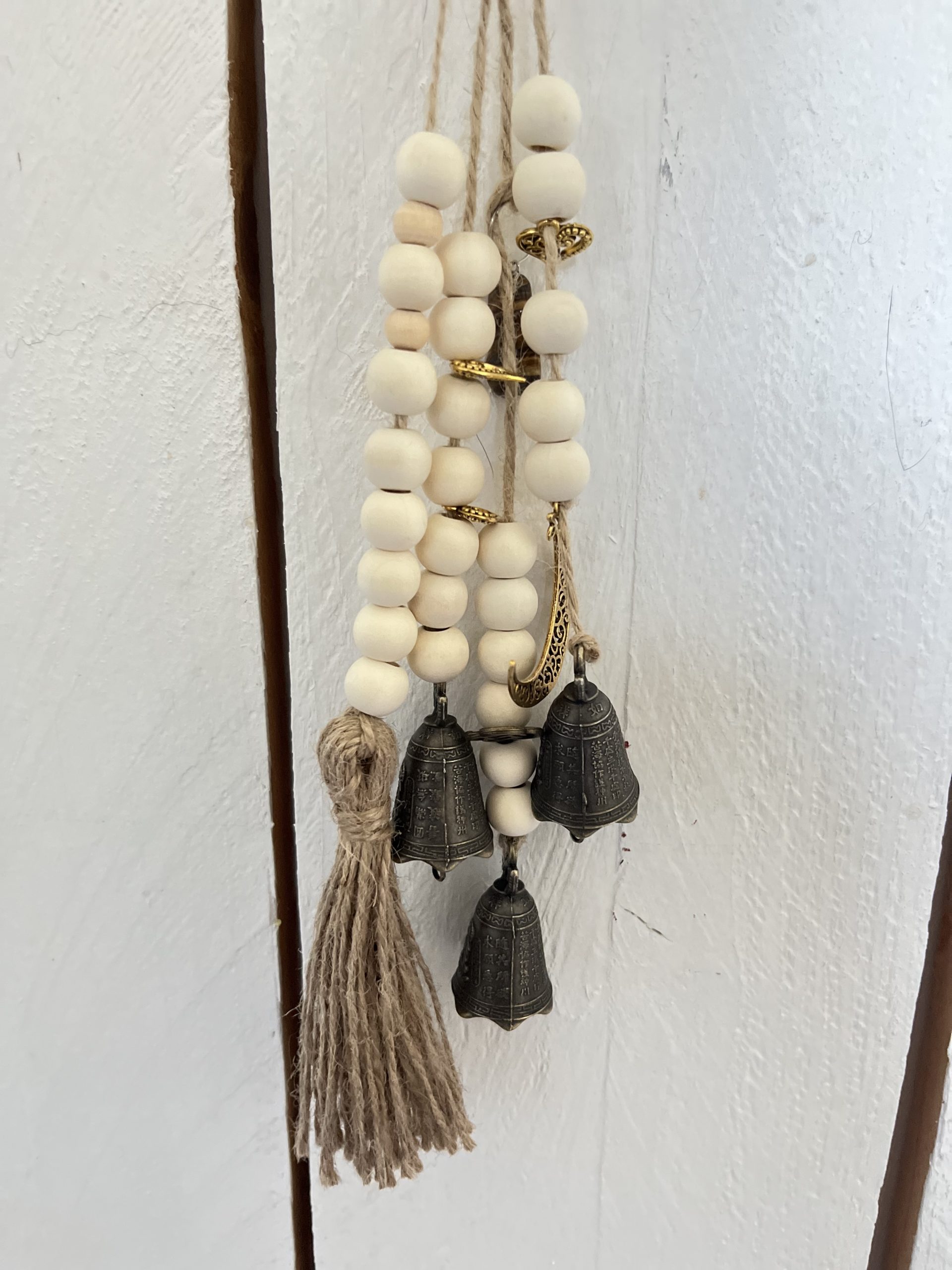 – 1 : perles en bois, breloques, pompon et petites cloches. Hauteur 29 cm.