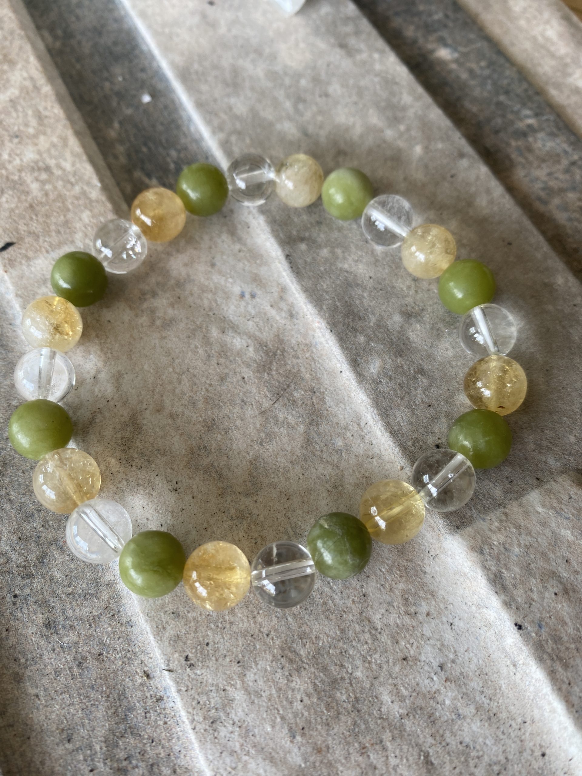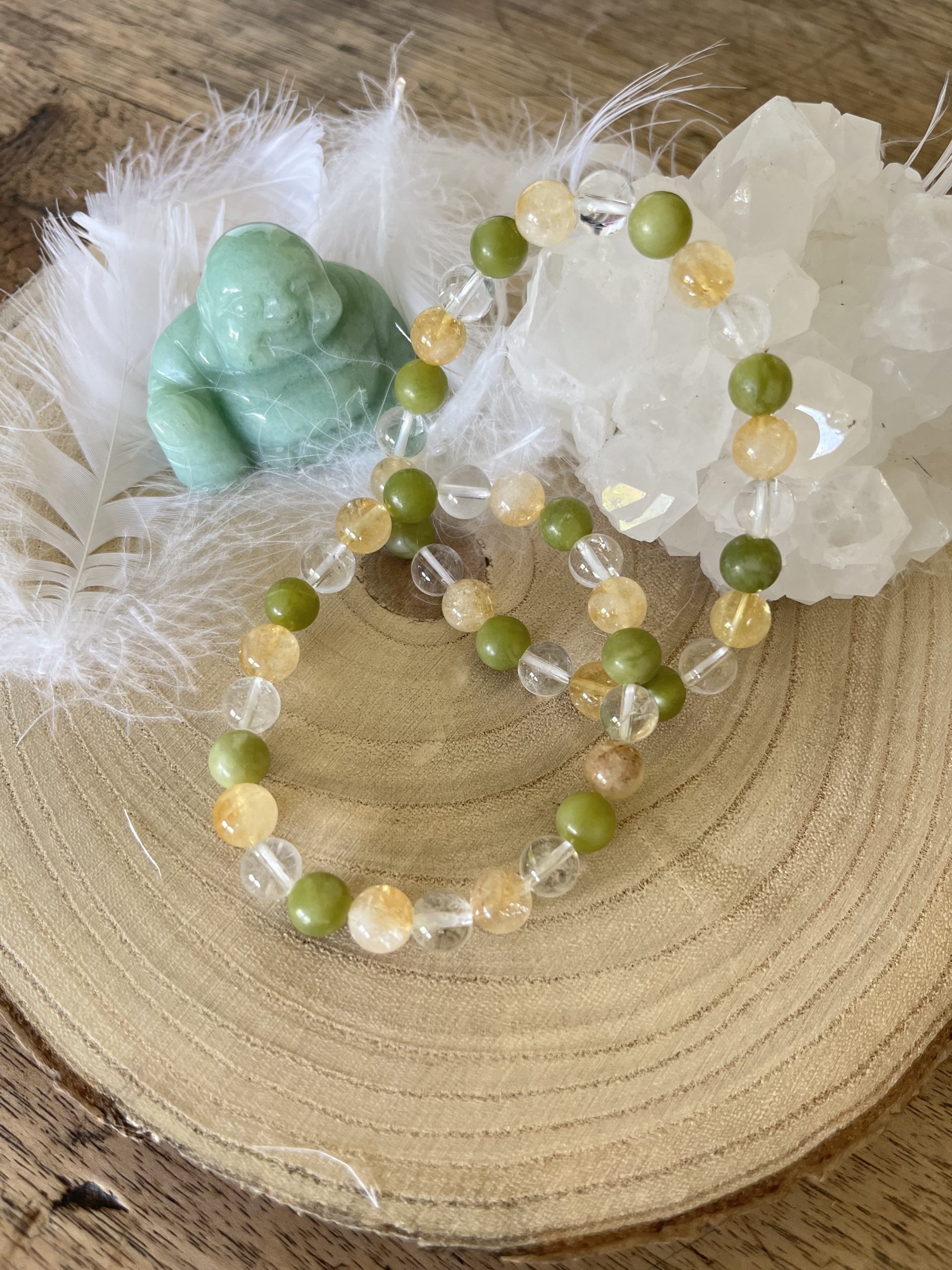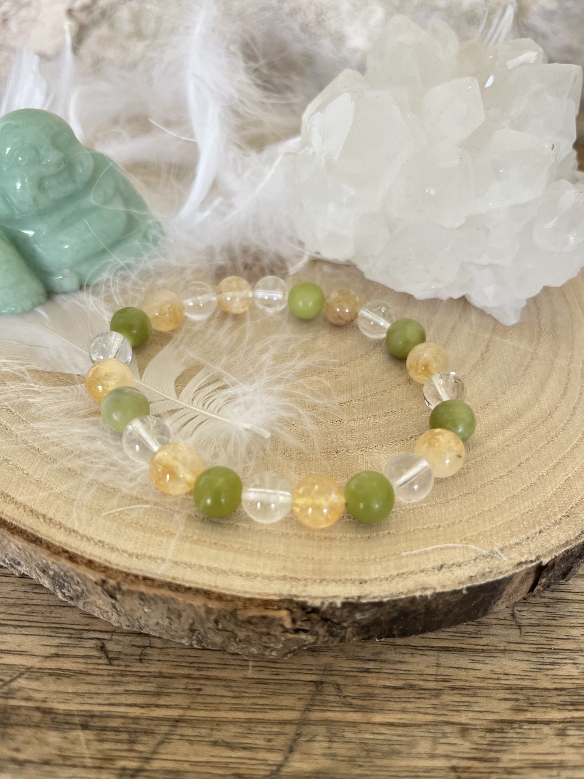 Bracelet en jade de Chine, en citrine et cristal de roche fabriqué par plume étoilée avec des pierres naturelles de 8 mm.