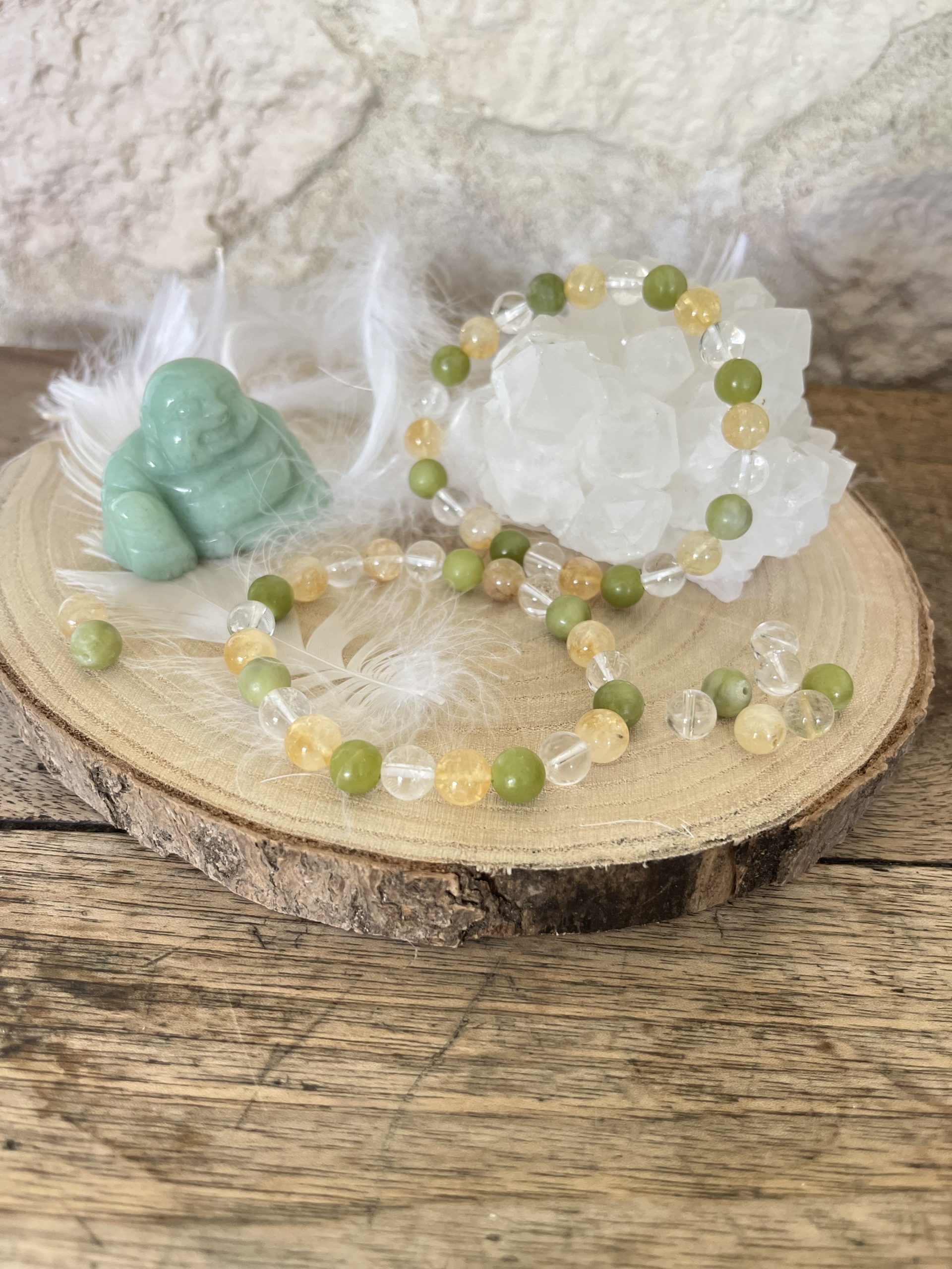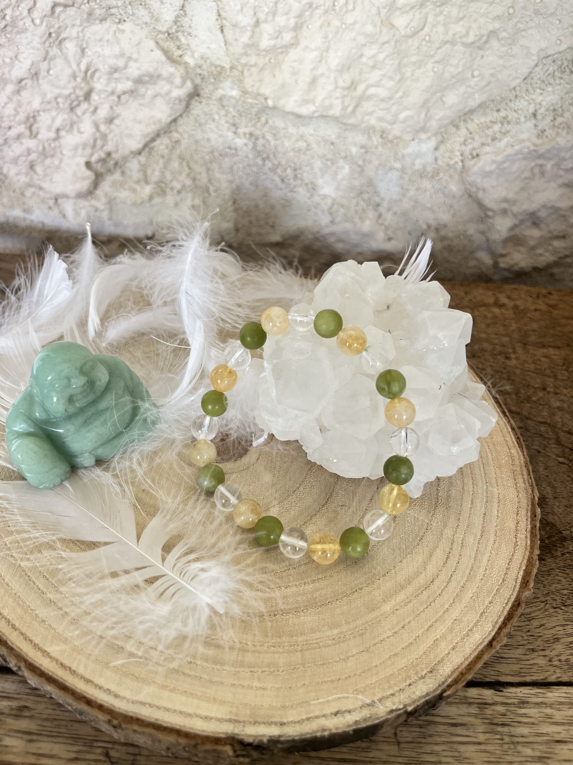 La combinaison de jade, citrine et cristal de roche est particulièrement puissante en lithothérapie, car chaque pierre possède des propriétés uniques qui se complètent harmonieusement.