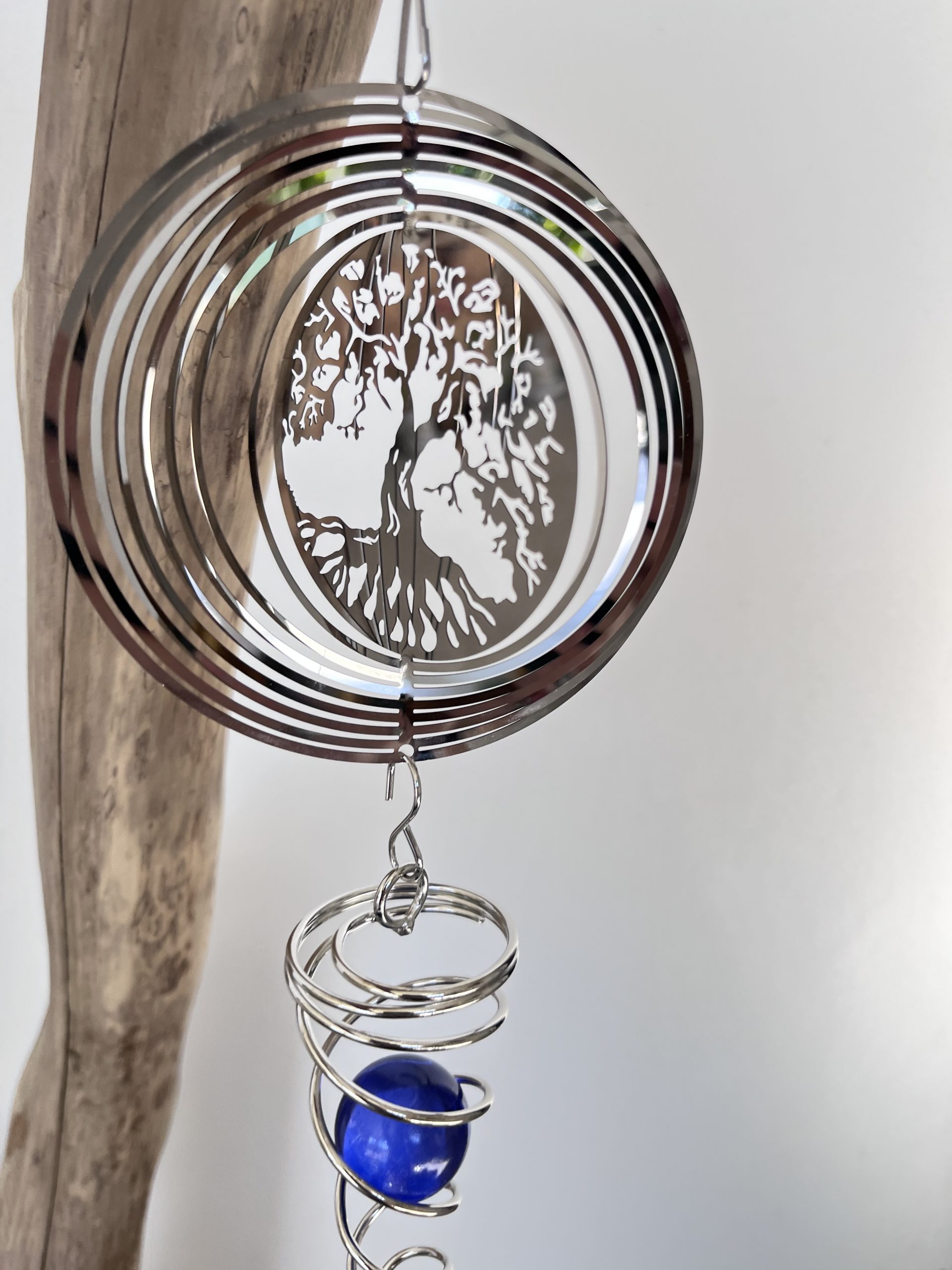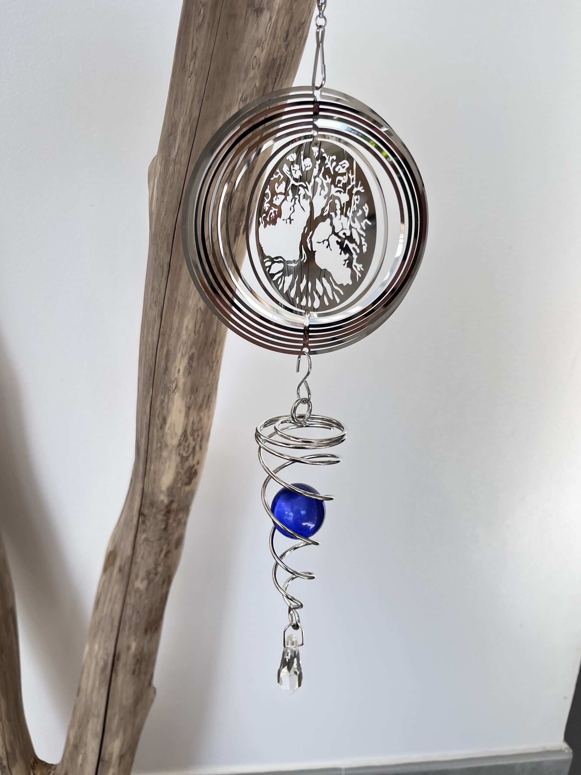 – Mobile acier 3D acier, arbre de vie, spirale boule bleue.