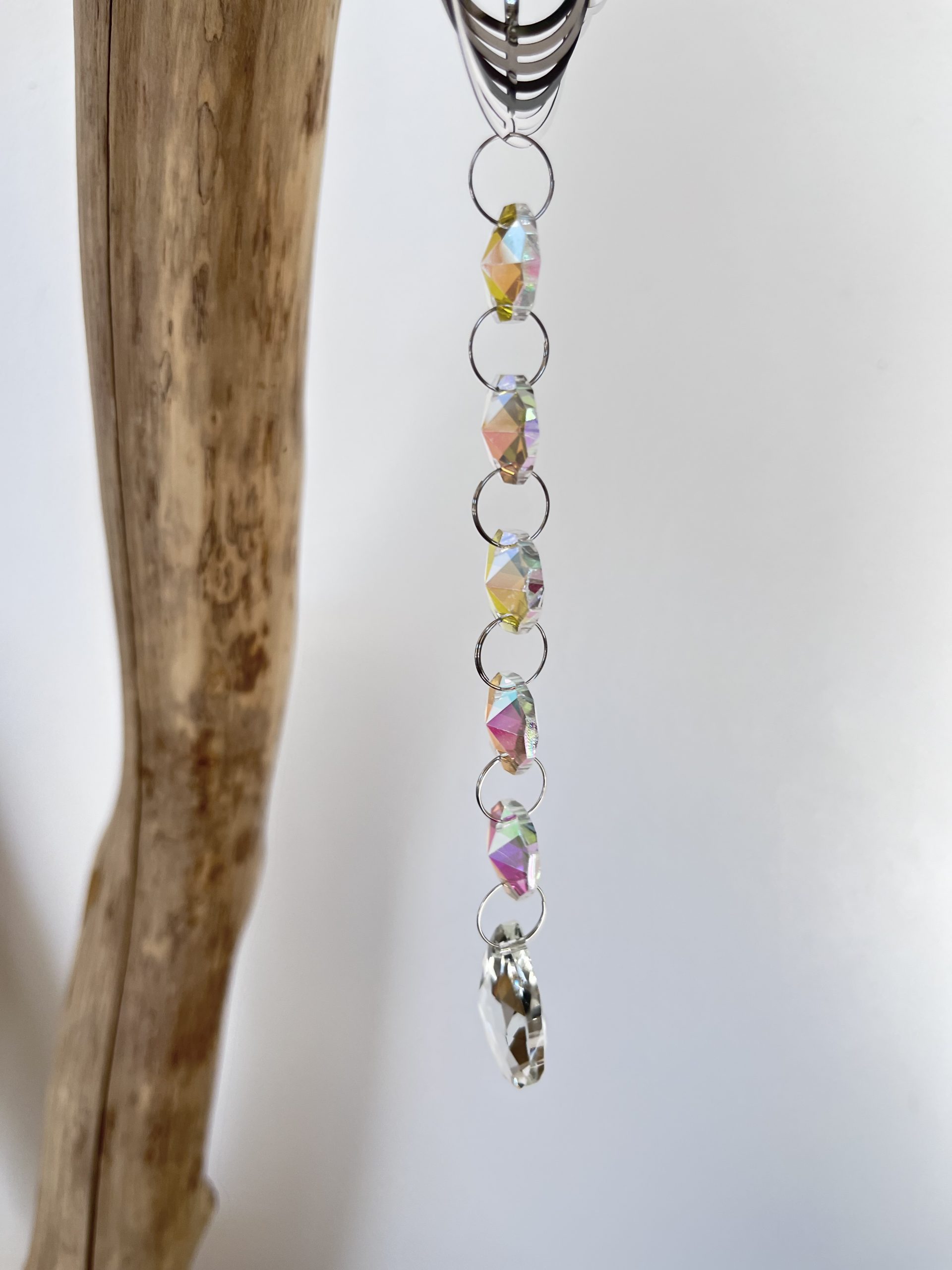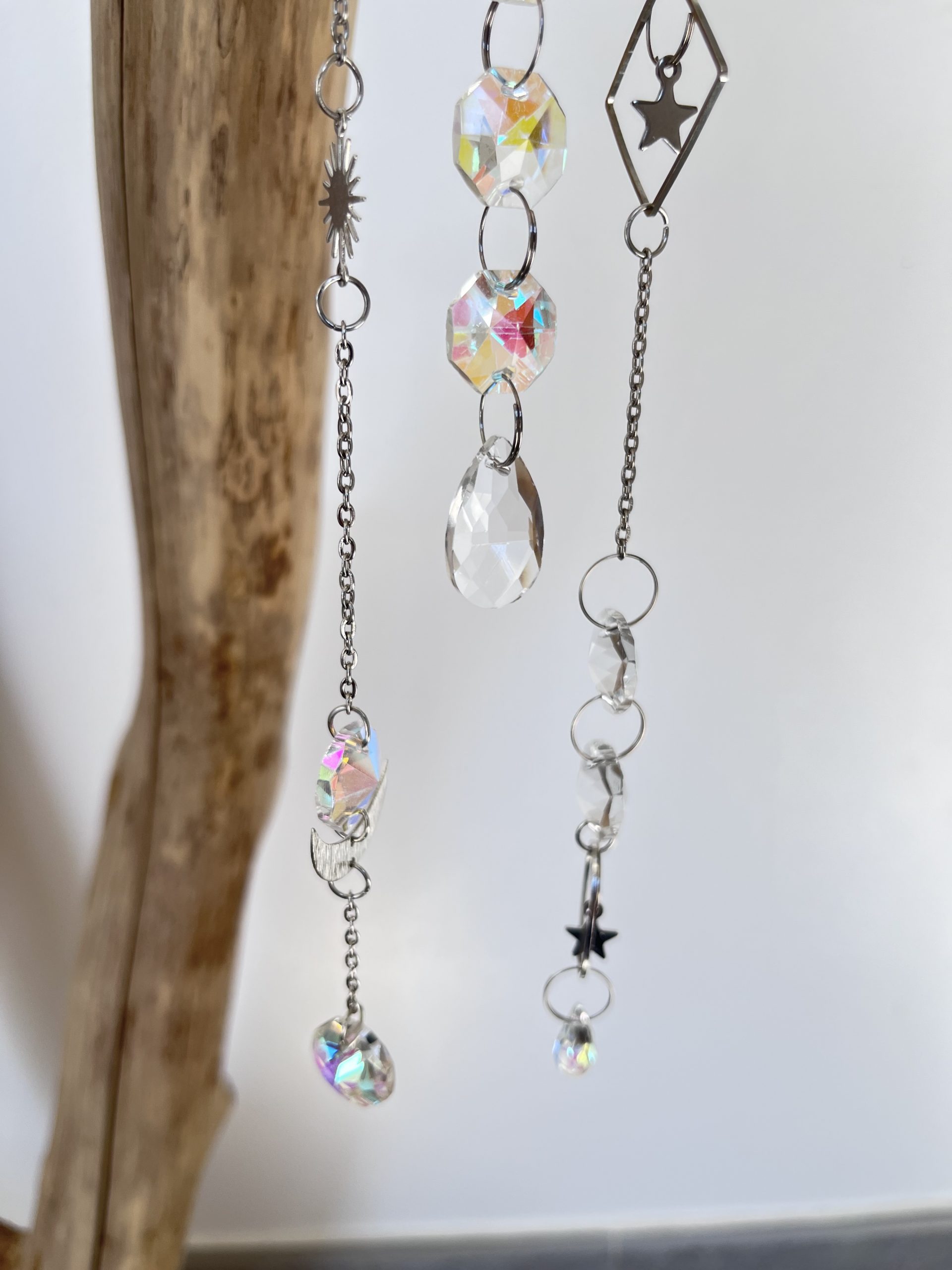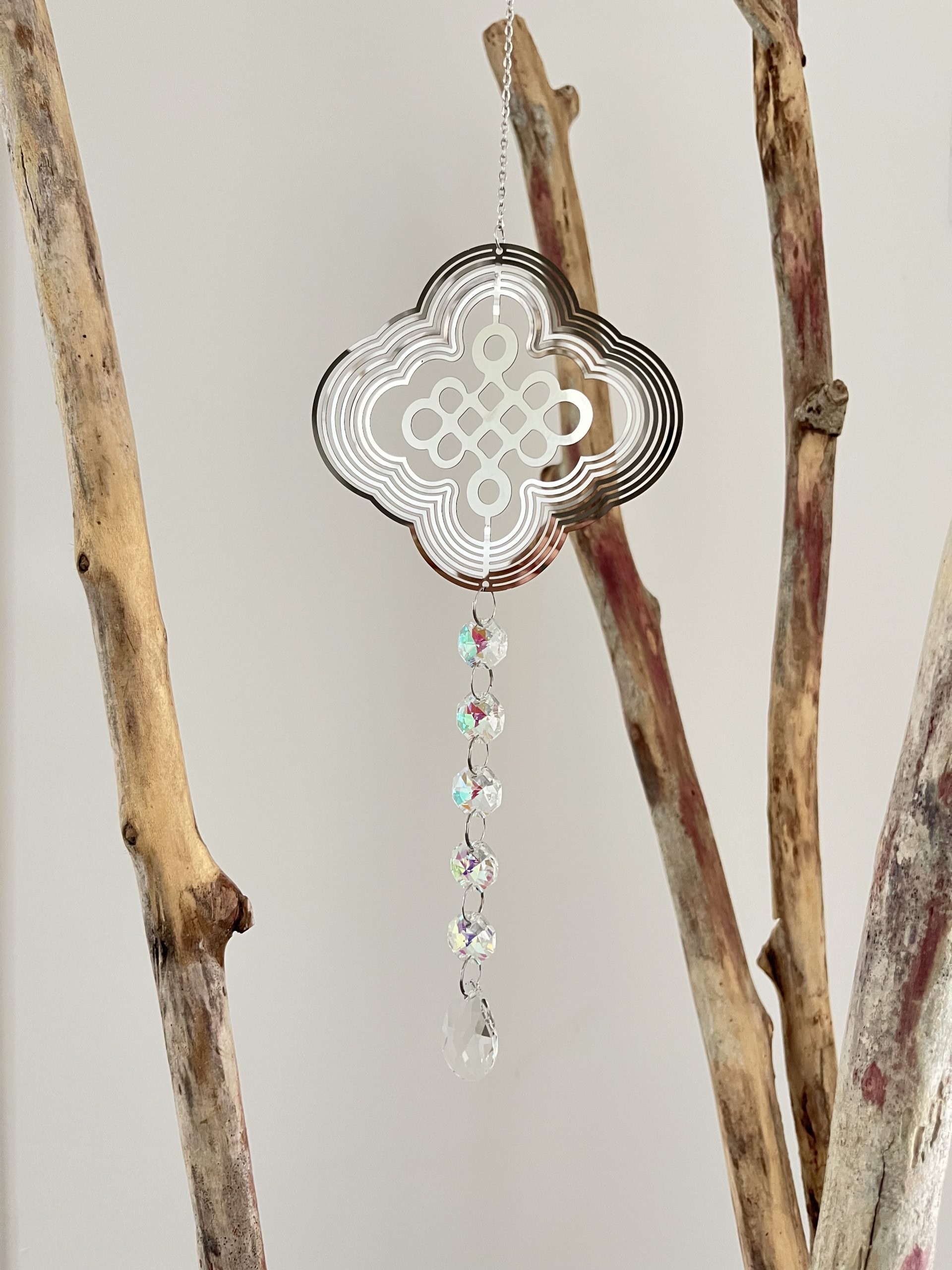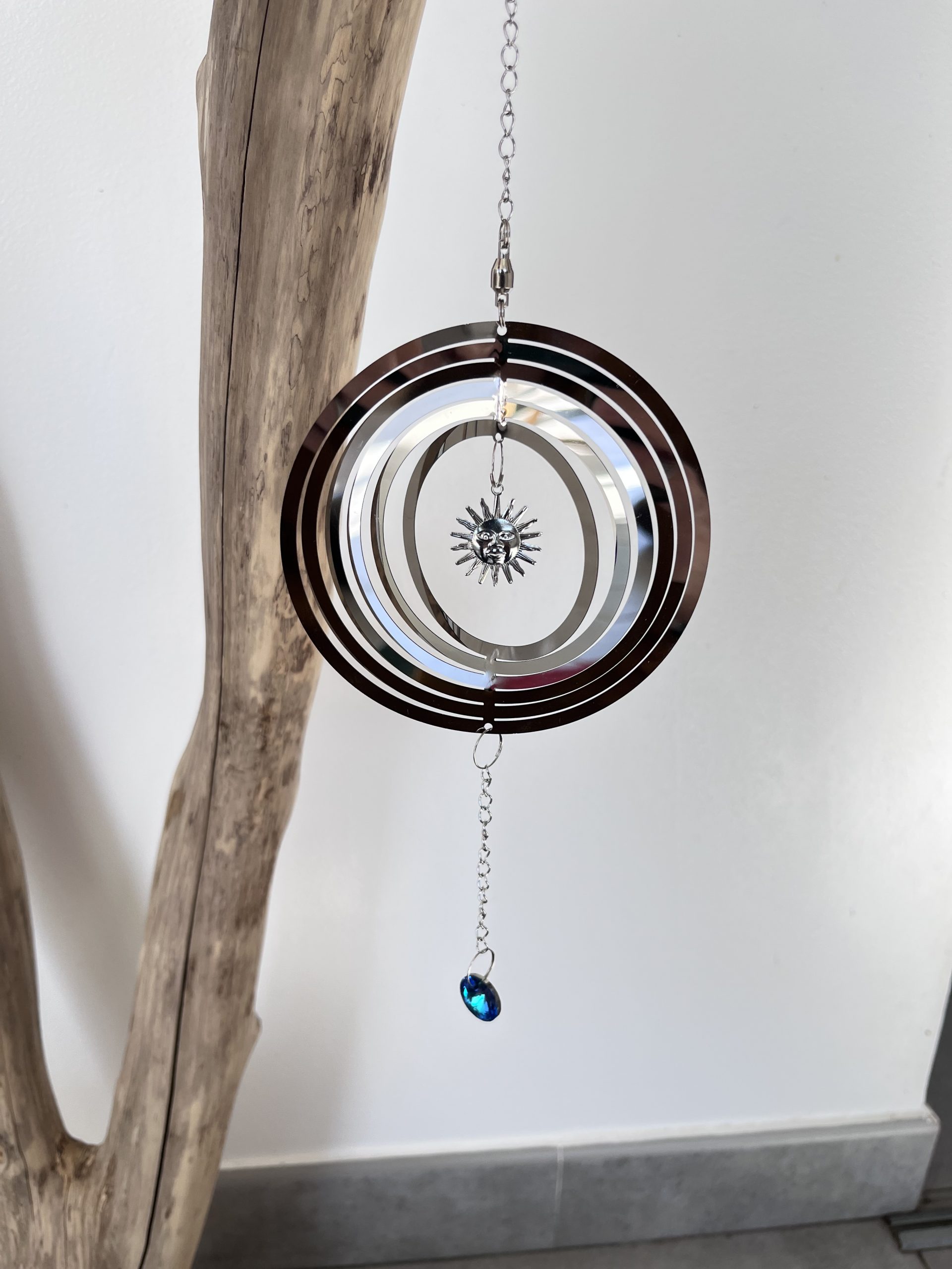Apportez une touche de magie lumineuse à votre espace avec ce mobile 3D en acier inoxydable. Ses formes géométriques tournantes capturent la lumière tandis que le prisme suspendu diffuse des reflets arc-en-ciel apaisants. Parfait pour une véranda, une fenêtre ensoleillée ou un coin zen extérieur.