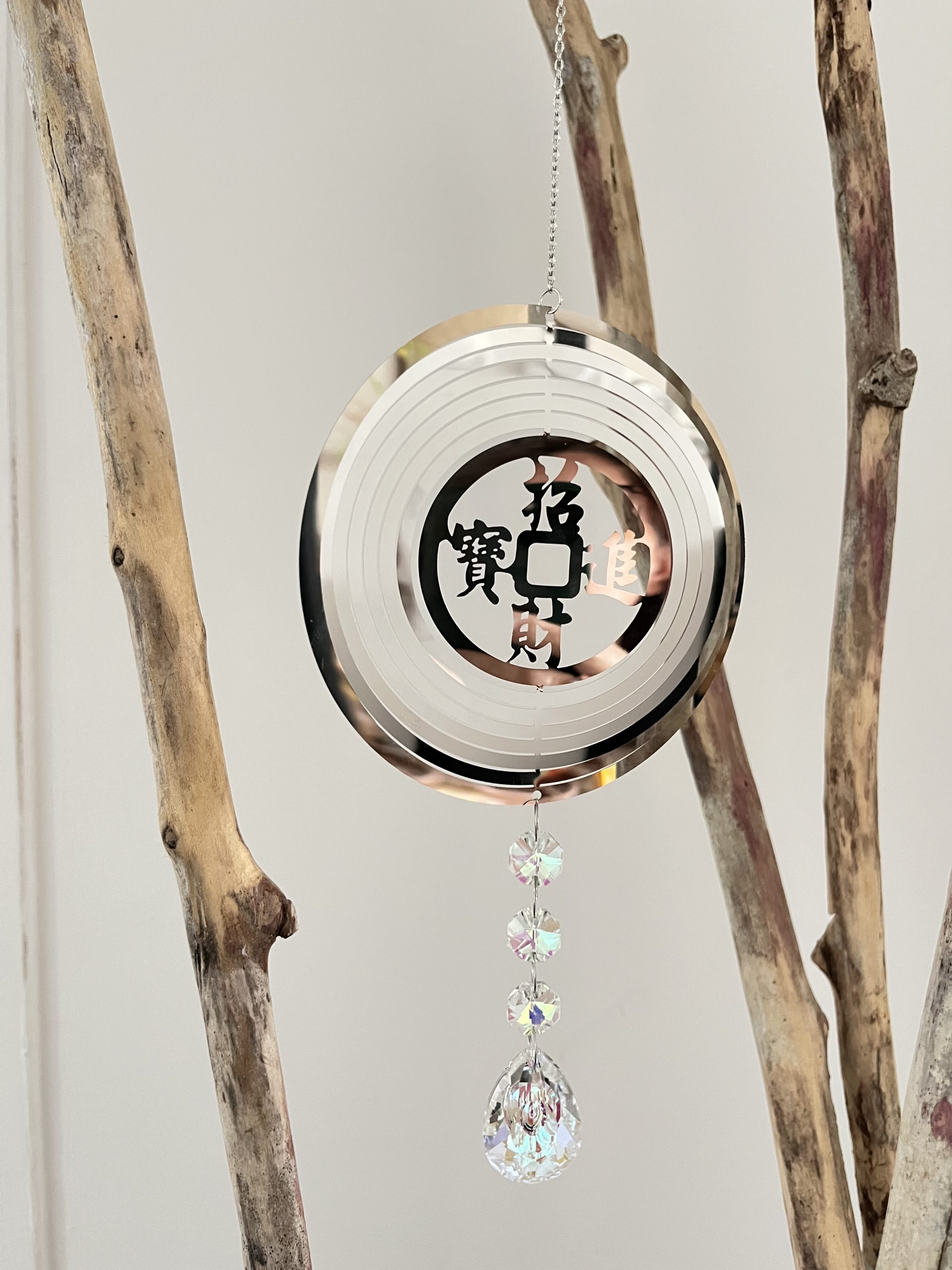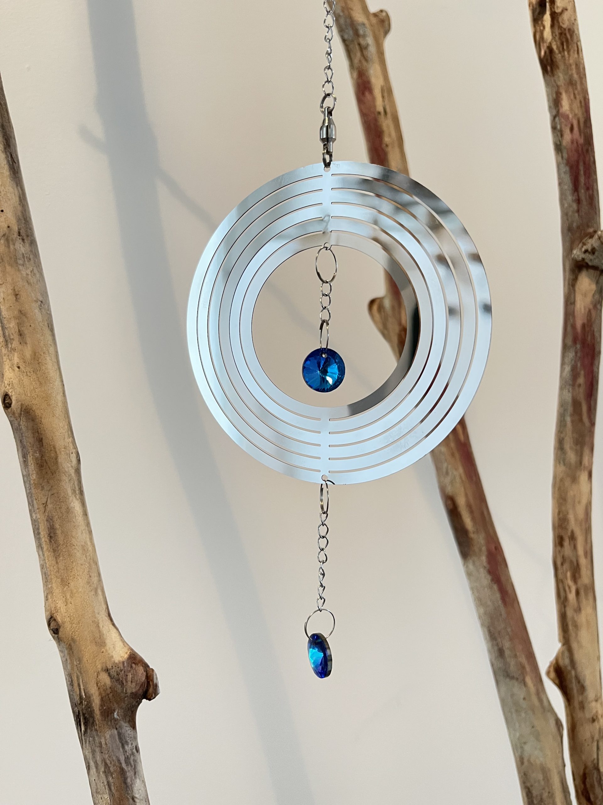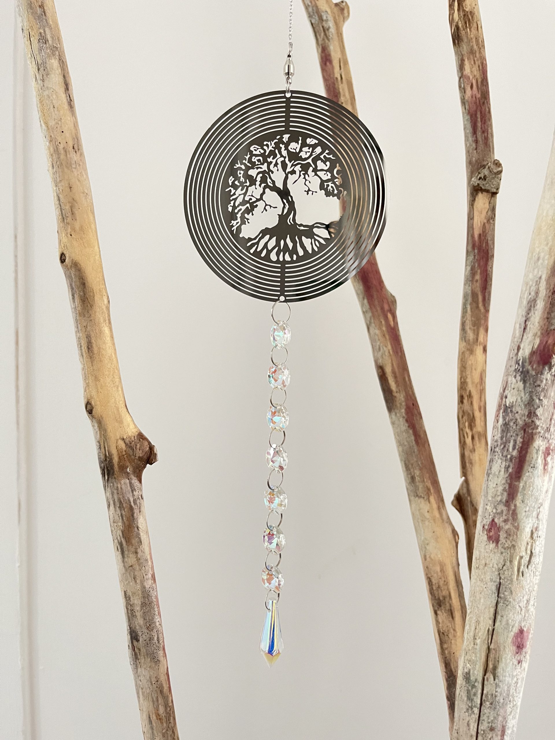 Apportez une touche de magie lumineuse à votre espace avec ce mobile 3D en acier inoxydable. Ses formes géométriques tournantes capturent la lumière tandis que le prisme suspendu diffuse des reflets arc-en-ciel apaisants. Parfait pour une véranda, une fenêtre ensoleillée ou un coin zen extérieur.