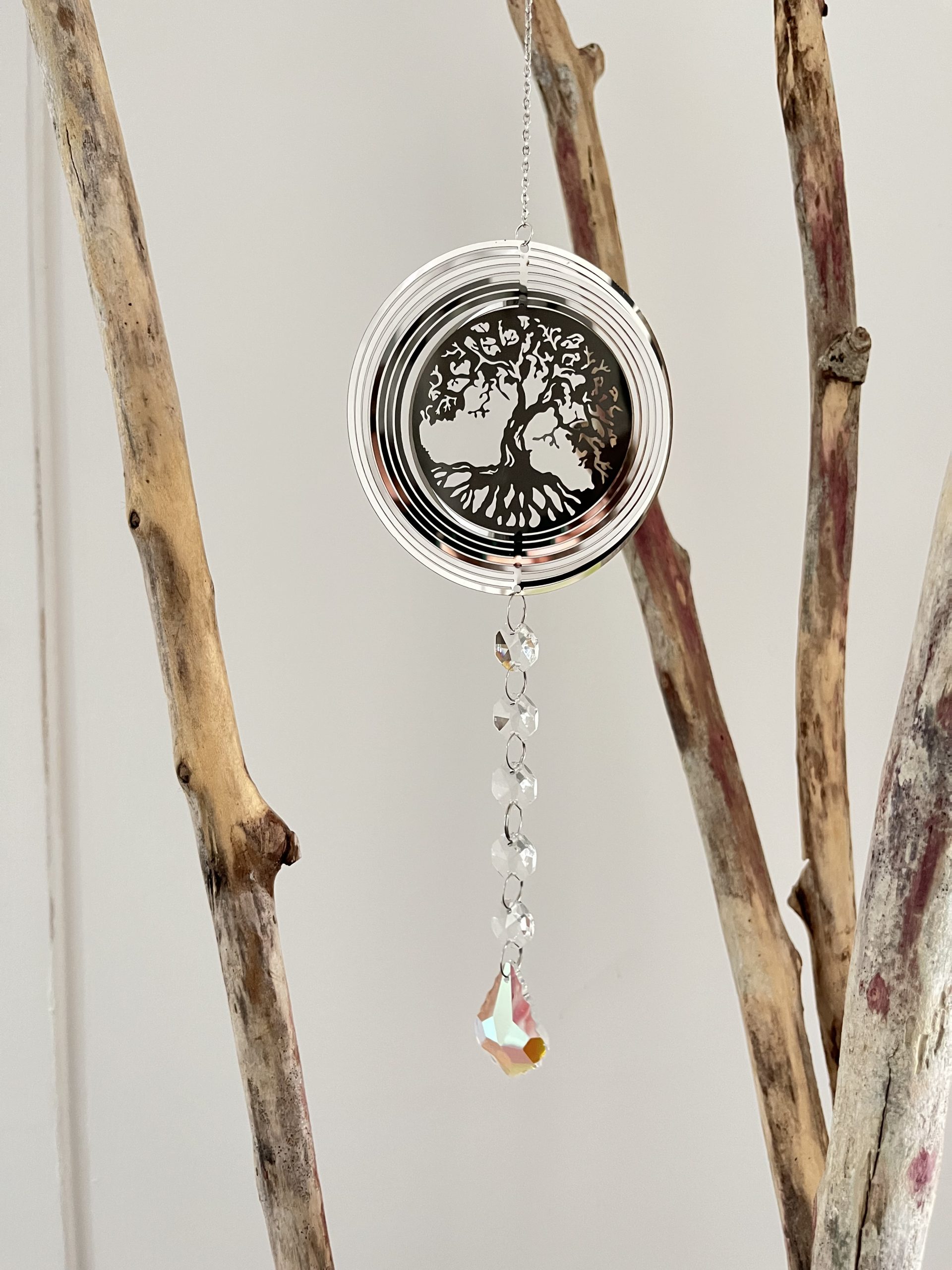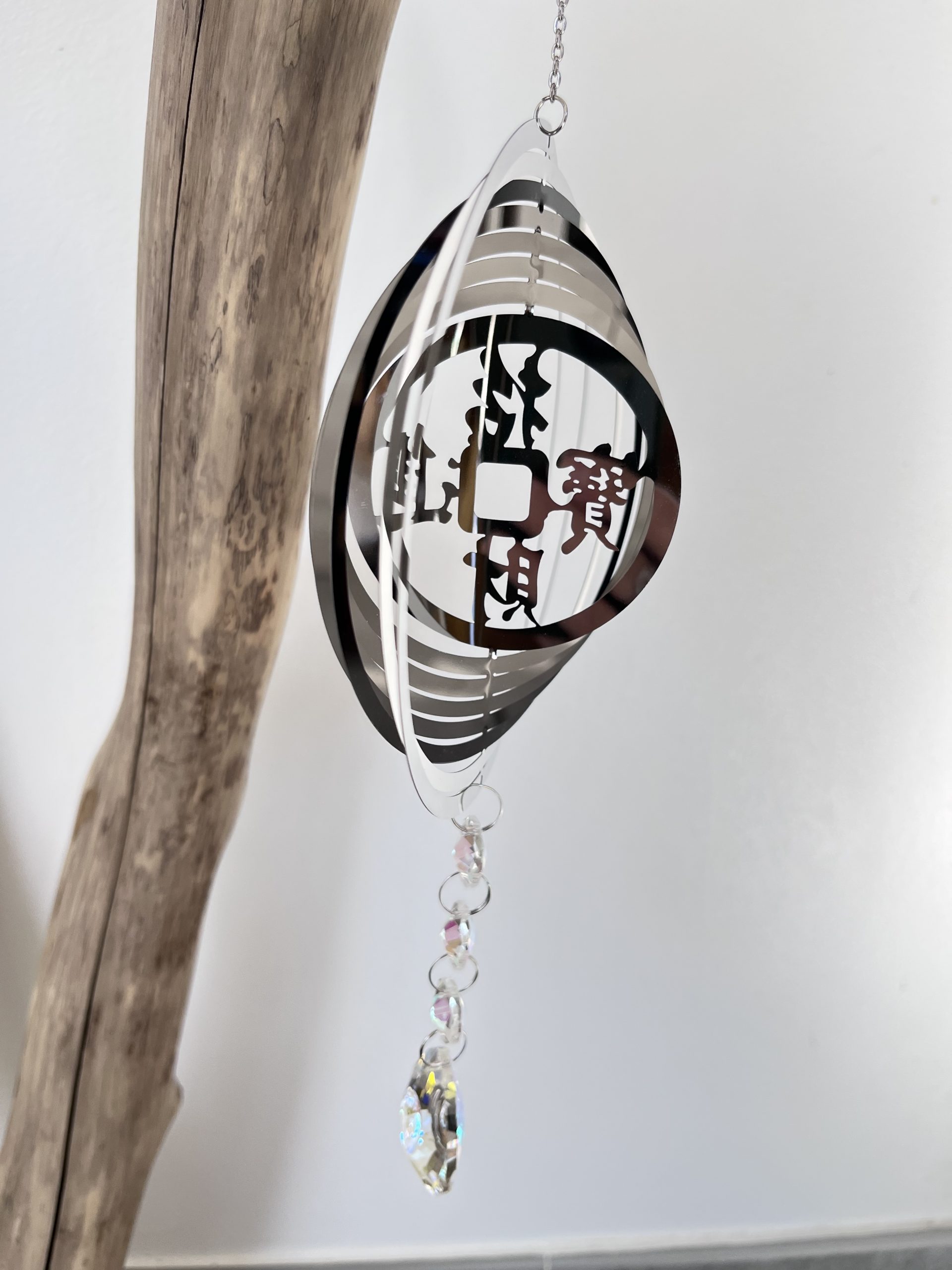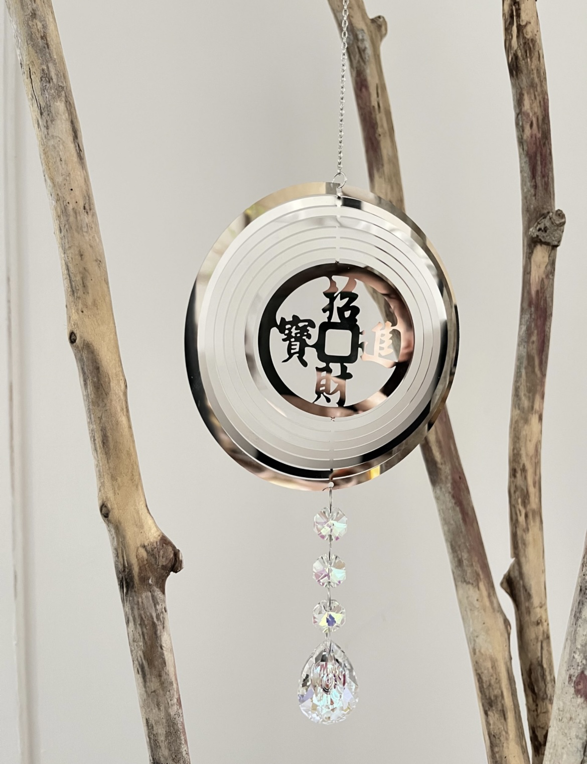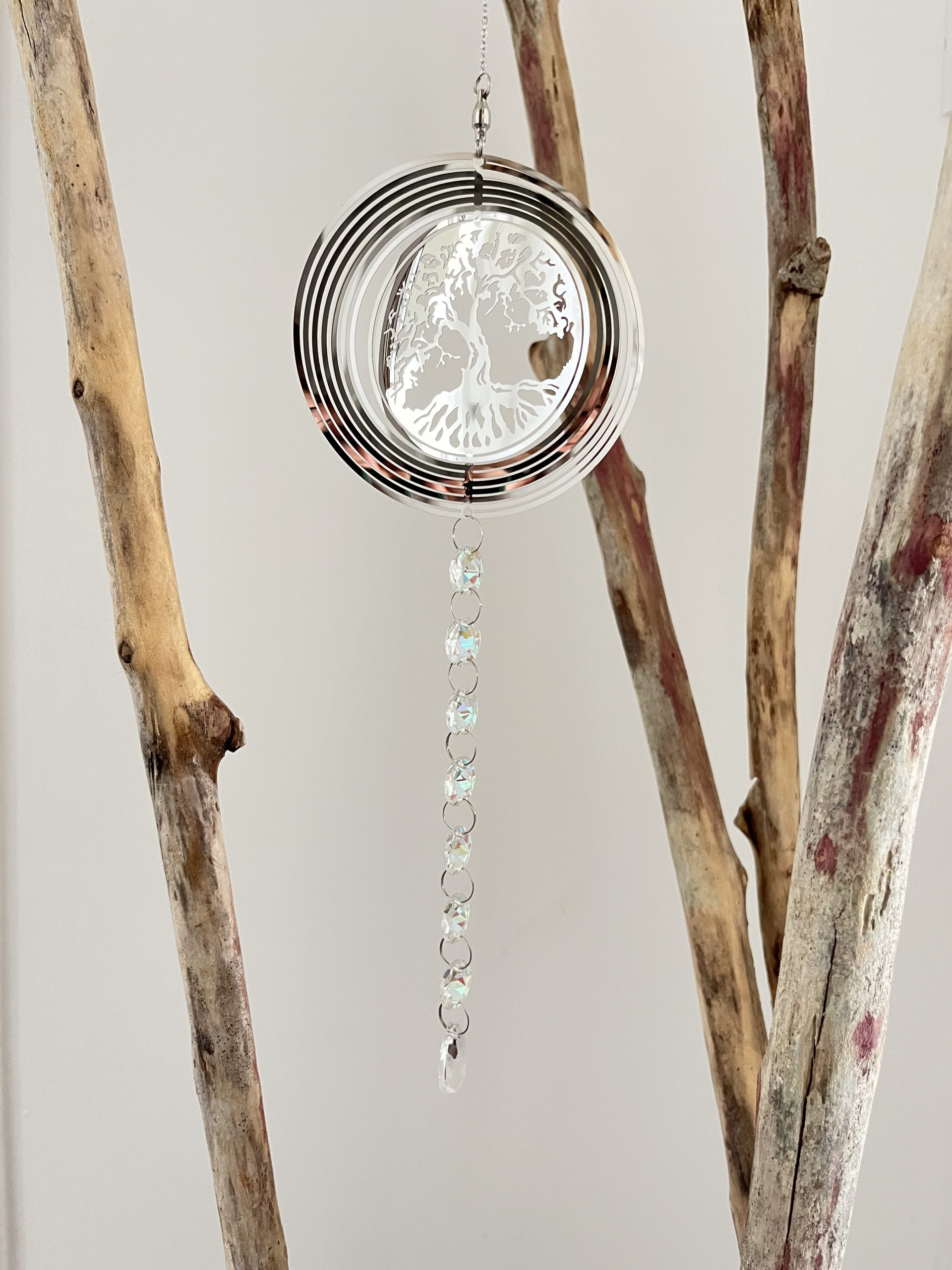 Apportez une touche de magie lumineuse à votre espace avec ce mobile 3D en acier inoxydable. Ses formes géométriques tournantes capturent la lumière tandis que le prisme suspendu diffuse des reflets arc-en-ciel apaisants. Parfait pour une véranda, une fenêtre ensoleillée ou un coin zen extérieur.