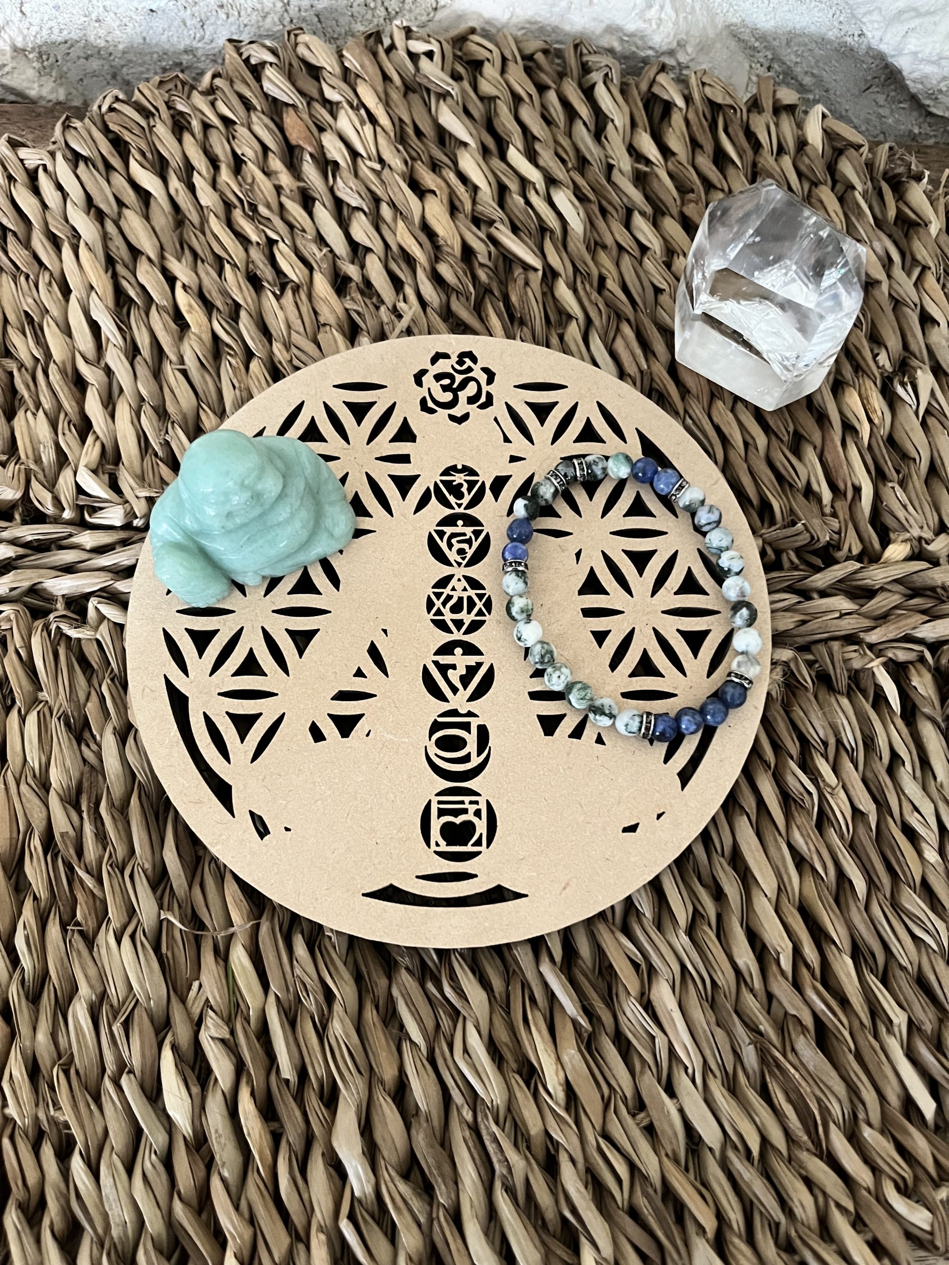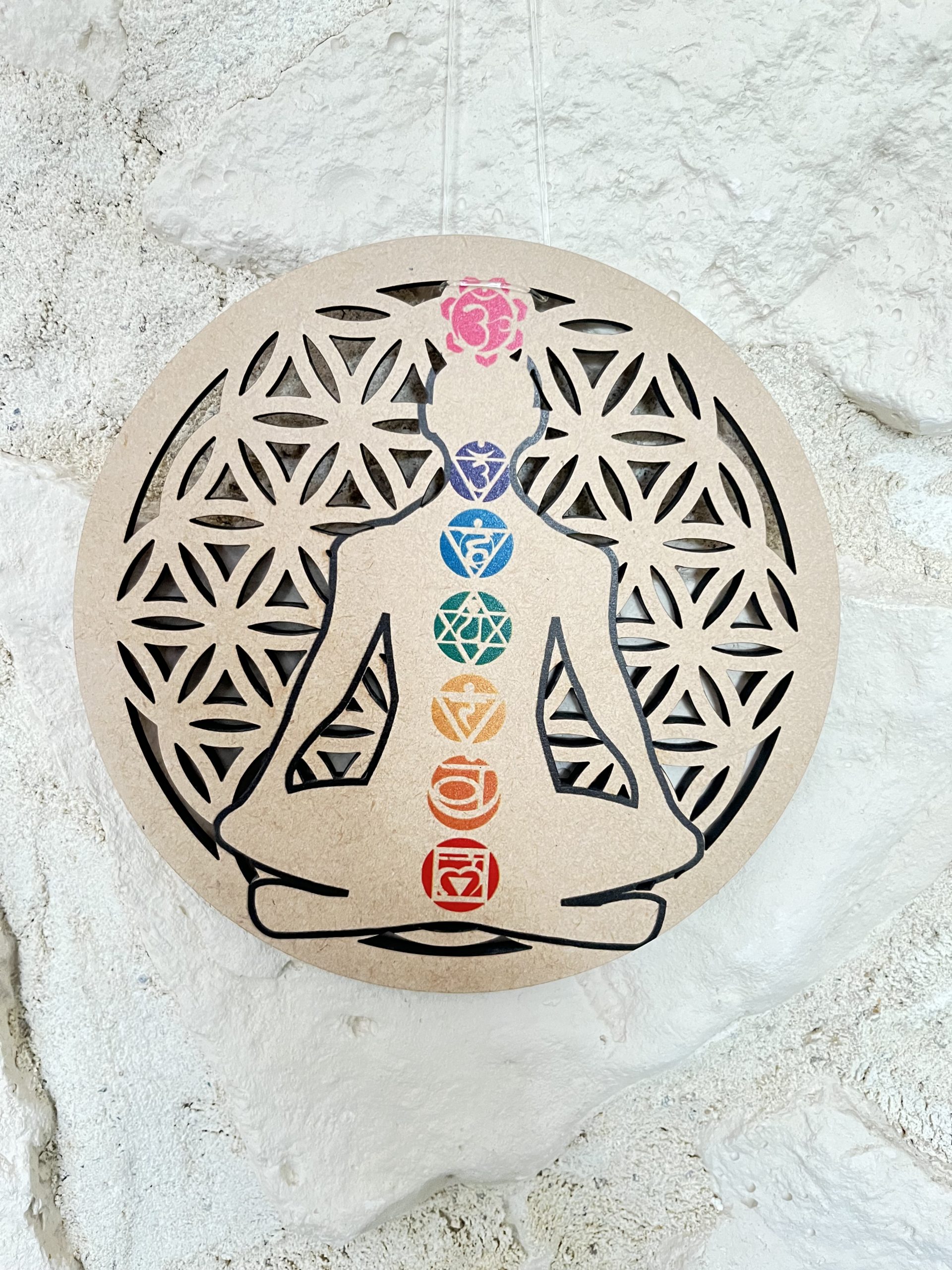 C : Plaque de rechargement en bois 7 chakras et fleur de vie 20 cm.