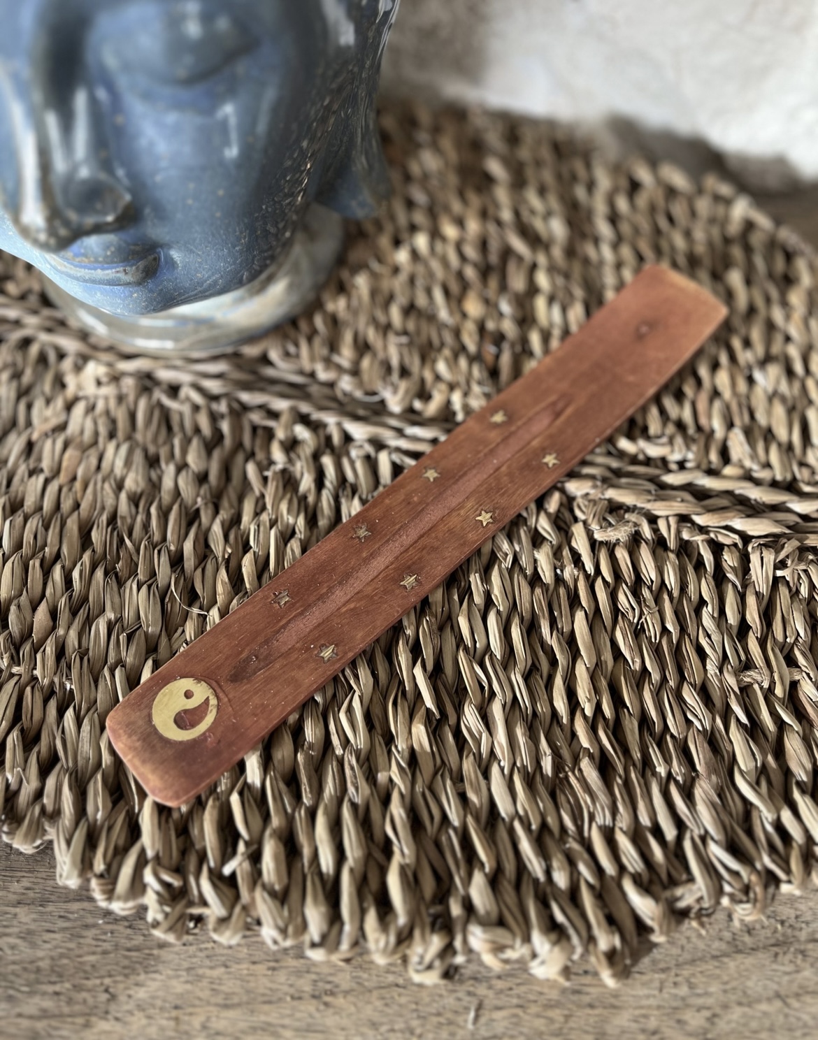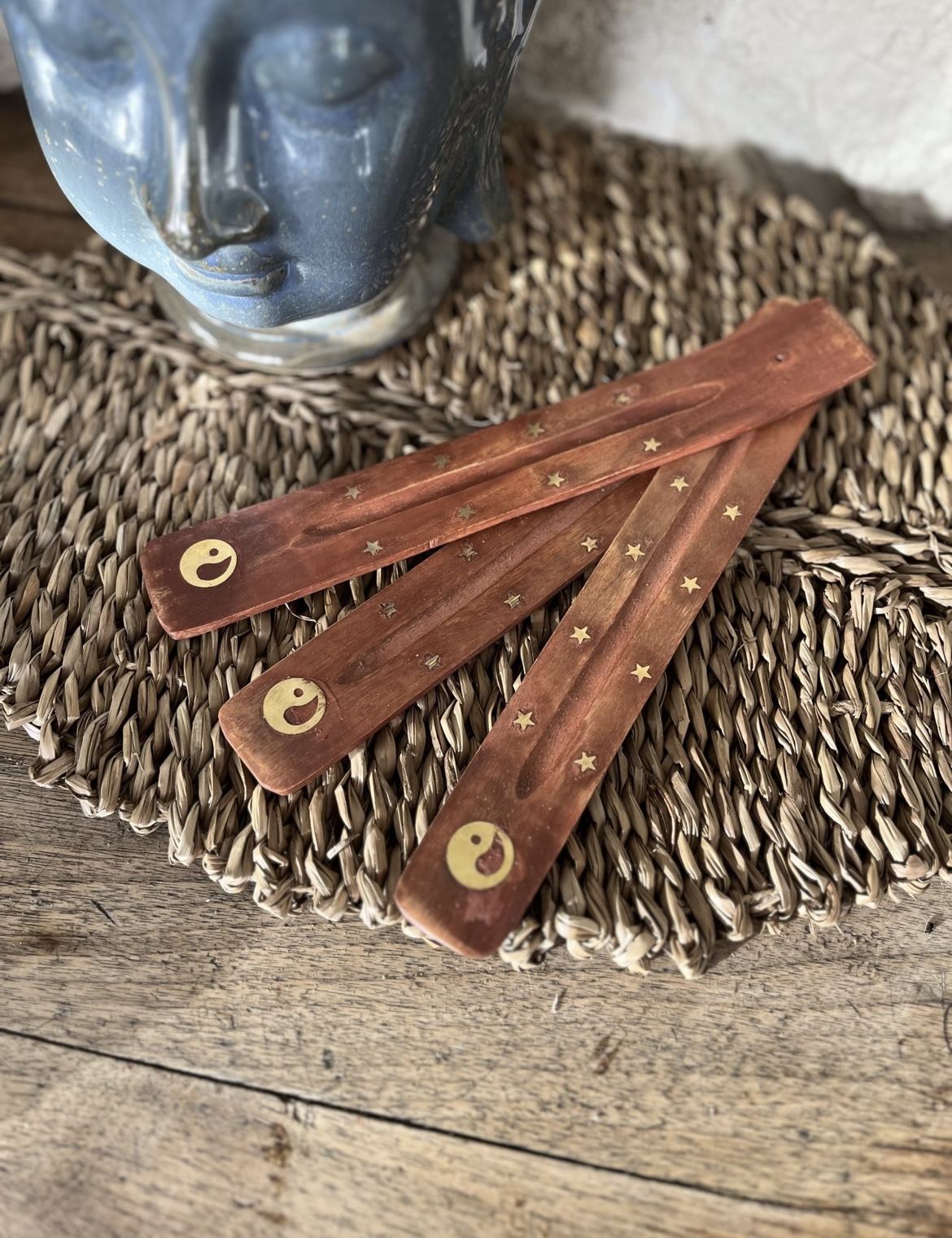 – Brûle  bâton d’encens, en bois avec insertion des symboles yin et yang. Longueur 25 cm.