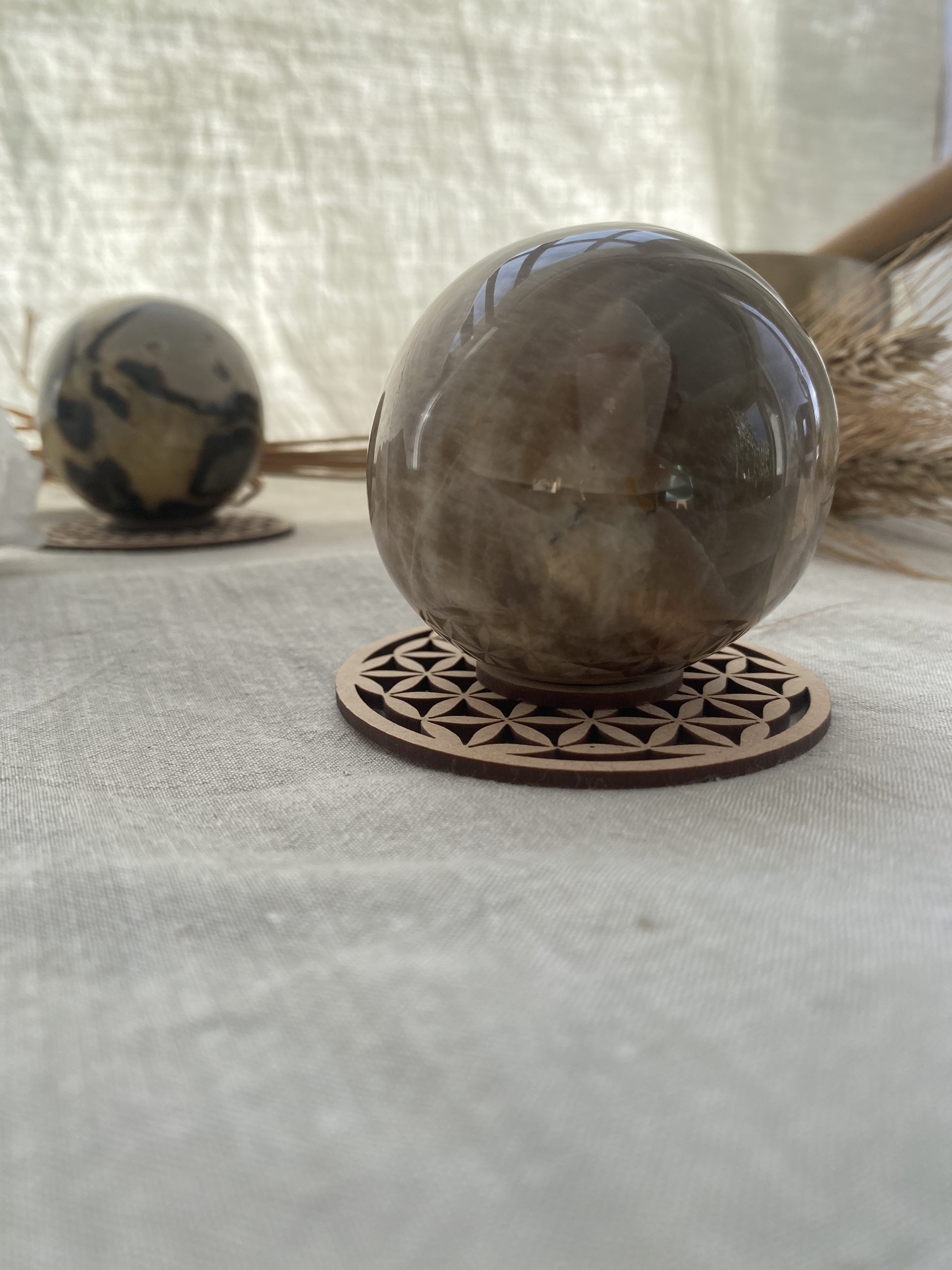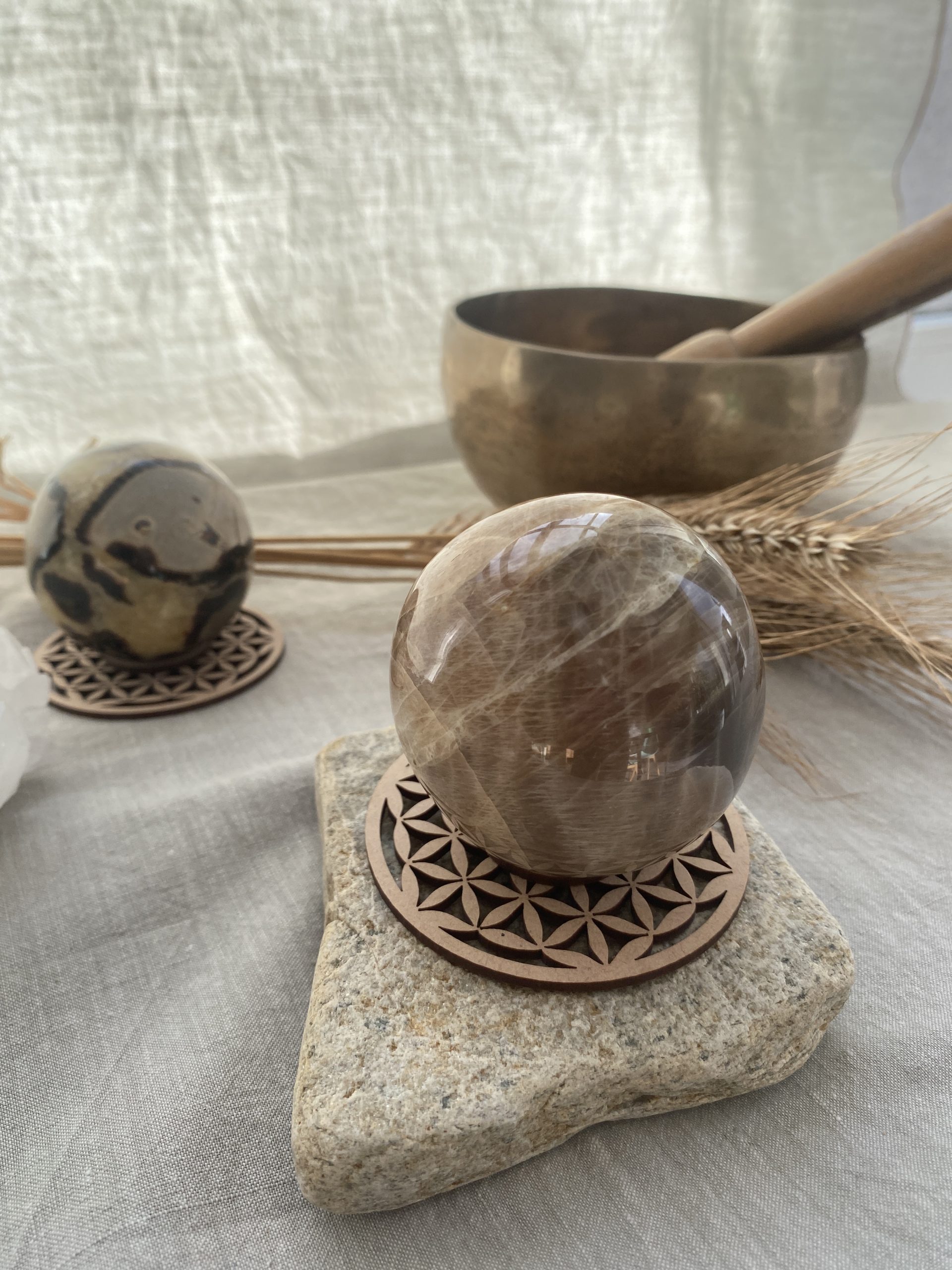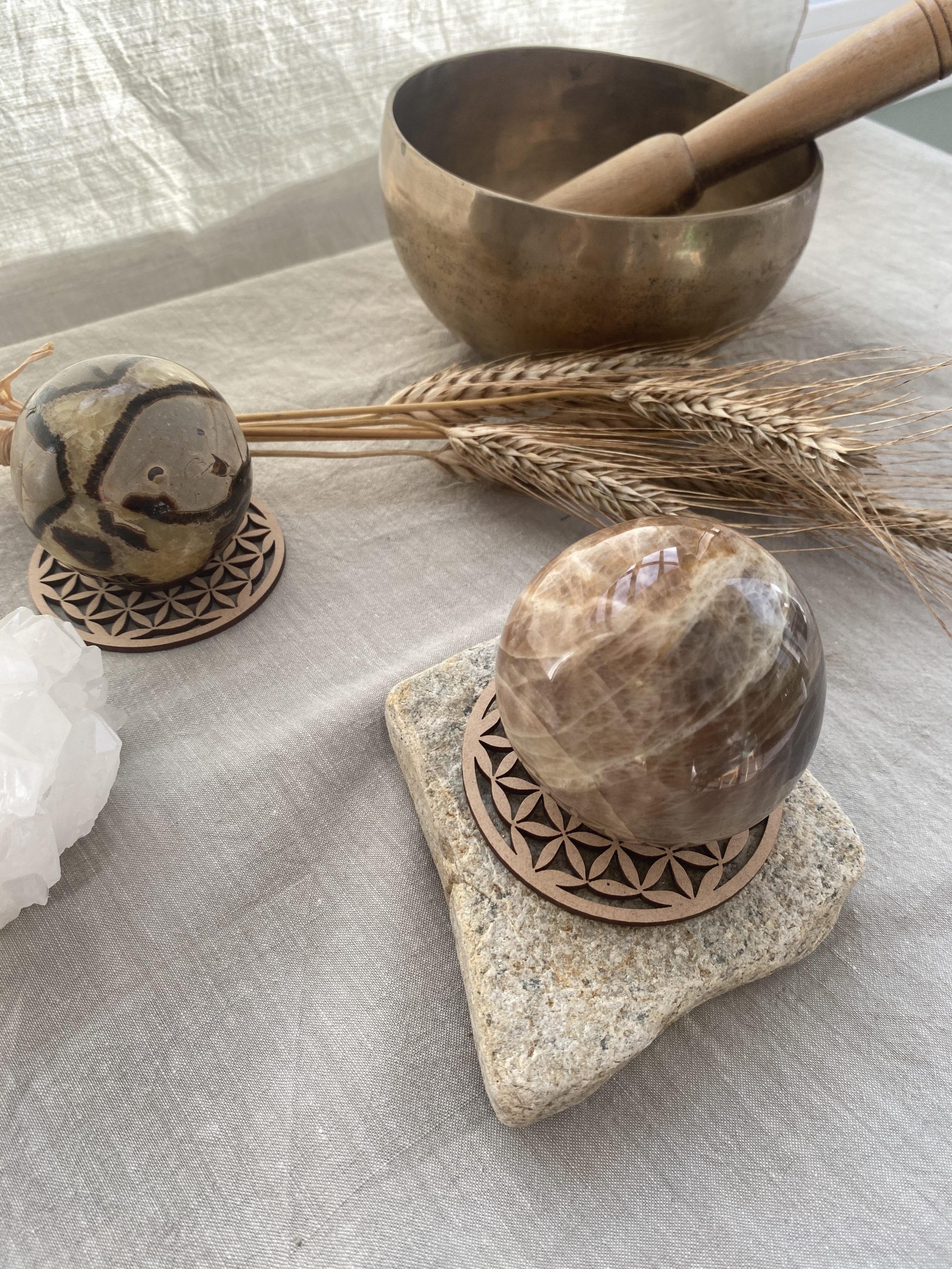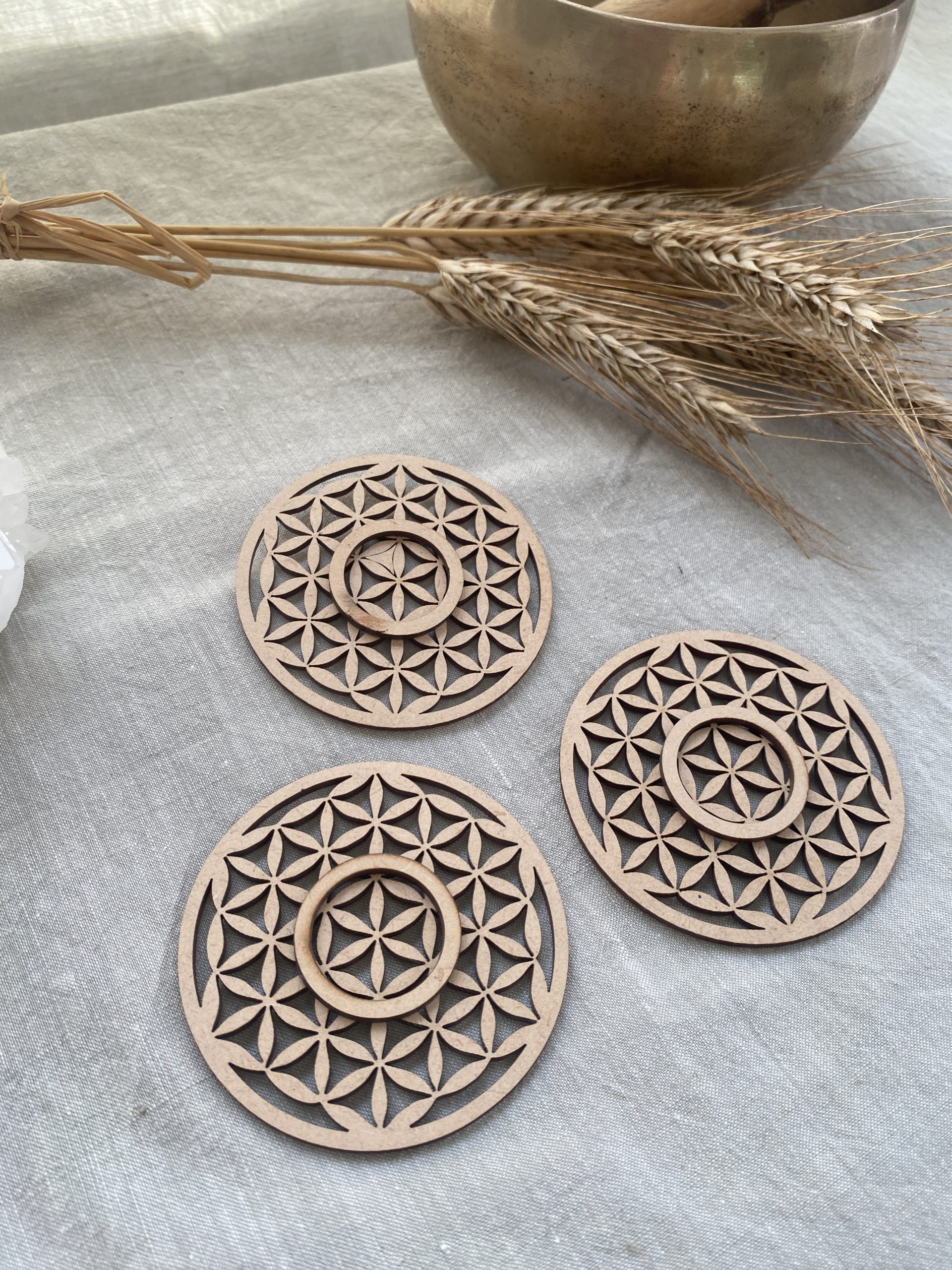 Support pour pierres précieuses découpé au laser dans du MDF (panneau composite en fibres de bois), en forme de Fleur de vie.